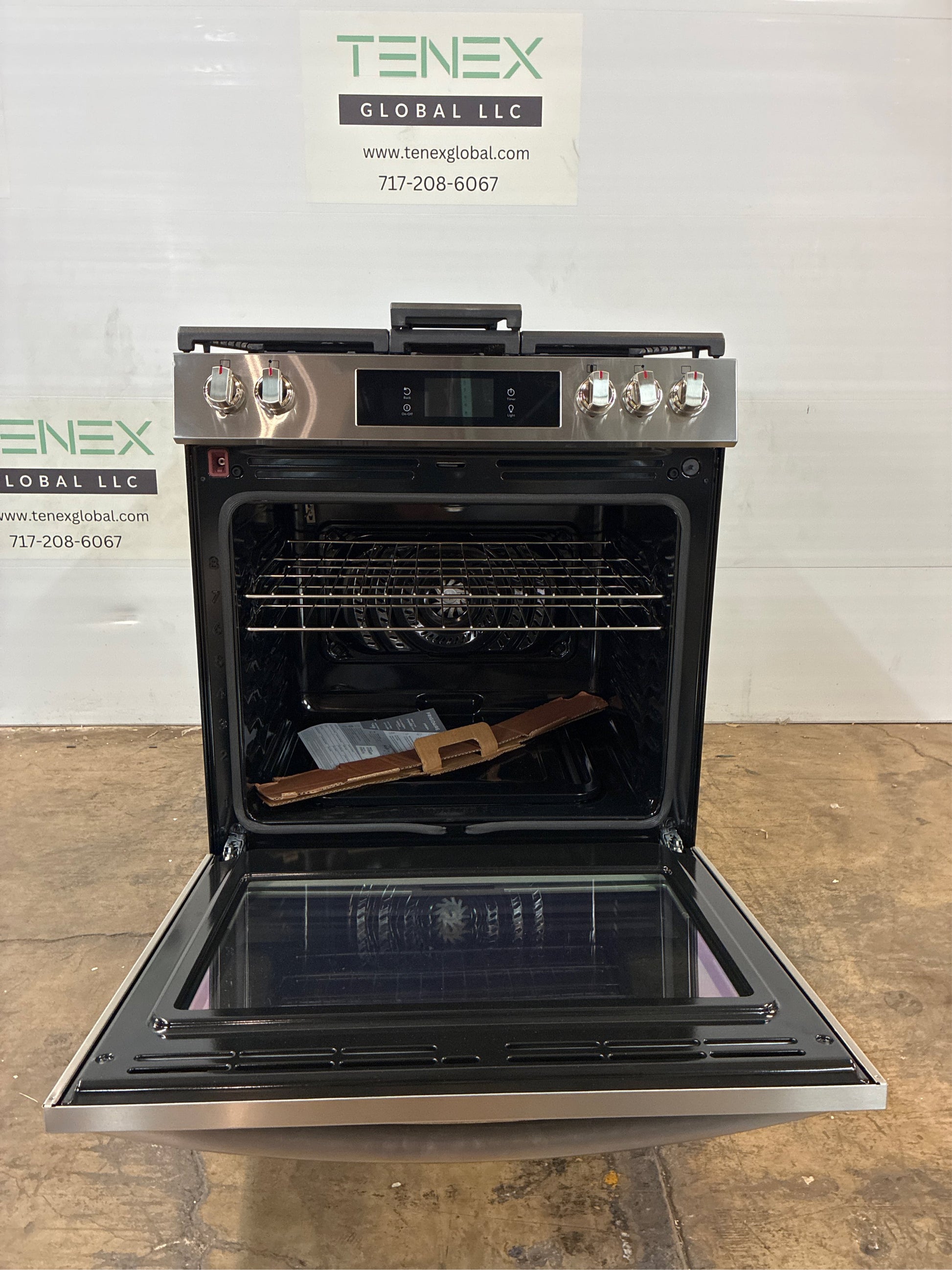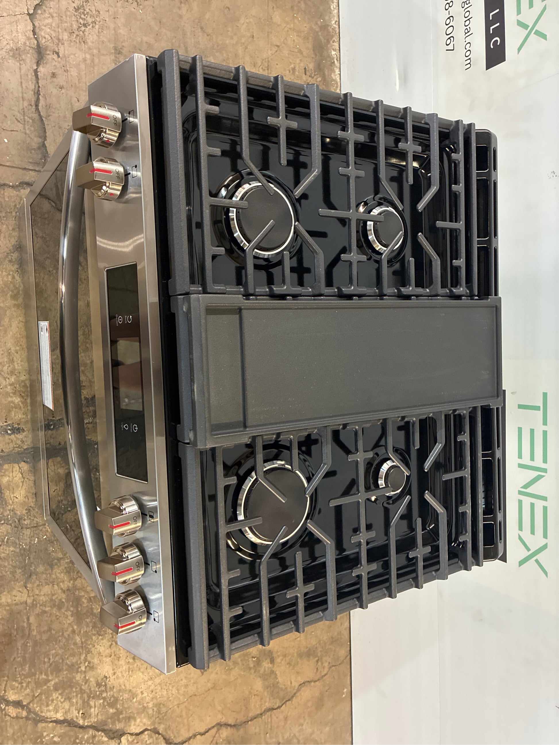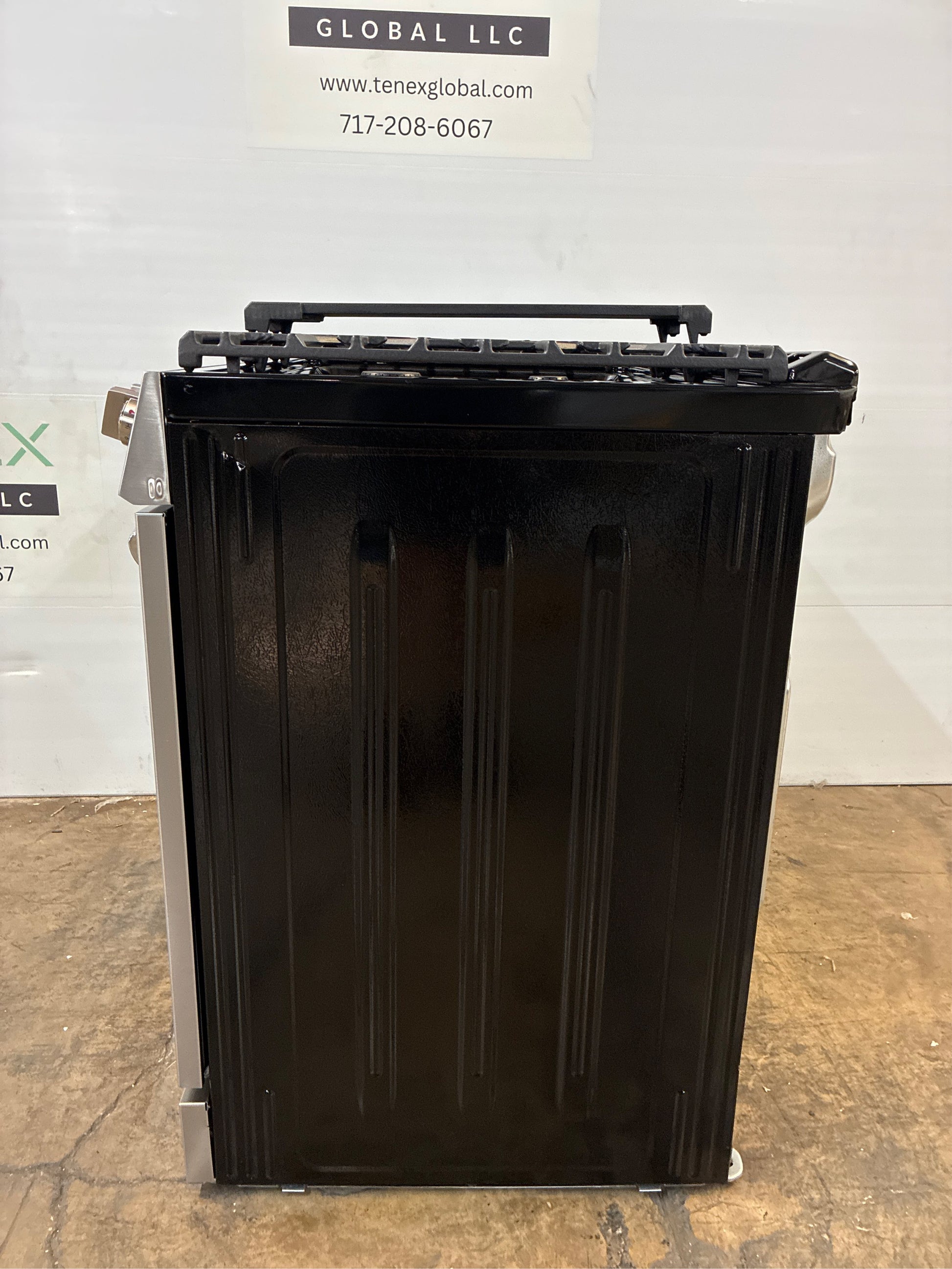 The FRIGIDAIRE GALLERY 30 in. Front Control Gas Range with Total Convection, features our most powerful and advanced convection system, which enables cooking modes like No Preheat, Air Fry, Slow Cook, Steam Bake, Steam Roast, Air Sous Vide, Convection Roast, Convection Bake, Bread Proof and more. The flexible five burner cooktop includes a powerful 18,000 BTU Quick Boil Burner and a center oval burner with an integrated cast iron griddle. This range also features backlit LED knobs, our premium touch screen digital control panel and our fingerprint resistant, Smudge-Proof finish.. Appliance Category: Range. Appliance Series: Frigidaire Gallery. Appliance Type: Gas Range. Burner Grate Material: Cast Iron. Burner No.1 BTU: 18000. Burner No.2 BTU: 5000. Burner No.3 BTU: 14000. Burner No.4 BTU: 10000. Burner No.5 BTU: 10000. Capacity of Oven (cu. ft.): 6 cu ft. Cleaning Type: Self Cleaning. Color of Cooktop: Black. Color/Finish: Smudge-Proof Stainless Steel. Color/Finish Family: Stainless Steel. Commercial/Residential: Residential. Control Type: Electro-Mechanical. Controls Location: Front Control. Cooktop Features: Bridge Element,Continuous Grates,Indicator Light- Heating Element On,LP Convertible,Melting Burner,Power Element,Sealed Burners,Smudge-Proof,Warming Zone,With Griddle. Cooktop Surface Type: Burner Grate. Drawer Type: Lower Storage Drawer. Fuel Type: Gas. Hardware Color/Finish: Stainless Steel. Hardware Color/Finish Family: Stainless Steel. Ignition Type: Electrical. Included: No Additional Items Included. Number of Burners: 5 burner. Number of Oven Racks: 2. Number of Rack Positions: 8. Oven Cleaning Options: Delay Clean,Self-Cleaning,Steam Clean. Oven Cooking Process: Air Fry,Air Sous Vide,Dehydrator Oven,Steam Oven,True Convection. Oven Features: Adjustable Leg Heights,Automatic Convection Conversion,Broiler in Oven,Delay Bake/Delay Start,Fingerprint Resistant,Oven Light,Oven Temperature Probe. Product Weight (lb.): 205 lb. Range Installation Type: Slide-In. Returnable: Non-Returnable. Certifications and Listings: CSA Listed. Depth With Door(s) Open 90 Degrees (in.): 47.3125 in. Oven Interior Depth (in): 19.875. Oven Interior Height (in): 20.6875. Oven Interior Width (in): 25.1875. Product Depth (in.): 26 in. Product Height (in.): 35.625 in. Product Width (in.): 30 in. Range Size (Width): 30 in.. Range Size (Width): 30 in.. Range Installation Type: Slide-In. No of Burners: 5 burner. Capacity (cu. ft.): 6 cu ft.. Capacity (cu. ft.): 6 cu ft. Cleaning Type: Self Cleaning. Oven Cooking Process: Air Fry. Drawer Type: Lower Storage Drawer