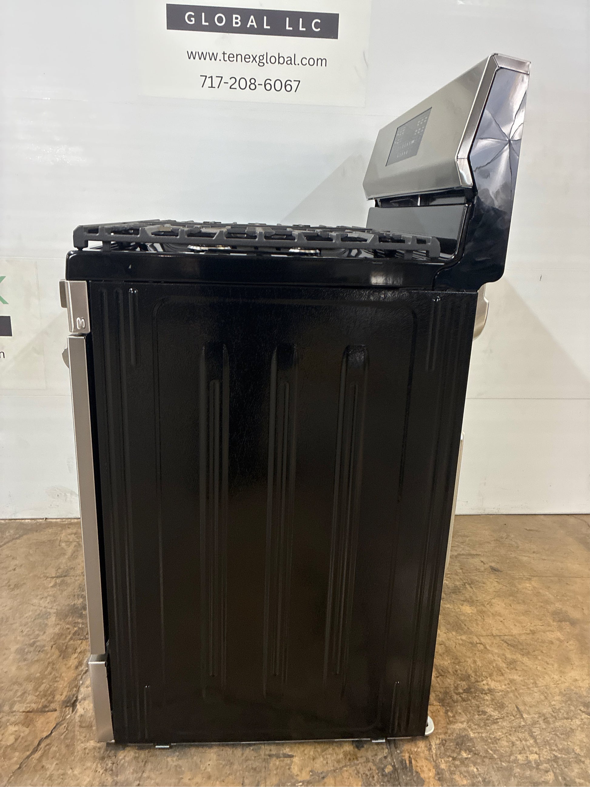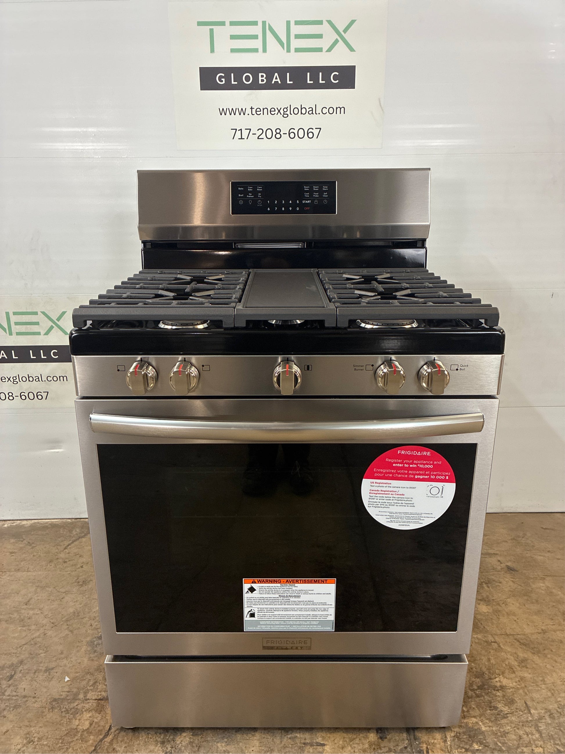 The Frigidaire Gallery 30 Rear Control Gas Range features our most powerful and advanced convection system, Total Convection, enabling so many cooking modes like No Preheat, Air Fry, Slow Cook, Steam Bake, Steam Roast, Air Sous Vide, Convection Roast, Convection Bake and more! The flexible five burner cooktop includes a powerful 18,000 BTU Quick Boil Burner and a center oval burner with an integrated cast iron griddle. Also includes our fingerprint resistant, Smudge-Proof Stainless Steel finish. Slow Cook, Steam Bake plus more, powered by Total Convection. Skip preheating and start baking immediately with No Preheat. Air Fry allows you to make healthier and delicious meals for the entire family, right in your oven - don't forget to add-on the Frigidaire ReadyCook air fry tray (model FRIGPEREAFT sold separately). With Slow Cook, your food cooks slowly and at a lower temperature (as low as 100 F), allowing you to lock in moisture and flavor without over or undercooking your food. This cooktop has five burners designed to handle all of your cooking needs, including a powerful 18,000 BTU Quick Boil Burner and a center oval burner with an integrated cast iron griddle. The Temperature Probe monitors and alerts when the desired finished cooking temperature has been reached. With Steam Bake, steam evenly circulates throughout the oven cavity, resulting in breads and muffins that rise higher and are light and fluffy. Enjoy more cleaning flexibility, select Steam Clean for a quick, 30 minute clean or choose Self Clean, which is available in 2, 3 and 4 hour cycles. Steam Roast uses moisture to make perfectly crispy and tender meats and vegetables that are roasted to perfection. Appliance Color/Finish: Stainless steel. Handle Color: Stainless steel. Manufacturer Color/Finish: Fingerprint Resistant Stainless Steel. Sub-Brand: Gallery. Type: Freestanding. Adjustable Height: Yes. Capacity (Cu. Feet): 5.1. Cutout Depth (Inches): 26. Cutout Height (Inches): 45. Cutout Width (Inches): 30. Depth (Inches): 26. Maximum Assembled Height (Inches): 47.75. Minimum Assembled Height (Inches): 46.75. Popular Widths: 30-in. Range Size (Inches): 30. Usable Oven Interior (H x W x D): 17.625 x 25.187 x 19.875. Width (Inches): 30. ADA Compliant: No. Adjustable Cleaning Levels: Yes. Air Fry: Yes. Appliance Type: Single oven gas range. Auto Re-Ignition: Yes. Automatic Convection Conversion: Yes. Automatic Shut-Off: Yes. Broiler Drawer: No. Burner #1 Max BTU: 18000. Burner #2 Max BTU: 5000. Burner #3 Max BTU: 14000. Burner #4 Max BTU: 10000. Burner #5 Max BTU: 10000. Burner #6 Max BTU: 0. Burner Grate Material: Matte cast iron. Cleaning Method: Self-cleaning and steam cleaning. Continuous Grates: Yes. Control Location: Behind elements. Control Lockout: Yes. Convection Element Type: Single-fan European element. Convection Oven: Yes. Cooking Surface Control Type: Knobs. Cooking Surface Type: Standard. Customizable: No. Delay Bake: Yes. Digital Display: Yes. Dishwasher-Safe Grates: No. Door Lock: Yes. Downdraft Exhaust: No. Drip Pans: No. Dual/Tri-Ring Burner(s): No. Favorite Setting: No. Fingerprint-Resistant: Yes. Food Temperature Probe: Yes. Fuel Type: Natural gas. Glide/Rollout Racks: No. Half/Split Rack: No. Hot Surface Indicator Lights: No. Hub Required: No. Ignition Type: Electronic. Installation Type: Freestanding. Integrated Griddle: Yes (Included). Interior Light(s) Type: Halogen. Keep Warm Setting: Yes. Light(s) Control: Oven light touch pad. Lowe's Exclusive: No. LP Conversion Kit Included: No. LP Convertible: Yes. Modular Design: No. Number of Cooking Zones: 5 burners. Number of Oven Rack Positions: 6. Number of Racks: 2. Oval Burner: No. Oven Control Type: Electronic. Power Burner (15,000 BTU+): Yes. Power Cord Included: Yes. Power Source: Plug-in. Professional: No. Rapid Preheat: Yes. Removable Washable Trays: No. Sabbath Mode: No. Sealed Burners: Yes. Self-Cleaning Oven Racks: No. Simmer Burner: Yes. Single/Double Oven: Single. Steam Cook: No. Temperature-Sensor Baking: No. Time Bake: Yes. Voice Controlled: No. Warming Drawer: No. Wok Grate Included: No. App Compatibility: No. Bluetooth Compatibility: No. Matching Electric (Model #): GCRE3060BF. Matching Newer (Model #): GCRG3060BD. Matching Previous (Model #): GCRG3060AF. Smart Compatible: No. Wi-Fi Compatibility: No. Works with Amazon Alexa: No. Works with Android: No. Works with Apple HomeKit: No. Works with iOS: No. Works with SmartThings: No. Works with Sonos: No. Works with the Google Assistant: No. CA Residents: Prop 65 Warning(s): Yes. ENERGY STAR Certified: No. Safety Listing: CSA safety listing. UNSPSC: 52141500.