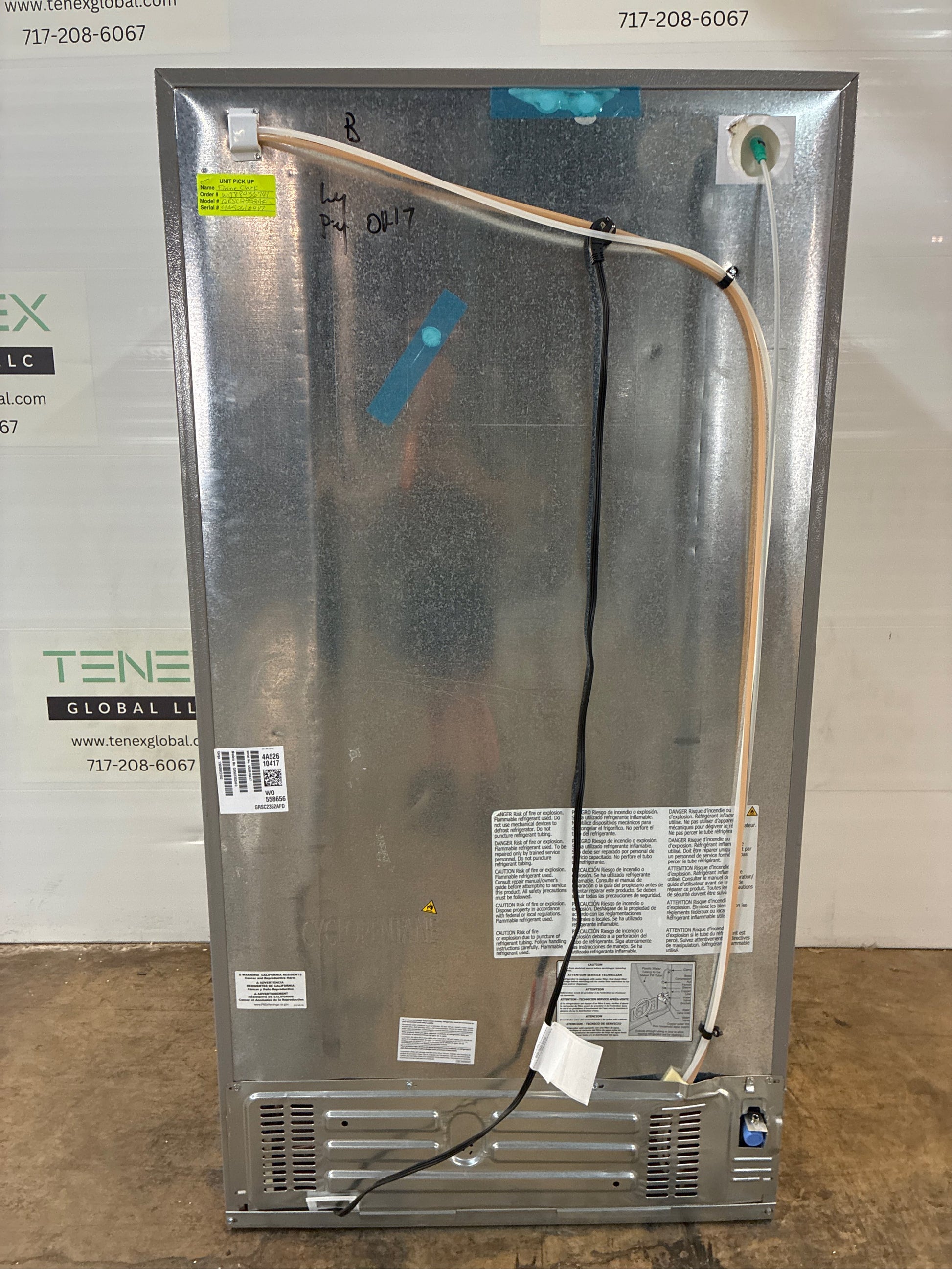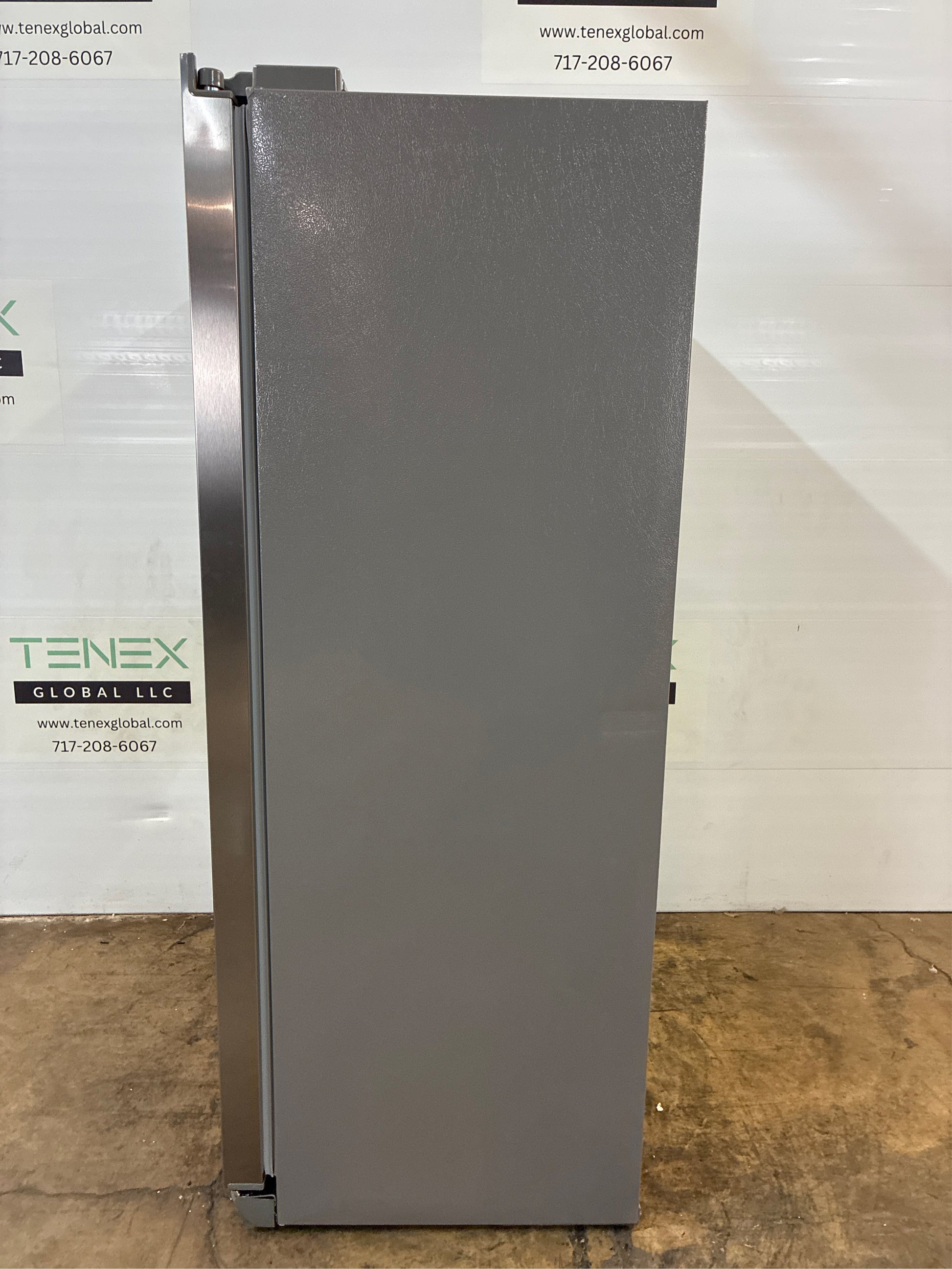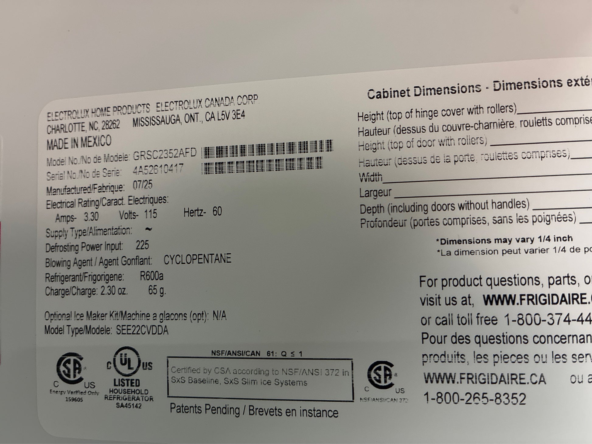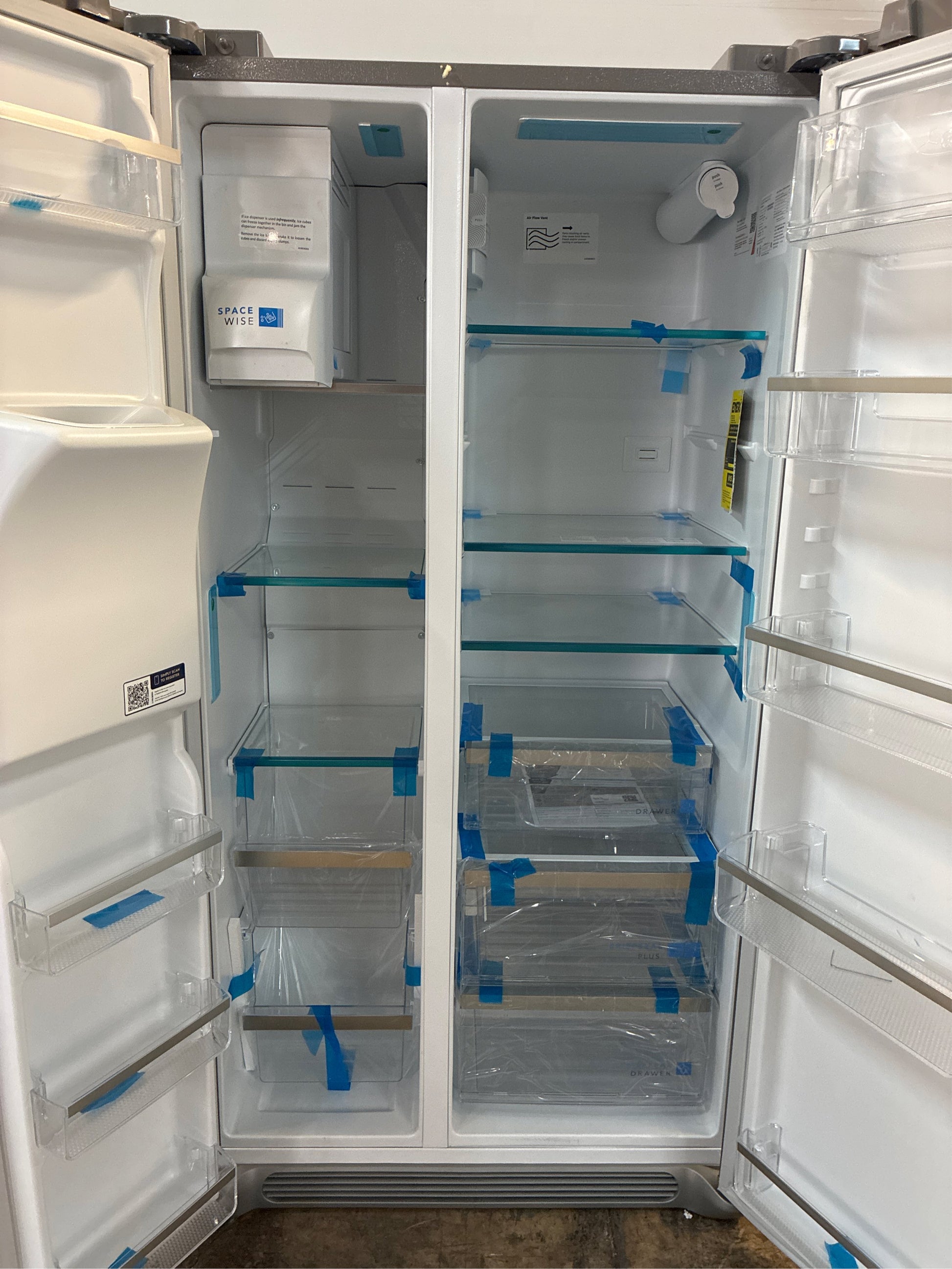 This Frigidaire Gallery 36 Counter-Depth Side-by-side refrigerator offers our advanced CrispSeal Plus Crisper. This crisper keeps produce fresh with a seal that blocks out dry air, plus an added filter reduces the gas that causes produce to ripen faster. It also features our EvenTemp Cooling System which keeps your food fresh by reacting quickly to temperature fluctuations and constantly circulates cold air throughout the fresh food and freezer compartments, ensuring a consistent cool from top to bottom.. Appliance Category: Refrigerator. Appliance Series: Frigidaire Gallery. Appliance Type: Side-by-Side Refrigerator. Built-In and Standard Type: Side-by-Side. Color - Appliance Cabinet: Stainless. Color - Door Handle(s): Stainless Steel. Color/Finish: Smudge-Proof Stainless Steel. Color/Finish Family: Stainless Steel. Defrost Type: Auto / Cycle. Dispenser Location: External Ice Dispenser,External Water Dispenser. Door Finish: Smooth. Energy Consumption (kWh/year): 673. Energy Efficiency Tier Rating: Not CEE rated. Freezer Capacity (cu. ft.): 8 cu ft. Freezer Door Type: Swing Door. Freezer Features: In-door Storage,LED Light Type. Freezer Type: Side Door Freezer. General Features: Hidden Hinge,LED Light Type,Smudge-Proof. Handle Type: Bar Handle. Hardware Color/Finish: Stainless Steel. Hardware Color/Finish Family: Stainless Steel. Ice Maker Features: Automatic Ice Level Control/Shutoff,Ice Maker,Removable Basket. Ice/Water Dispenser: Both. Indoor/Outdoor: Indoor. Installation Depth: Counter Depth. Installation Type: Free Standing. Number of Doors: 2 Door. Number of Freezer Baskets/Bins: 6 Baskets/Bins. Number of Freezer Shelves: 2 Shelves. Number of Refrigerator Shelves: 3 Shelves. Operational Features: Fresh Air Filter,Humidity Controlled Crisper,Sabbath Mode. Overall Product Height (in.): 70 in. Product Weight (lb.): 308.75 lb. Refrigeration Dispenser Features: Crushed Ice,Cubed Ice,Dispenser Control Lock-Out,Filtration Replacement Indicator Light,Water Dispenser,Water Filtration. Refrigerator Capacity (cu. ft.): 14.3 cu ft. Returnable: Non-Returnable. Shelf Material - Freezer: Glass. Shelf Material - Refrigerator: Glass. Storage Features: Adjustable Door Storage,Crisper Drawer,Deli Drawer,Gallon Door Storage,Slide-Out Fresh Food Shelves,Spill Proof Shelves. Temperature Control Type: External Digital. Total Capacity (cu. ft.): 22.3 cu ft. Water Filter Replacement Model#: FPPWFU01. Certifications and Listings: ADA Compliant. Depth (Excluding Handles) (in.): 28.5 in. Depth (Including Handles) (in.): 31 in. Depth (Less Door) (in.): 23.875 in. Depth With Door Open 90 Degrees (in.): 45. Height to Top of Door Hinge (in.): 69.875 in. Height to Top of Refrigerator Case (in.): 68.625 in. Height to Top of Refrigerator Door (in.): 69.875 in. Product Depth (in.): 31 in. Product Height (in.): 69.875 in. Product Width (in.): 36.125 in. Refrigerator Width (in.): 36.125 in. Overall Product Height (in.): 70 in. Installation Depth: Counter Depth. Depth (Excluding Handles) (in.): 28.5 in. Total Capacity (cu. ft.): 22.3 cu ft. Dispenser Features: Water Dispenser. Dispenser Features: Cubed Ice. Dispenser Features: Crushed Ice. Dispenser Features: Water Filtration