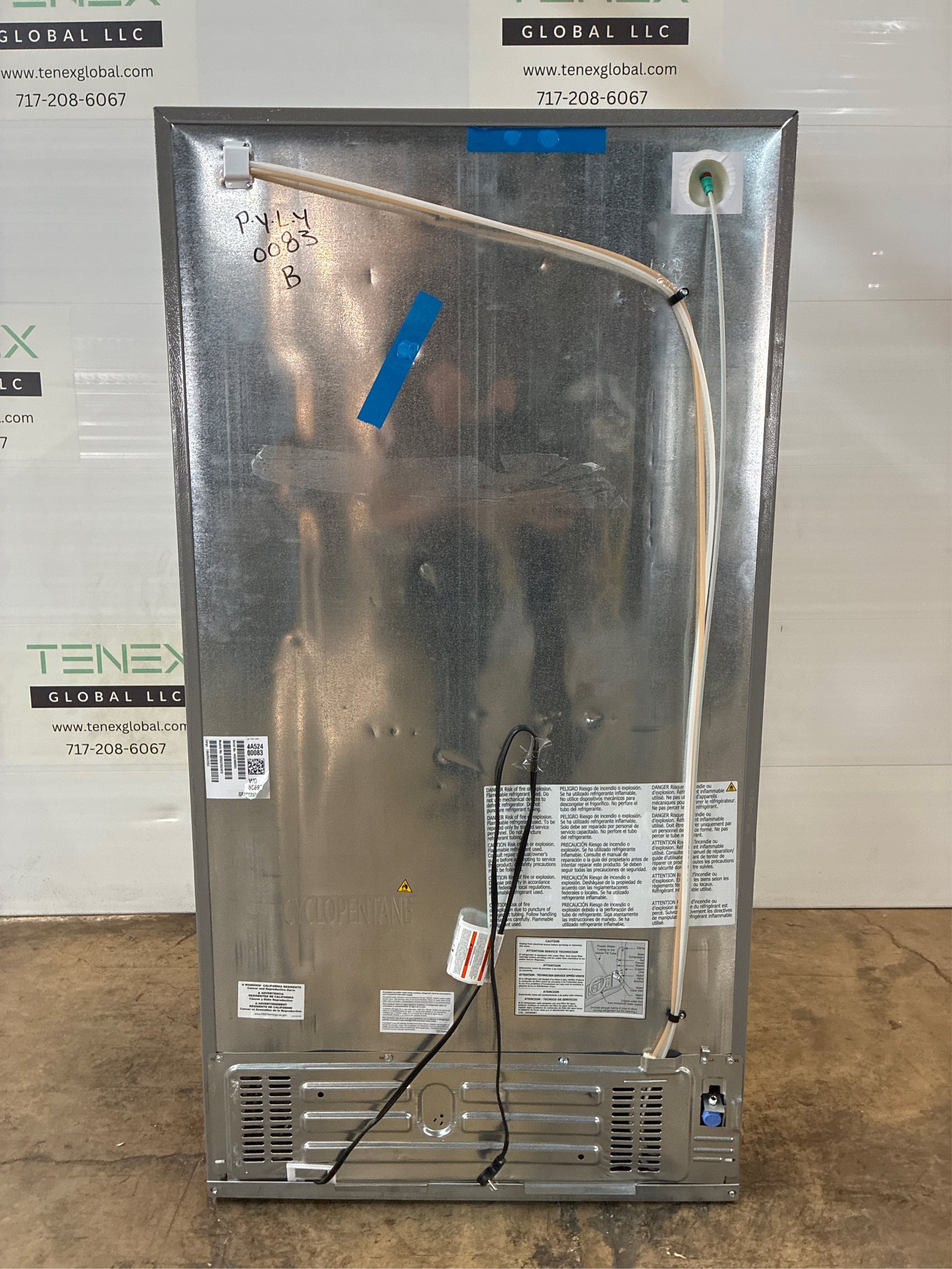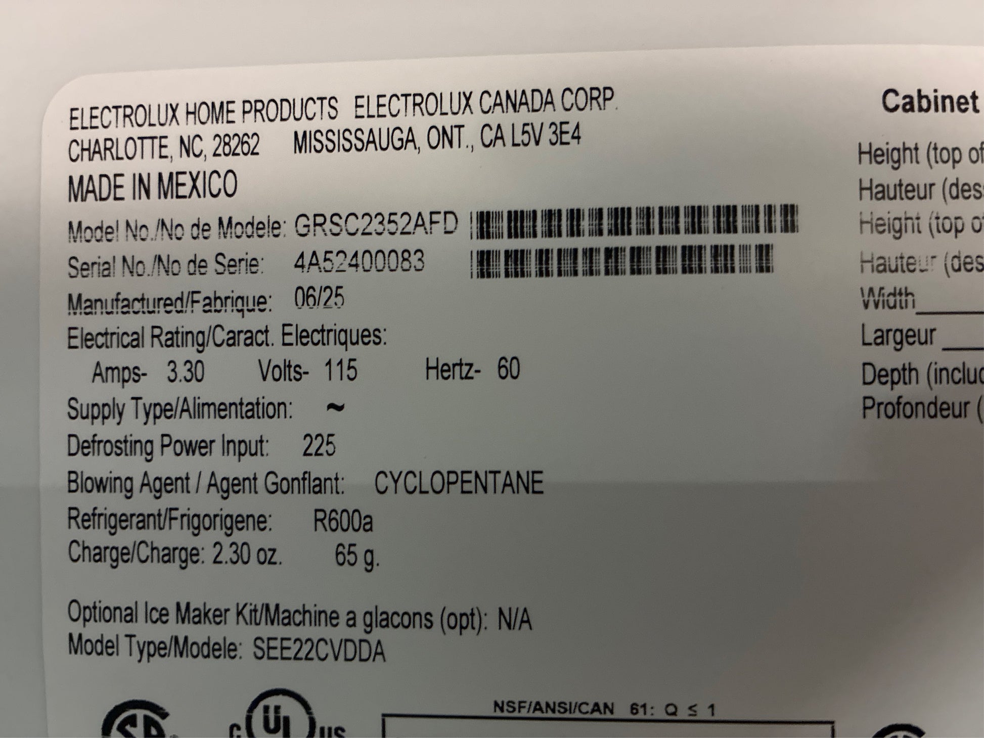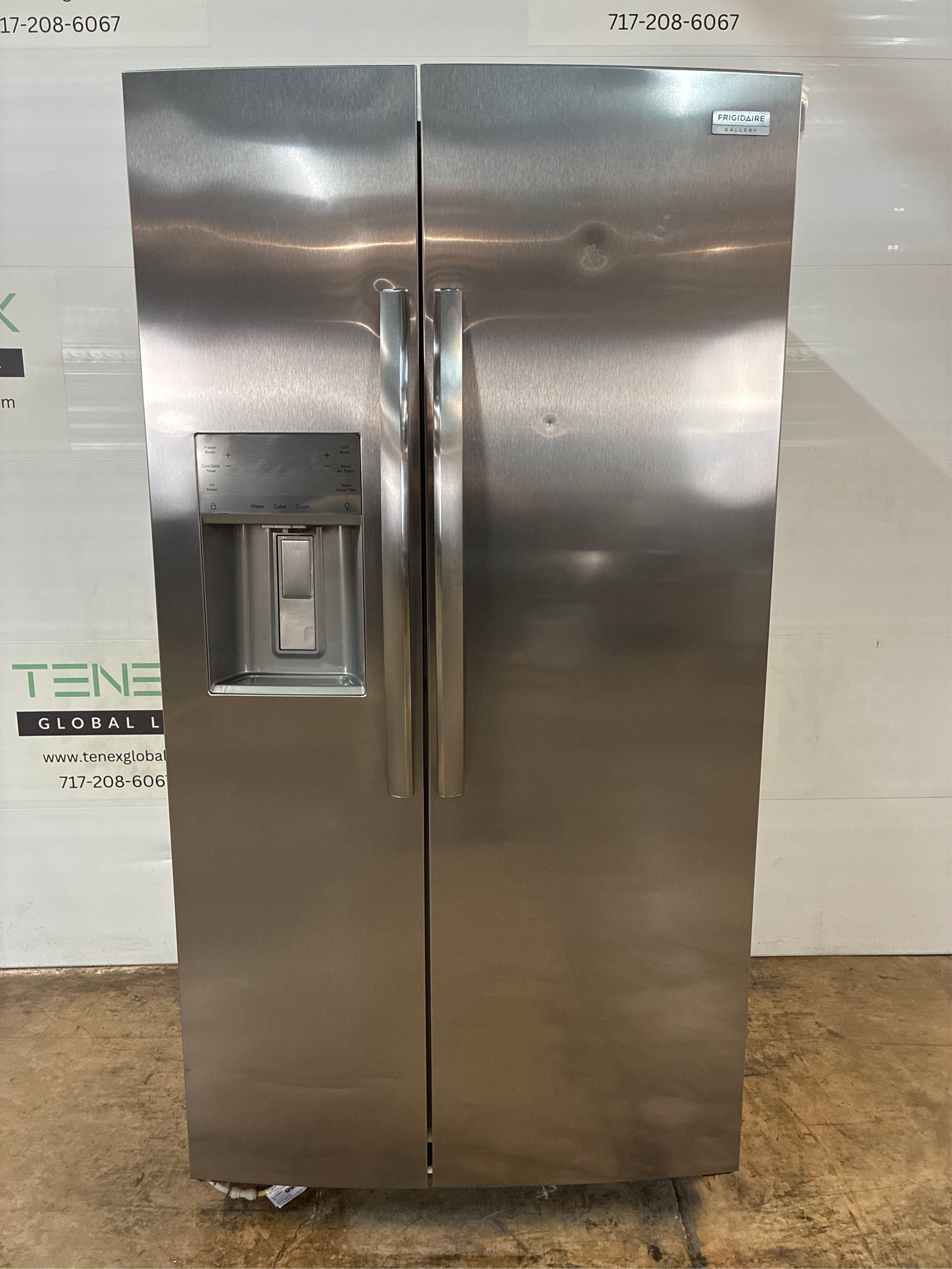 This Frigidaire Gallery 36 Counter-Depth Side-by-side refrigerator offers our advanced CrispSeal Plus Crisper. This crisper keeps produce fresh with a seal that blocks out dry air, plus an added filter reduces the gas that causes produce to ripen faster. It also features our EvenTemp Cooling System which keeps your food fresh by reacting quickly to temperature fluctuations and constantly circulates cold air throughout the fresh food and freezer compartments, ensuring a consistent cool from top to bottom.. Appliance Category: Refrigerator. Appliance Series: Frigidaire Gallery. Appliance Type: Side-by-Side Refrigerator. Built-In and Standard Type: Side-by-Side. Color - Appliance Cabinet: Stainless. Color - Door Handle(s): Stainless Steel. Color/Finish: Smudge-Proof Stainless Steel. Color/Finish Family: Stainless Steel. Defrost Type: Auto / Cycle. Dispenser Location: External Ice Dispenser,External Water Dispenser. Door Finish: Smooth. Energy Consumption (kWh/year): 673. Energy Efficiency Tier Rating: Not CEE rated. Freezer Capacity (cu. ft.): 8 cu ft. Freezer Door Type: Swing Door. Freezer Features: In-door Storage,LED Light Type. Freezer Type: Side Door Freezer. General Features: Hidden Hinge,LED Light Type,Smudge-Proof. Handle Type: Bar Handle. Hardware Color/Finish: Stainless Steel. Hardware Color/Finish Family: Stainless Steel. Ice Maker Features: Automatic Ice Level Control/Shutoff,Ice Maker,Removable Basket. Ice/Water Dispenser: Both. Indoor/Outdoor: Indoor. Installation Depth: Counter Depth. Installation Type: Free Standing. Number of Doors: 2 Door. Number of Freezer Baskets/Bins: 6 Baskets/Bins. Number of Freezer Shelves: 2 Shelves. Number of Refrigerator Shelves: 3 Shelves. Operational Features: Fresh Air Filter,Humidity Controlled Crisper,Sabbath Mode. Overall Product Height (in.): 70 in. Product Weight (lb.): 308.75 lb. Refrigeration Dispenser Features: Crushed Ice,Cubed Ice,Dispenser Control Lock-Out,Filtration Replacement Indicator Light,Water Dispenser,Water Filtration. Refrigerator Capacity (cu. ft.): 14.3 cu ft. Returnable: Non-Returnable. Shelf Material - Freezer: Glass. Shelf Material - Refrigerator: Glass. Storage Features: Adjustable Door Storage,Crisper Drawer,Deli Drawer,Gallon Door Storage,Slide-Out Fresh Food Shelves,Spill Proof Shelves. Temperature Control Type: External Digital. Total Capacity (cu. ft.): 22.3 cu ft. Water Filter Replacement Model#: FPPWFU01. Certifications and Listings: ADA Compliant. Depth (Excluding Handles) (in.): 28.5 in. Depth (Including Handles) (in.): 31 in. Depth (Less Door) (in.): 23.875 in. Depth With Door Open 90 Degrees (in.): 45. Height to Top of Door Hinge (in.): 69.875 in. Height to Top of Refrigerator Case (in.): 68.625 in. Height to Top of Refrigerator Door (in.): 69.875 in. Product Depth (in.): 31 in. Product Height (in.): 69.875 in. Product Width (in.): 36.125 in. Refrigerator Width (in.): 36.125 in. Overall Product Height (in.): 70 in. Installation Depth: Counter Depth. Depth (Excluding Handles) (in.): 28.5 in. Total Capacity (cu. ft.): 22.3 cu ft. Dispenser Features: Water Dispenser. Dispenser Features: Cubed Ice. Dispenser Features: Crushed Ice. Dispenser Features: Water Filtration