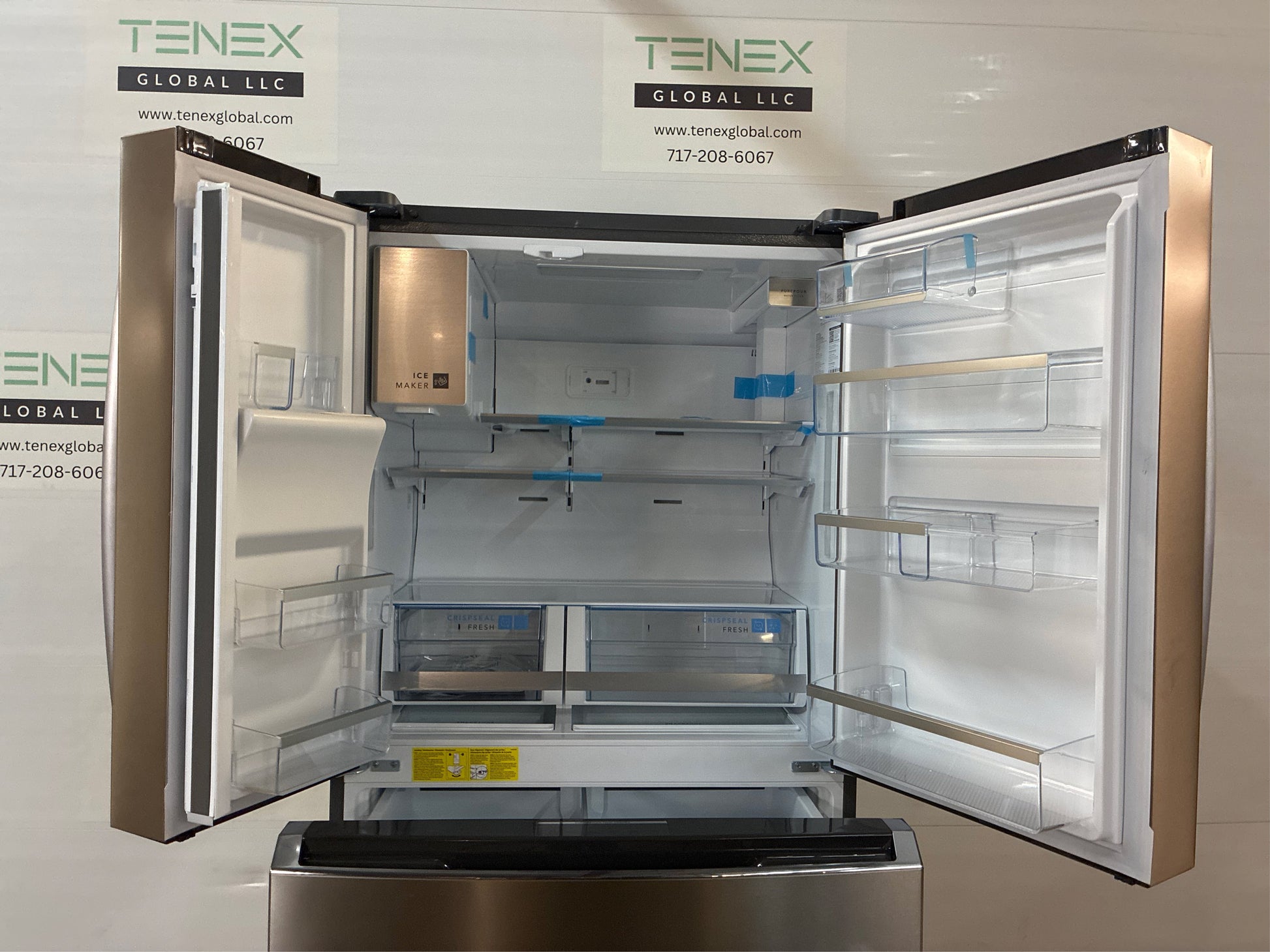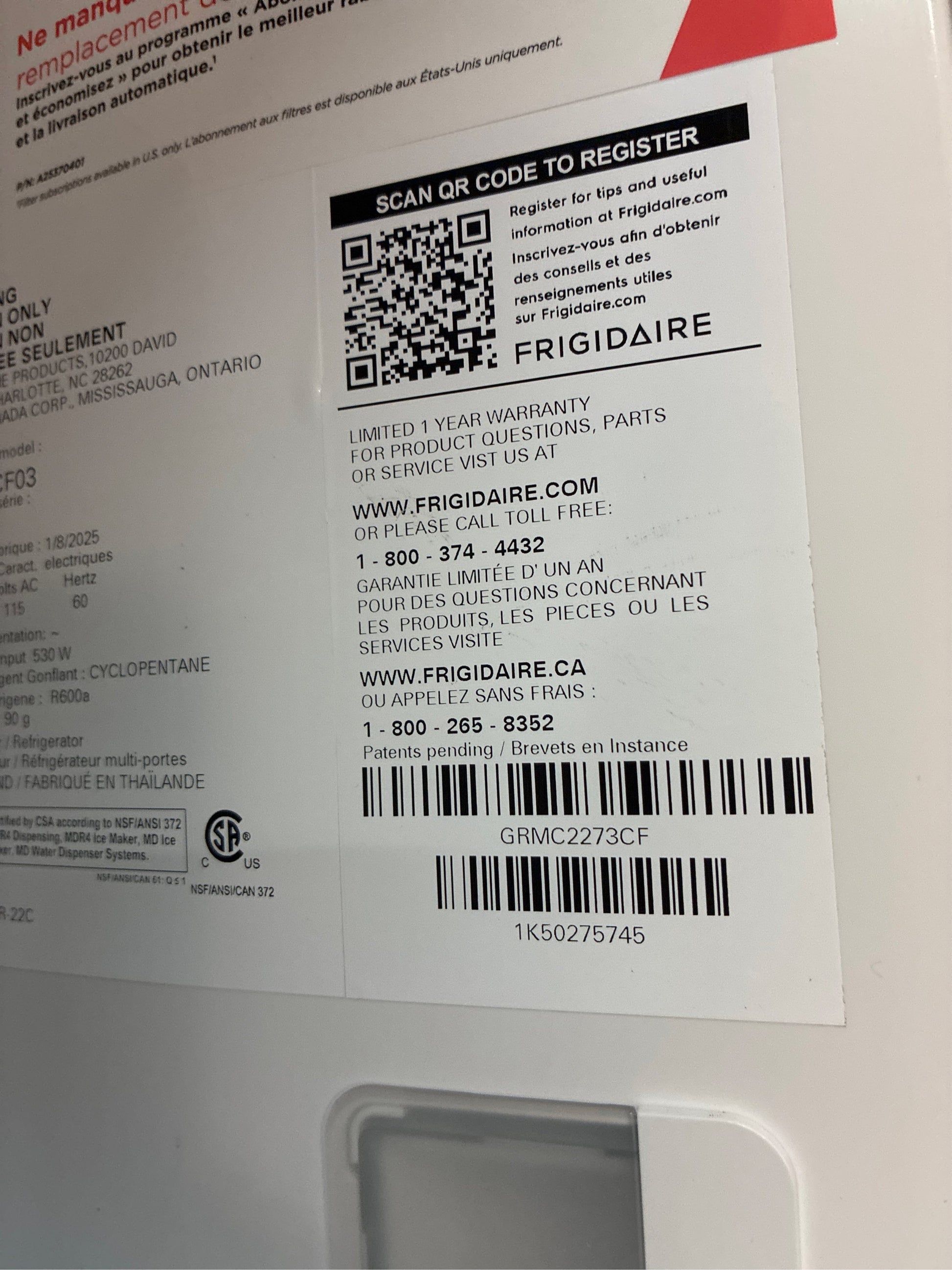 This FRIGIDAIRE GALLERY French door refrigerator maintains the taste and texture of even your most delicate foods. Our freshness system is packed with technologies that keep food fresh. Reduce food waste and increase freshness with our cooling system, advanced crispers, and our genuine air and water filtration.. Crispers keep produce fresh with 3 advanced technologies. Maximize usable space with our clever organization system. Switch from fridge to freezer with the Custom-Flex Temp Drawer. Crispers keep produce fresh with 3 advanced technologies. Maximize usable space with our clever organization system. Switch from fridge to freezer with the Custom-Flex Temp Drawer. Packed with technologies that reduce food waste and energy consumption, our refrigerator is a smart option for the environment and your wallet. Keep safer, great tasting water flowing and reduce up to 99% of contaminants while cutting back on plastic and the cost of bottled water with our water filter. Our cooling system ensures temperature and airflow distribution is even in both the refrigerator and freezer, this minimizes common issues, such as freezer burn and warm spots. Compatible with air filter model : FRGPAAF2 . Easily access your favorites - reach up to 75% of your food with only one door open. Smudge-Proof Stainless Steel resists fingerprints and cleans easily. Use our crisper to keep your produce fresh for longer, or flip it around to use as an open compartment to easily access items such has beverages, yogurts or snacks. Our counter-depth refrigerator sits flush with existing cabinetry, making it easy to achieve a sleek, built-in look without the hassle of remodeling. Enhanced bright LED lighting illuminates every level on the inside, and our ambient pocket handle offers an ambient light for your kitchen. Our air filter performs better than baking soda, capturing undesirable smells to keep your fridge fresh for longer. Avoid spoiled food with our auto-close doors, which ensure your doors are never left slightly open by automatically closing once the door is ajar 5 in. or less. Compatible water filter model: FPPWFU02. Awarded editor's choice french door refrigerator of 2023 by reviewed.com (USA today). Click here to shop all Frigidaire appliances . Click here for more information on Electronic Recycling Programs . Appliance Category: Refrigerator. Appliance Series: Frigidaire Gallery. Appliance Type: French Door Refrigerator. Built-In and Standard Type: French Door. Color - Appliance Cabinet: Gray. Color - Door Handle(s): Smudge-Proof Stainless Steel. Color/Finish: Smudge-Proof Stainless Steel. Color/Finish Family: Stainless Steel. Defrost Type: Frost Free. Dispenser Location: External Ice Dispenser,External Water Dispenser. Door Finish: Smooth. Energy Consumption (kWh/year): 668. Energy Efficiency Tier Rating: Not CEE rated. Freezer Capacity (cu. ft.): 5.8 cu ft. Freezer Door Type: Pull Out Drawer. Freezer Features: LED Light Type. Freezer Type: Drawer Freezer. General Features: Child Lock,Dispenser Light,Door Alarm,Interior Light,LED Light Type,Sabbath Mode,Smudge-Proof. Handle Type: Bar Handle. Hardware Color/Finish: Stainless Steel. Hardware Color/Finish Family: Stainless Steel. Ice Maker Features: Control Lockout,Filtered Ice,Ice Maker. Ice/Water Dispenser: Both. Indoor/Outdoor: Indoor. Installation Depth: Counter Depth. Installation Type: Free Standing. Number of Doors: 4 Door. Number of Drawers: Double Drawer. Number of Freezer Baskets/Bins: 1 Basket/Bin. Number of Freezer Shelves: 1 Shelf. Number of Refrigerator Shelves: 3 Shelves. Operational Features: Convertible Freezer,Dual Evaporated Cooling System,Fresh Air Filter,Humidity Controlled Crisper,Sabbath Mode,Self-Closing Door. Product Weight (lb.): 313 lb. Refrigeration Dispenser Features: Crushed Ice,Cubed Ice,Dispenser Control Lock-Out,Filtration Replacement Indicator Light,Water Dispenser. Refrigerator Capacity (cu. ft.): 13.1 cu ft. Shelf Material - Freezer: Glass. Shelf Material - Refrigerator: Glass. Storage Features: Adjustable Door Storage,Adjustable Shelves/Racks,Crisper Drawer,Gallon Door Storage. Temperature Control Type: Internal Digital. Total Capacity (cu. ft.): 21.5 cu ft. Water Filter Replacement Model#: FPPWFU02. Certifications and Listings: CSA Listed,Energy Star. Depth (Excluding Handles) (in.): 29.5 in. Depth (Including Handles) (in.): 32 in. Depth (Less Door) (in.): 24.6 in. Depth With Door Open 90 Degrees (in.): 46.9 in. Height to Top of Door Hinge (in.): 70.2 in. Height to Top of Refrigerator Case (in.): 69.1 in. Height to Top of Refrigerator Door (in.): 70.2 in. Product Depth (in.): 32 in. Product Height (in.): 70.2 in. Product Width (in.): 35.9 in. Refrigerator Width (in.): 35.9 in