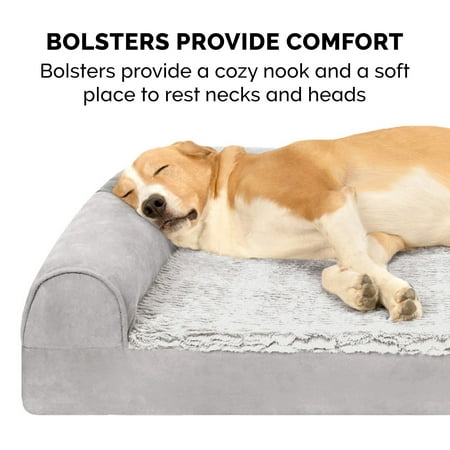 COMFORT AS PRIORITY: The stylish L shaped chaise design creates a cozy and inviting space that promotes comfort and security; designed with supportive bolsters for dogs to rest their heads on for optimum lounging comfort SLEEP SURFACE: Featuring a cuddly soft plush embossed faux fur main sleep surface and thick fluffy bolsters wrapped in easy-care suede; both are gentle on noses and paws for enhanced snuggling and burrowing comfort EASY ON JOINTS: The egg crate orthopedic foam base helps cushion pressure points and improve air circulation, while fluff-filled bolsters support the neck, back, hips, and joints; helps ease discomfort and promote restful sleep PRODUCT DETAILS: Orthopedic Dog Bed, Gray; Jumbo - 40 x 32 x 8 (foam: 4 - sleep surface: approx. 35 x 27) EASY CARE: The dog bed cover is completely machine washable and is easily removed with a two zipper design that allows access to the foam base and bolsters; for more specific care instructions, please refer to the hang tag and/or seam label