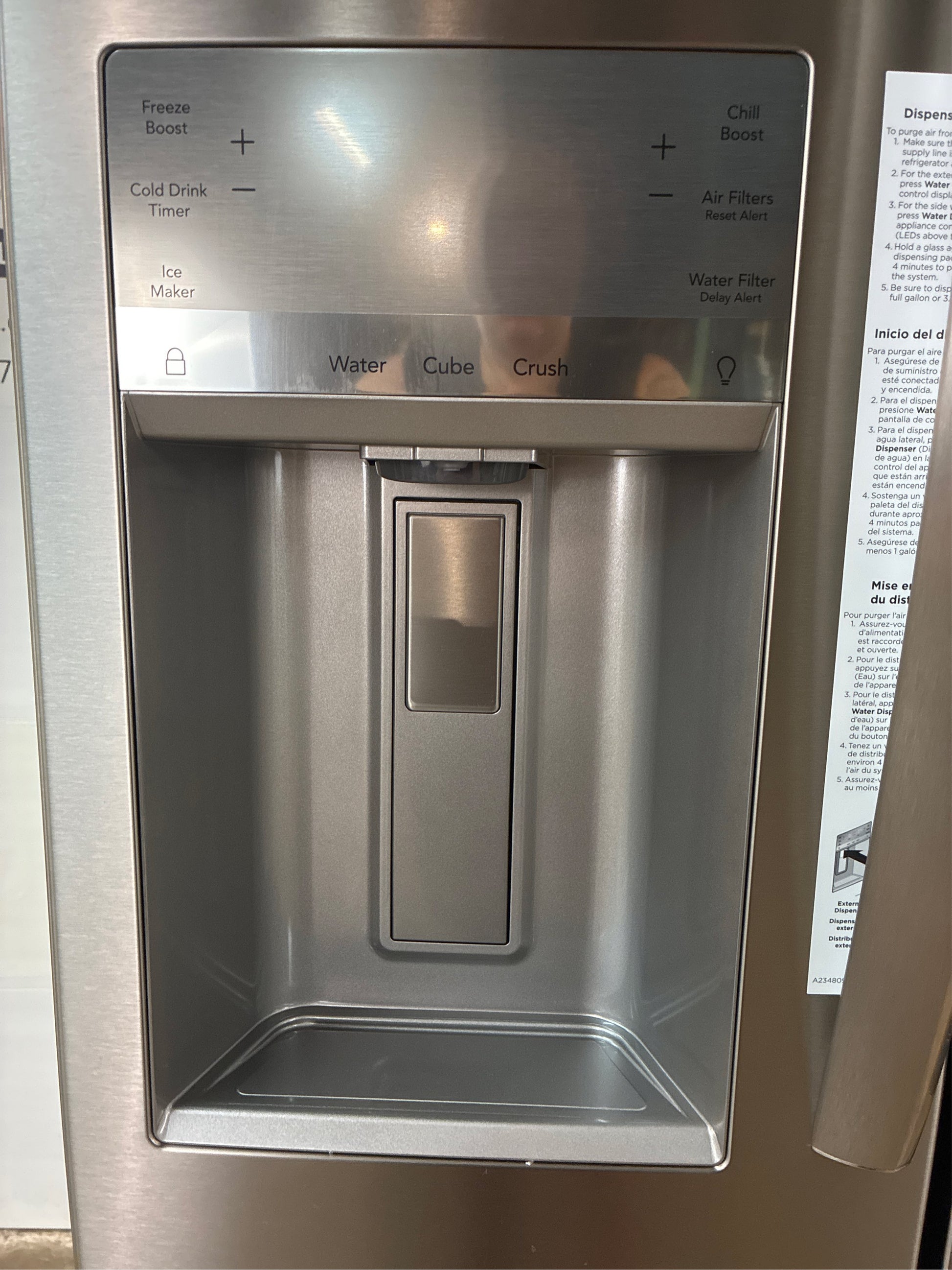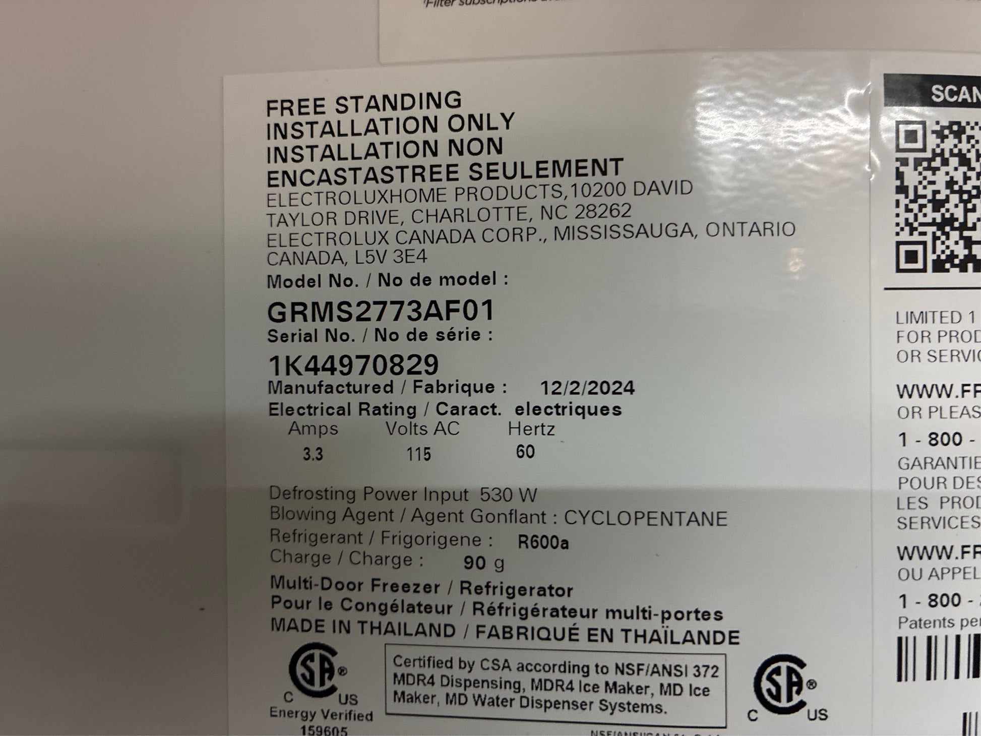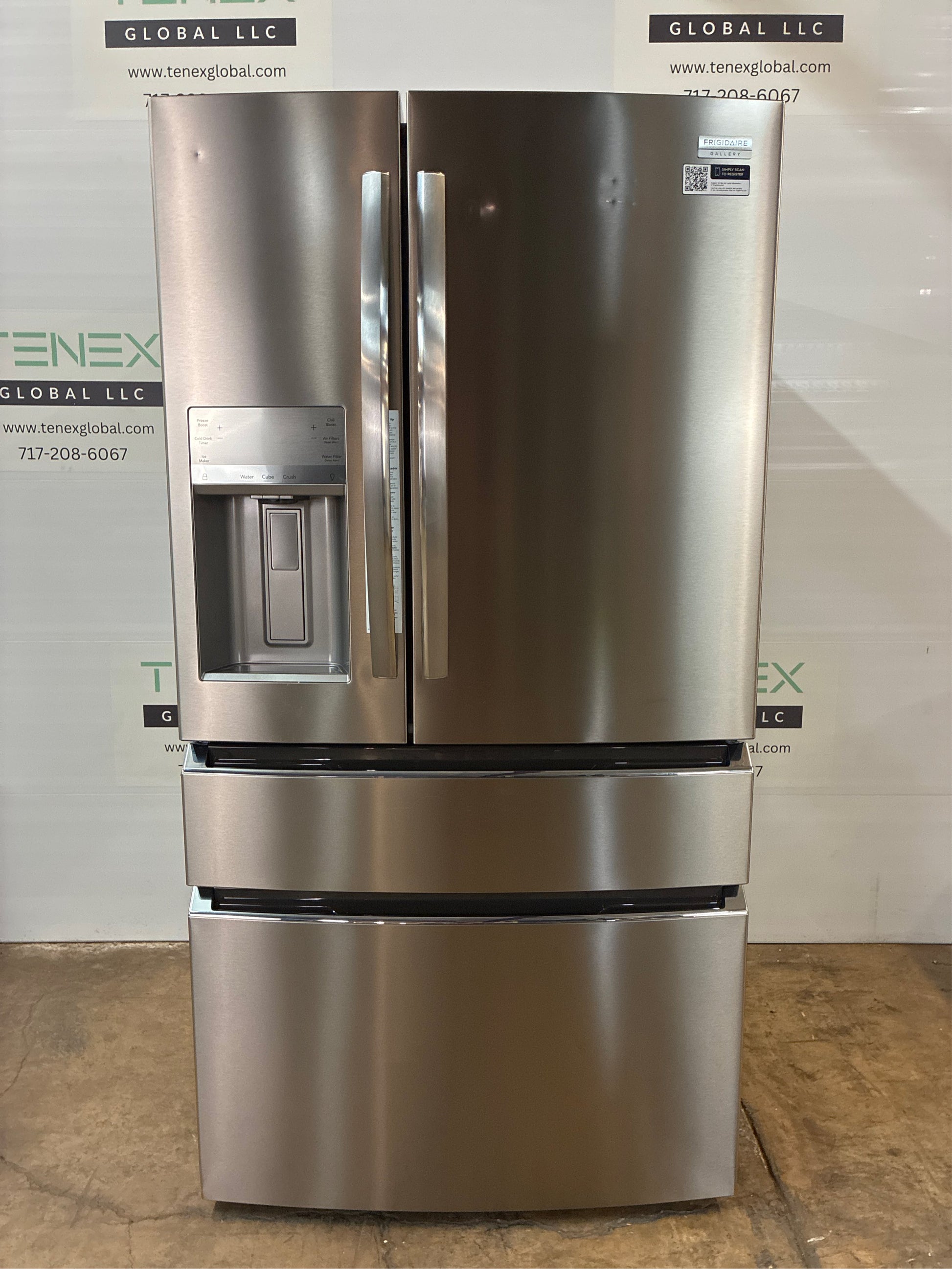 This Frigidaire Gallery 4-Door French Door refrigerator maintains the taste and texture of even your most delicate foods. Our freshness system is packed with technologies that keep food fresh and reduce food waste. They include our cooling system, advanced crispers, and our genuine air and water filtration.. Appliance Category: Refrigerator. Appliance Series: Frigidaire Gallery. Appliance Type: French Door Refrigerator. Built-In and Standard Type: French Door. Color - Appliance Cabinet: Gray. Color - Door Handle(s): Smudge-Proof Stainless Steel. Color/Finish: Smudge-Proof Stainless Steel. Color/Finish Family: Stainless Steel. Defrost Type: Auto / Cycle. Dispenser Location: External Water Dispenser. Door Finish: Smooth. Energy Consumption (kWh/year): 721. Energy Efficiency Tier Rating: Not CEE rated. Freezer Capacity (cu. ft.): 7.3 cu ft. Freezer Door Type: Pull Out Drawer. Freezer Features: Adjustable Temperature Control,LED Light Type,Open Door Alarm. Freezer Type: Drawer Freezer. General Features: Digital Temperature Control,Door Alarm,Hidden Hinge,Interior Light,LED Light Type,Sabbath Mode,Self-Closing Door,Smudge-Proof. Handle Type: Bar Handle. Hardware Color/Finish: Stainless Steel. Hardware Color/Finish Family: Stainless Steel. Ice Maker Features: Filtered Ice,Ice Maker,Removable Basket. Ice/Water Dispenser: Both. Indoor/Outdoor: Indoor. Installation Depth: Standard Depth. Installation Type: Free Standing. Number of Doors: 4 Door. Number of Drawers: Double Drawer. Number of Freezer Baskets/Bins: 1 Basket/Bin. Number of Freezer Shelves: 1 Shelf. Number of Refrigerator Shelves: 3 Shelves. Operational Features: Convertible Freezer,Dual Evaporated Cooling System,Fresh Air Filter,Humidity Controlled Crisper,Self-Closing Door. Product Weight (lb.): 335 lb. Refrigeration Dispenser Features: Crushed Ice,Cubed Ice,Filtration Replacement Indicator Light,Water Dispenser,Water Filtration. Refrigerator Capacity (cu. ft.): 15.8 cu ft. Returnable: Non-Returnable. Shelf Material - Freezer: Glass. Shelf Material - Refrigerator: Glass. Storage Features: Adjustable Door Storage,Adjustable Shelves/Racks,Gallon Door Storage. Temperature Control Type: External Digital. Total Capacity (cu. ft.): 26.3 cu ft. Water Filter Replacement Model#: FPPWFU01. Certifications and Listings: CSA Listed,Energy Star. Depth (Excluding Handles) (in.): 34.6 in. Depth (Including Handles) (in.): 36.8 in. Depth (Less Door) (in.): 29.7 in. Depth With Door Open 90 Degrees (in.): 51.8 in. Height to Top of Door Hinge (in.): 70.2 in. Height to Top of Refrigerator Case (in.): 68.1 in. Product Depth (in.): 36.8 in. Product Height (in.): 70.2 in. Product Width (in.): 36 in. Refrigerator Width (in.): 36 in. Installation Depth: Standard Depth. Total Capacity (cu. ft.): 26.3 cu ft. Height to Top (in.): 68.1 in. Dispenser Features: Water Dispenser. Ice Maker Features: Ice Maker. No of Doors: 4 Door. Dispenser Features: Cubed Ice. Depth (Excluding Handles) (in.): 34.6 in