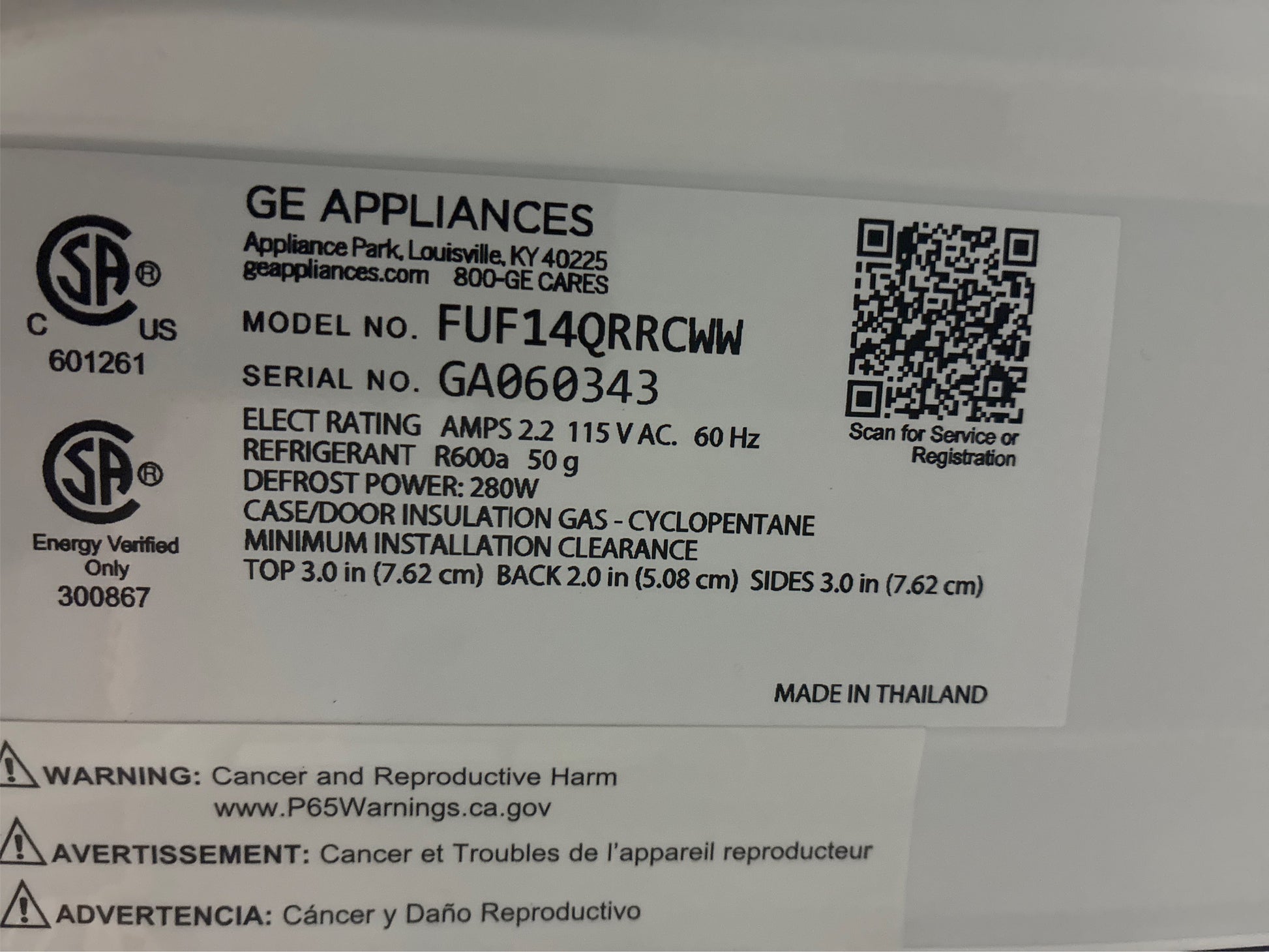 At GE Appliances, we bring good things to life, by designing and building the world's best appliances. Our goal is to help people improve their lives at home by providing quality appliances that were made for real life. Whether it's enjoying the tradition of making meals from scratch or tackling a mountain of muddy jeans and soccer jerseys, GE Appliances are crafted to support any and every task in the home. Garage Ready Freezer performs in temperatures of 0 F - 110 F. Tested to keep food frozen for 48 hours in a power outage. Restores set temperature for optimum food freshness. Garage Ready - Garage ready freezers from GE Appliances have been tested to perform from 0 F to 110 F, so you can store your family's favorite with confidence. Wire Shelving - Easily organize and find your frozen favorites thanks to an upright freezer with 4 wire shelves that are easily adjustable and quick to clean. Slide-Out Bin - Freeze with ease thanks to an upright freezer with pull out drawer that makes finding items easy and allows for more flexible storage. Interior Electronic Controls - Convenient temperature controls are easy to reach and make maintaining the ideal environment inside the upright freezer simple. Hidden Hinges - Enjoy a streamlined appearance thanks to hidden hinges on the upright freezer door. LED Lighting - Quickly locate frozen items inside your upright freezer with interior LED lighting that illuminates upon opening. Sleek Appearance - Create a minimalist aesthetic with a glossy freezer door and integrated handle on the upright freezer, so you can achieve a big impact in a small space. Appliance Series: Not Applicable. Appliance Type: Upright Freezer. Bulk Storage Baskets (number): 1. Capacity (cu. ft.) - Freezer: 14.2 cu ft. Color/Finish: White. Color/Finish Family: White. Control Type: Electronic. Defrost Type: Frost Free. Energy Consumption (kWh/year): 442. Freezer Features: Adjustable Leveling Legs, Garage Ready Freezer, LED Light Type, Sliding-Bulk Storage Baskets. Freezer Type: Upright. Hardware Color/Finish: White. Hardware Color/Finish Family: White. Minimum Back Air Clearance (In): 2. Number of Shelves: 4. Product Weight (lb.): 168 lb. Reversible Door(s): No. Temperature Range: -10 to +15 degrees. Voltage (V): 115 V. Certifications and Listings: UL Listed. Depth (Excluding Handles) (in.): 29.5 in. Depth (Including Handles) (in.): 32 in. Depth With Door Open 90 Degrees (in.): 55.75 in. Height to Top of Case (in.): 61 in. Height to Top of Door Hinge (in.): 61.9 in. Minimum Side Air Clearance (In): 3. Product Depth (in.): 29.5 in. Product Height (in.): 61.9 in. Product Width (in.): 28 in.