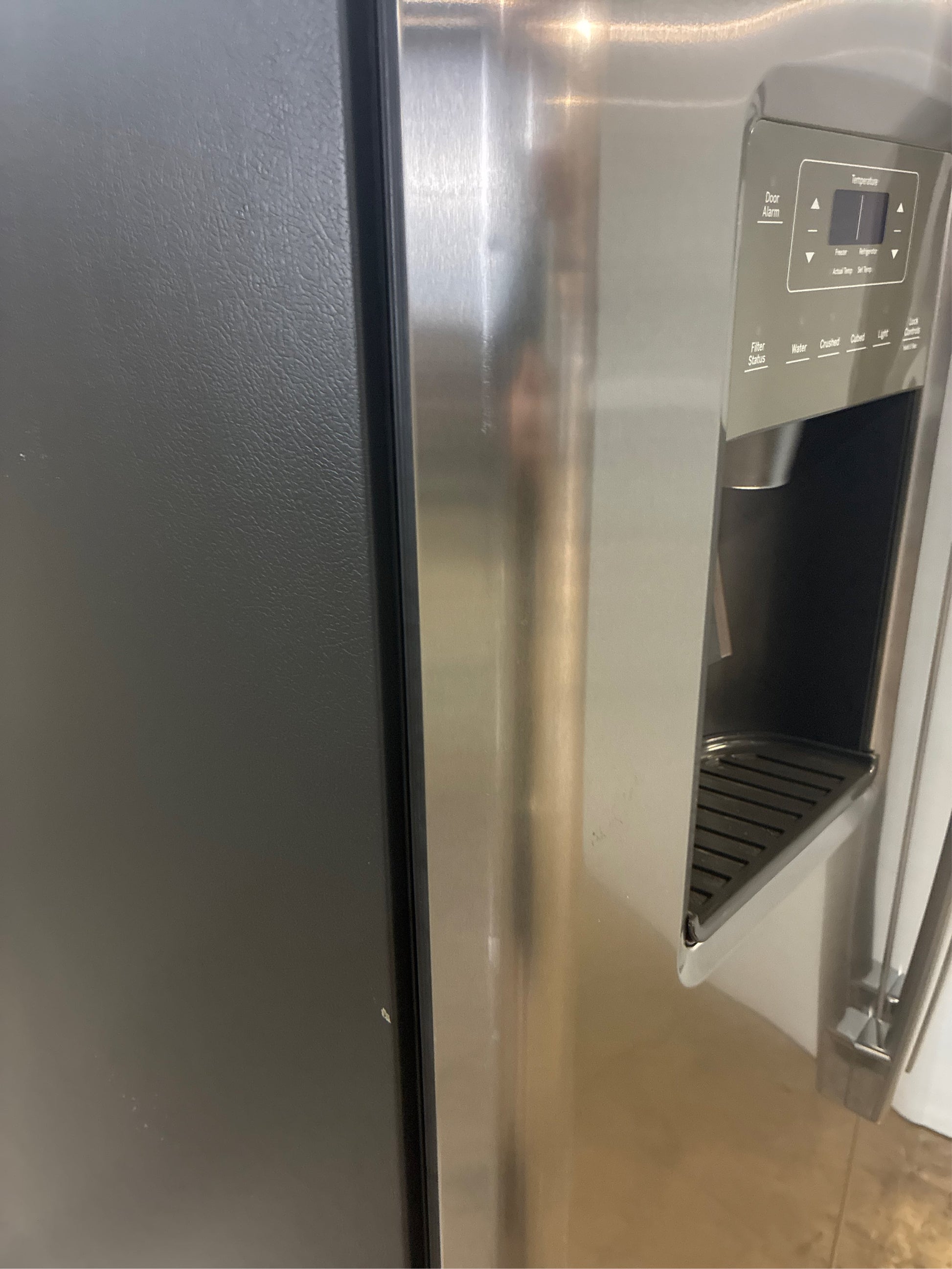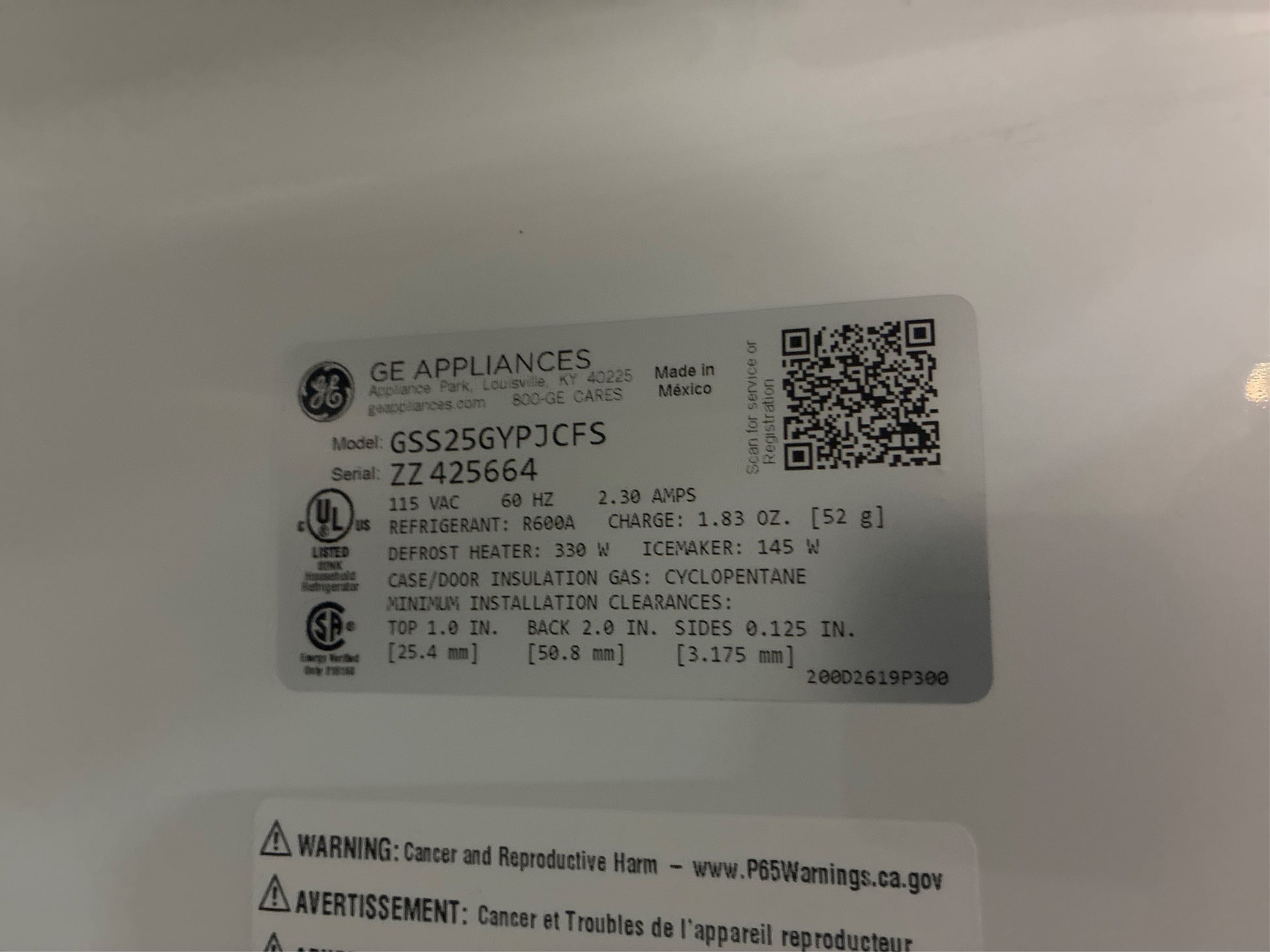 At GE Appliances, we bring good things to life, by designing and building the world's best appliances. Our goal is to help people improve their lives at home by providing quality appliances that were made for real life. Whether it's enjoying the tradition of making meals from scratch or tackling a mountain of muddy jeans and soccer jerseys, GE Appliances are crafted to support any and every task in the home. Resists fingerprints and smudges for a clean sleek appearance. Edge to edge glass shelves allow for easy cleaning. Advanced water filtration (uses XWFE filter). Water filter Sold Separately (Model # XWFE). Visit page to see subscription service options. . LED lighting - quickly find even the smallest items thanks to flush-mounted LED lighting, which sheds crisp, even light throughout the interior. Edge-to-edge shelves - store more of your favorite items and enjoy organizational flexibility on every level with glass shelves that extend from wall to wall. Clear door shelves - adjustable, see-through door shelves provide flexible storage options for even large containers, and free up valuable space inside the refrigerator. Interior storage drawers - 2-refrigerator pull out drawers with clear fronts provide the perfect, sealed environment to keep your produce organized. External dispenser - easily access clean water and filtered ice from a dispenser conveniently located on the outside of the door. Easy access icemaker - automatically create cubed or crushed ice thanks to a factory-installed, low profile icemaker. Advanced water filtration - Reduces trace pharmaceuticals from water and ice* (* Removes 98% of ibuprofen, atenolol, fluoxetine, progesterone and trimethoprim. These pharmaceuticals are not necessarily in all users' water) . Electronic display - forget the guesswork in setting the refrigerator temperature with an electronic display that allows for precise settings. Door alarm - keep your food fresh as long as possible with a close door alarm that signals when the fresh food or freezer door has been left open too long. Wire freezer shelves - store items of all shapes and sizes in the freezer section thanks to durable wire shelving. Slide-out freezer basket - freeze larger items easily with an accessible slide-out freezer basket that provides additional storage options. Freezer door shelves - get more space in your freezer thanks to freezer door shelves, which provide the perfect spot for preserving your favorites. Bonus freezer shelf - find room for everything you need to freeze thanks to an extra storage nook located above the icemaker, perfect for frozen treats or ice packs. Adaptive defrost - with FrostGuard technology, your freezer will only defrost when needed, as opposed to a time cycle, leading to less freezer burn and more energy savings. Enhanced Shabbos mode - the Shabbos keeper connects to your refrigerator to automatically enable Shabbos compatible modes each week and before every holiday (Shabbos keeper sold separately). Click here to shop more GE refrigerators . Click here to shop more GE appliances . Appliance Category: Refrigerator. Appliance Series: Not Applicable. Appliance Type: Side-by-Side Refrigerator. Built-In and Standard Type: Side-by-Side. Color - Appliance Cabinet: Gray. Color - Door Handle(s): Stainless Steel. Color/Finish: Fingerprint Resistant Stainless Steel. Color/Finish Family: Stainless Steel. Defrost Type: Frost Free. Dispenser Location: External Ice Dispenser,External Water Dispenser. Door Finish: Smooth. Energy Consumption (kWh/year): 708. Energy Efficiency Tier Rating: Not CEE rated. Freezer Capacity (cu. ft.): 9.25 cu ft. Freezer Door Type: Swing Door. Freezer Features: In-door Storage,LED Light Type. Freezer Type: Side Door Freezer. General Features: Digital Temperature Control,Door Alarm,LED Light Type,Smudge-Proof. Handle Type: Bar Handle. Hardware Color/Finish: Fingerprint Resistant Stainless Steel. Hardware Color/Finish Family: Stainless Steel. Ice Maker Features: Filtered Ice,Ice Maker. Ice/Water Dispenser: Both. Indoor/Outdoor: Indoor. Installation Depth: Standard Depth. Installation Type: Free Standing. Number of Doors: 2 Door. Number of Freezer Baskets/Bins: 1 Basket/Bin. Number of Freezer Shelves: 3 Shelves. Number of Refrigerator Shelves: 4 Shelves. Operational Features: No Additional Features. Overall Product Height (in.): 70 in. Product Weight (lb.): 320 lb. Refrigeration Dispenser Features: Crushed Ice,Cubed Ice,Water Dispenser,Water Filtration. Refrigerator Capacity (cu. ft.): 25.3 cu ft. Shelf Material - Freezer: Wire. Shelf Material - Refrigerator: Glass. Storage Features: Adjustable Door Storage,Adjustable Shelves/Racks,Removable Shelves. Temperature Control Type: External Digital. Total Capacity (cu. ft.): 25.3 cu. ft. Water Filter Replacement Model#: XWFE. Certifications and Listings: UL Listed. Depth (Excluding Handles) (in.): 32.75 in. Depth (Including Handles) (in.): 34.75 in. Depth (Less Door) (in.): 28.5 in. Depth With Door Open 90 Degrees (in.): 50.5 in. Height to Top of Door Hinge (in.): 69.875 in. Height to Top of Refrigerator Case (in.): 69 in. Height to Top of Refrigerator Door (in.): 69.875 in. Product Depth (in.): 34.75 in. Product Height (in.): 69.875 in. Product Width (in.): 36 in. Refrigerator Width (in.): 36 in.