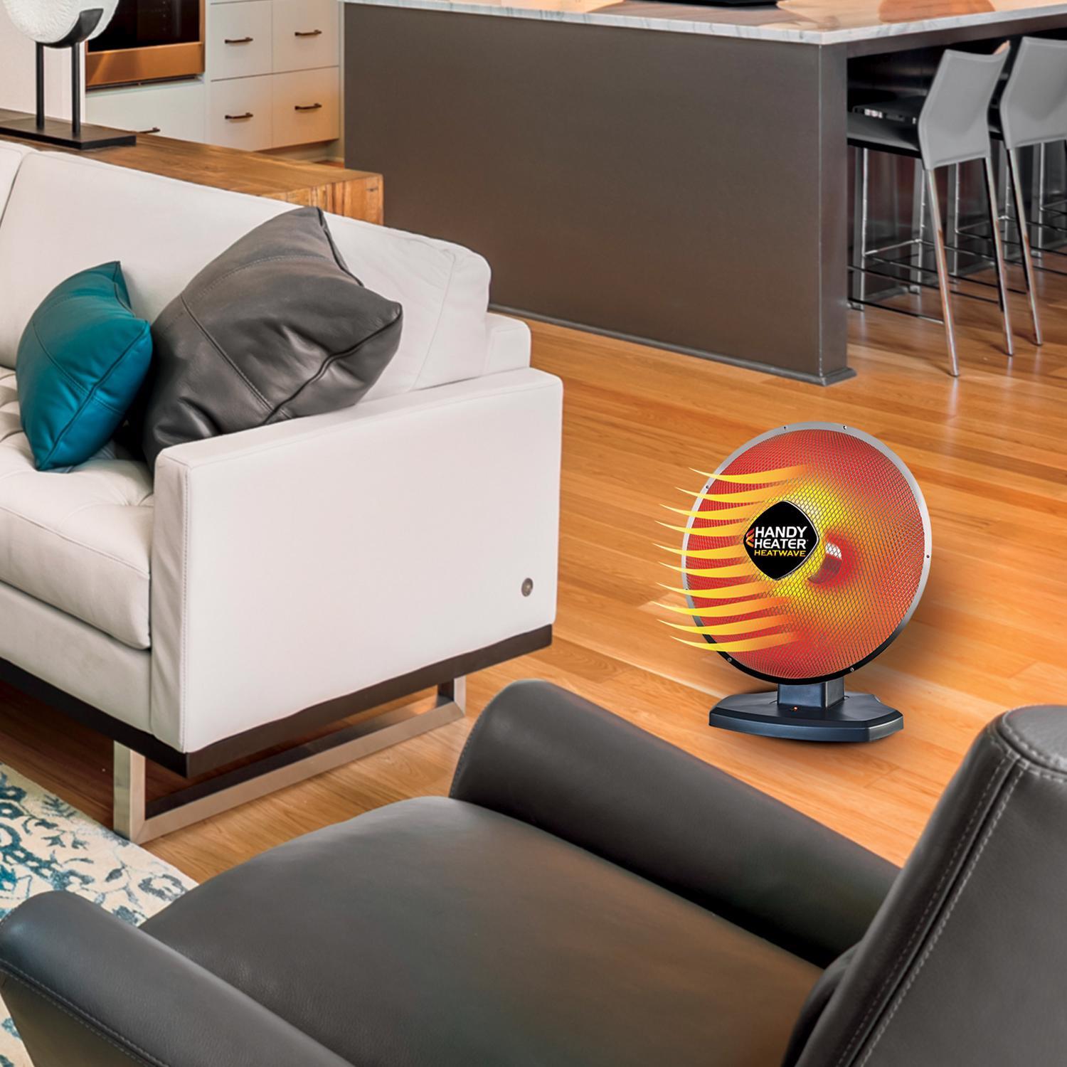 Handy Heater Heatwave - this personal space heater uses a parabolic design to concentrate heat from a focused point and reflects off the curved surface for instant, sun-like warmth without a noisy fan. The Handy Heater Heatwave will quickly turn your personal space into a warm comfort zone.