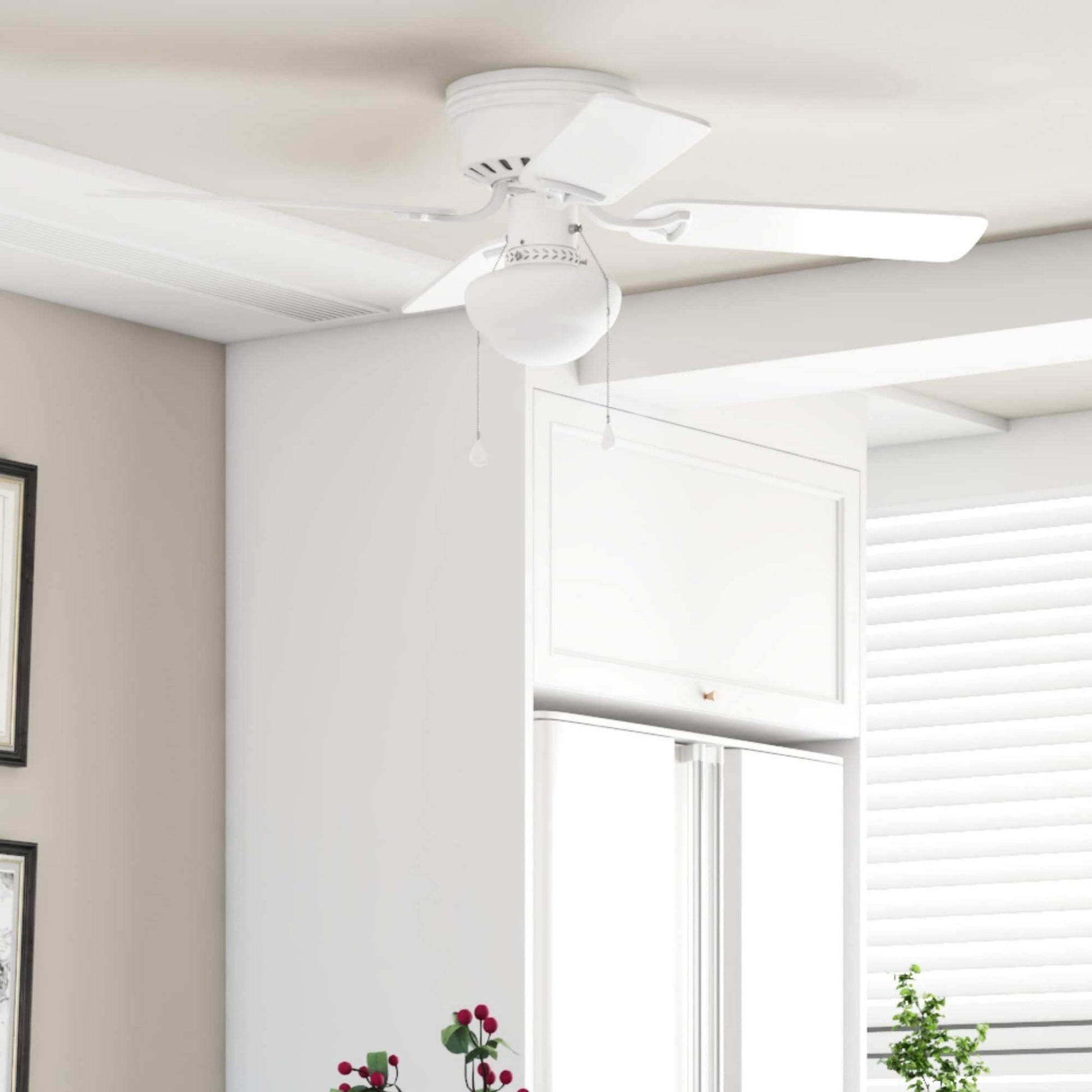 The Harbor Breeze builders series 42-in Armitage features a white finish, 4 reversible blades and light kit that includes an LED bulb. Low profile design to be mounted flush with the ceiling where more walk-through space is. Easy to use pull chains are included for quick adjustments to the 3 speed settings and on/off light control. Cases opal glass globe houses dimmable A15, E26 6.5W LED bulb (included). White finish complements the 4 reversible white or blonde ceiling fan blades. 42-in fan provides airflow up to 2053 CFM, making it ideal for small sized rooms up to 100-sq ft. Reversible motor efficiently circulates cool air in the summer and warm air in the winter, cutting down on energy costs. Classic design transcends many styles of decor. Blade Color: White Collection Name: Armitage Color-Changing: No Fixture Color Family: White Housing Color/Finish: White Reversible Blade Color: Light brown Type: Standard Depth (Inches): 11.6 Downrod Length (Inches): 0 Fan Diameter (Inches): 42 Maximum Height (Inches): 12 Maximum Motor Speed (RPM): 197 Minimum Height (Inches): 12 Suggested Room Size: Small Room (up to 100 sq. ft.) Weight (lbs.): 8.9 Width (Inches): 42 Airflow (CFM): 2053 Angle Mount Capable: No Blade Finish: White/blonde Bulb Type: LED Bulb(s) Included: Yes Commercial/Residential: Residential Control Type: Pull chain Dimmable: Yes Downrod Included: No Dual Fan Heads: No For Use in Bathrooms: No For Use in Bedrooms: Yes For Use in Dining Rooms: Yes For Use in Kitchens: Yes For Use in Living Rooms: Yes Frosted Glass: No Glass Type: Opal glass High Speed Electricity Use (Watts): 28 Light Bulb Base Type: Medium base (E-26) Light Kit: With Light Light Kit Type: Globe Lowe's Exclusive: Yes Lumens: 600 Maximum Bulb Wattage: 6.5 Motor Type: AC Motor Mounting Type: Flush mount Number of Blades: 4 Number of Bulbs Required: 1 Number of Lights: 1 Number of Speeds: 3 Oscillating: No Package Quantity: 1 Power Source: Hardwired Recommended Light Bulb Shape: A15 Remote Control Included: No Retractable Blades: No Reverse Air Flow: Yes Reversible Blades: Yes Shade Material: Glass Style: Traditional Usage Rating: Dry Use Location: Indoor Voice Controlled: No CA Residents: Prop 65 Warning(s): Yes ENERGY STAR Certified: No Safety Listing: ETL safety listing UNSPSC: 40101600
