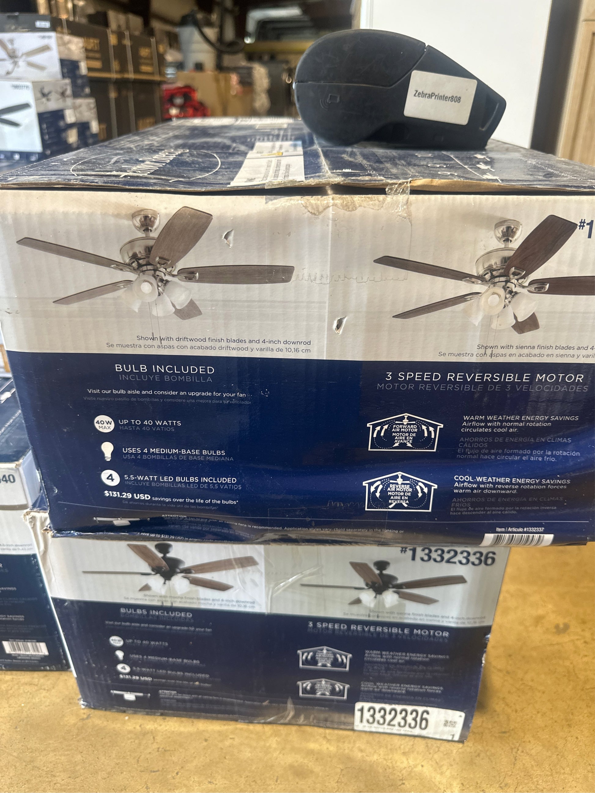 This multi-position ceiling fan can be hung close to the ceiling where more walk-through space is, on standard ceilings with a 4-in downrod (included) or on angled ceilings. Easy-to-use pull chains included for adjustments to the speed settings and light output; it is also compatible with universal ceiling fan remote controls (remote not included and remote receiver installation required). 4- Arm light kit with frosted glass shades; E26 A15 LED bulbs included. 52-in fan provides airflow up to 4302 CFM, making it ideal for medium to large sized rooms. 3 speed settings make it easy to maintain the ideal comfort level. Reversible motor efficiently circulates cool air in the summer and warm air in the winter, cutting down on energy costs. Transitional style. Blade Color: Brown. Collection Name: Notus. Color-Changing: No. Fixture Color Family: Nickel. Fixture Finish: Brushed. Housing Color/Finish: Brushed Nickel. Light Color: Warm White. Reversible Blade Color: Gray. Type: Standard. Depth (Inches): 52. Downrod Length (Inches): 4. Fan Diameter (Inches): 52. Maximum Height (Inches): 12.2. Maximum Motor Speed (RPM): 170. Minimum Height (Inches): 12.2. Suggested Room Size: Large Room (up to 400 sq. ft.). Weight (lbs.): 22.36. Width (Inches): 52. Airflow (CFM): 4302. Angle Mount Capable: Yes. Blade Finish: Driftwood/Sienna. Bulb Type: LED. Bulb(s) Included: Yes. Commercial/Residential: Residential. Control Type: Pull chain. Dimmable: Yes. Downrod Included: Yes. Dual Fan Heads: No. For Use in Bathrooms: No. For Use in Bedrooms: Yes. For Use in Dining Rooms: Yes. For Use in Kitchens: Yes. For Use in Living Rooms: Yes. Frosted Glass: Yes. Glass Type: Frosted glass. High Speed Electricity Use (Watts): 40. Light Bulb Base Type: Medium base (E-26). Light Kit: With Light. Light Kit Type: Branched. Lowe's Exclusive: Yes. Lumens: 600. Maximum Bulb Wattage: 5.5. Motor Type: AC Motor. Mounting Type: Downrod mount. Number of Blades: 5. Number of Bulbs Required: 4. Number of Lights: 4. Number of Speeds: 3. Oscillating: No. Package Quantity: 1. Power Source: Hardwired. Recommended Light Bulb Shape: A15. Remote Control Included: No. Retractable Blades: No. Reverse Air Flow: Yes. Reversible Blades: Yes. Shade Material: Glass. Style: Transitional. Usage Rating: Dry. Use Location: Indoor. Voice Controlled: No. Wattage Equivalent: 60. App Compatibility: No. Bluetooth Compatibility: No. Smart Compatible: No. Wi-Fi Compatibility: No. Works with Amazon Alexa: No. Works with Android: No. Works with Apple HomeKit: No. Works with iOS: No. Works with SmartThings: No. Works with the Google Assistant: No. CA Residents: Prop 65 Warning(s): Yes. ENERGY STAR Certified: No. Safety Listing: ETL safety listing. UNSPSC: 40101600.