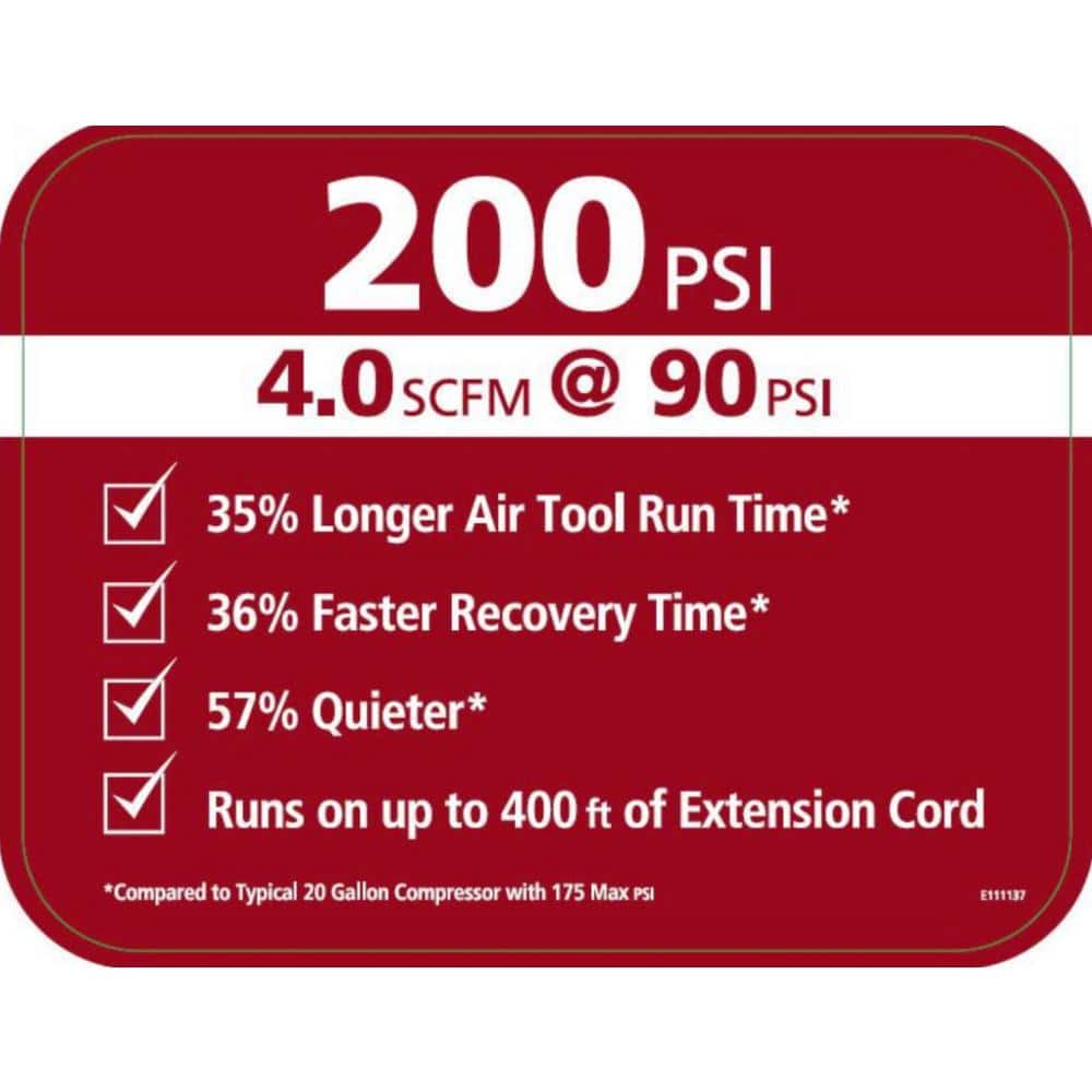 The Husky 20 Gal. oil free air compressor is industry leading with high performance technology. This Husky 20 Gal. portable vertical air compressor with 200 maximum psi provides 35% longer air tool run time compared to typical 20 Gal. compressors with 175 maximum psi . At 81 dBA, the oil free pump brings less noise to your work environment and has a 57% sound improvement versus typical 20 Gal. compressors with 175 maximum psi. The high efficiency motor allows for easier cold weather start as low as -20 F (-29 C) and extension cord application up to 400 ft. of extension cord. The Husky 20 Gal. 200 PSI air compressor is perfect for light automotive tasks, agricultural equipment repairs and intermittent use for metal working applications.. 35% Longer Air Tool Runtime vs. 20 gallon 175 PSI compressors. 36% Faster Recovery Time vs. 20 gallon 175 PSI compressors. 57% Quieter compared to 20 gallon 175 PSI compressors. 200 maximum psi for 35% longer air tool run times compared to typical 20 Gal. compressor with 175 maximum psi. 200 maximum psi for 36% faster recovery time compared to typical 20 Gal. compressor with 175 maximum psi. With a decibel rating of 81 dBA, this compressor brings less noise to your work environment with a 57% sound improvement versus typical 20 Gal. compressors with 175 maximum psi. Cold weather start as low as -20 F (-29 C) allows for easier start in colder temperatures. Able to operate up to 400 ft. of extension cord. 7 in. wheels for shop or garage portability. Slim vertical design has a smaller footprint and takes up less space in your shop or garage. Perfect for all inflation, finish nailing/stapling, hobby painting, bolting/fastening, and cutting/drilling and surface prep. Oil free pump allows for hobby spray painting without the need for oil separators in the air system. Air Delivery SCFM @ 40PSI: 5.2. Air Delivery SCFM @ 90PSI: 4. Amperage (A): 15 A. Application Use: Air Brushing,Blow Cleaning,Bolting,Brad Nailing,Finish Nailing,Framing Nailing,Hobby Nailing,Hobby Painting,Inflation,Stapling,Wrenching. Battery Amp Hours: No Battery. Battery/Charger: Tool Only. Charger Included: Charger Not Included. Compressor Tank Capacity (gal.): 20 gal. Compressor Type: Light Duty. Compressor Volume Rating: Quiet. Compressor/Air Tool Features: Handle,Oil Free Compressor,Tank Pressure Gauge,Wheels. Condition: New. Decibel Rating (Outdoor): 81 dBA. Horsepower (hp): 1.3 hp. Included: No additional components or accessories are included. Included in Combo: Compressor Only. Lubrication Type: Oil less. Maximum Pressure (PSI): 200 PSI. Number of Total Batteries Included: 0. Portable: Yes. Power Source: Electric. Power Type: Corded Electric. Product Weight (lb.): 67 lb. Reconditioned: No. Stage Count: Single Stage. Tank Material: Steel. Tank Style: Vertical. Tools Product Type: Air Compressor. Voltage (V): 120 V. Voltage (v): 120v. Product Depth (in.): 17 in. Product Height (in.): 41 in. Product Width (in.): 17 in