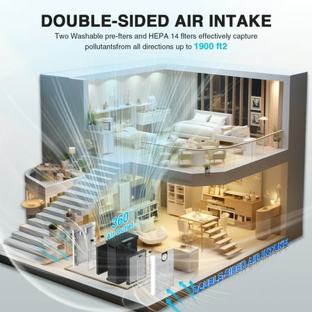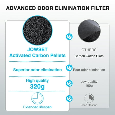 Convenient Washable Pre-Filter Our air purifier unit features a removable and washable pre-filter with a fine mesh that serves as your first line of defense against dander, pet hair, fibers, and larger airborne particles. Easily clean the pre-filter with a vacuum cleaner or wash it, making maintenance simple and cost-effective. This also helps extend the lifespan of the True HEPA14 filter. At JOWSET, we prioritize efficiency, cost savings, and environmental sustainability, dedicated to providing fresh air for your home and creating a healthy and comfortable environment. Latest H14 HEPA Filters The JOWSET air purifier uses the latest HEPA 14 filter, which has 10 times the purification efficiency compared to the standard HEPA 13 filter. High-Efficiency Air Purifier: Enjoy clean and fresh air with our JOWSET air purifier for large rooms! Using advanced air spiral technology, it refreshes the air per hour in spaces up to 2215 sq ft / 150 sq m, ideal for home use. PM2.5 Real-Time Display Our JOWSET air purifier for home unit with a built-in sensor that continuously updates and displays PM2.5 levels on the screen. With LED lights changing color based on the surrounding air quality, you can easily monitor and manage air purification, especially crucial for people with allergies and asthma. 22dB Low-Noise Operation Experience whisper-quiet operation with our JOWSET air purifier, which operates at only 22dB in sleep mode. Despite its reduced fan speed, it effectively filters the air, ensuring minimal disturbance while providing relief for allergies and asthma, even in large rooms. Suitable for allergies and asthma The Jowset air purifier provides pure, fresh air for you and your loved ones, addressing all indoor air quality needs, especially in large rooms. Features: 1.H14 HEPA Filter 2.4 FAN Speed 3.Auto Mode 4.Quiet Sleep Mode 5.2/4/6/8 Timer 6.Replace Filter Indicator 7.Child & Pets Lock What's Your Get: Air Purifier *1 HEPA H14 Filter *2 Power Cord *1 User Manual *1 NOTE: 1.Do not clean with water or any other liquid to avoid risk of electric shock. 2.Clean the white side of the filter with a brush or vacuum hose each month to prevent buildup of hair or dust. 3.Washable Pre-Filter for Extended Lifespan.