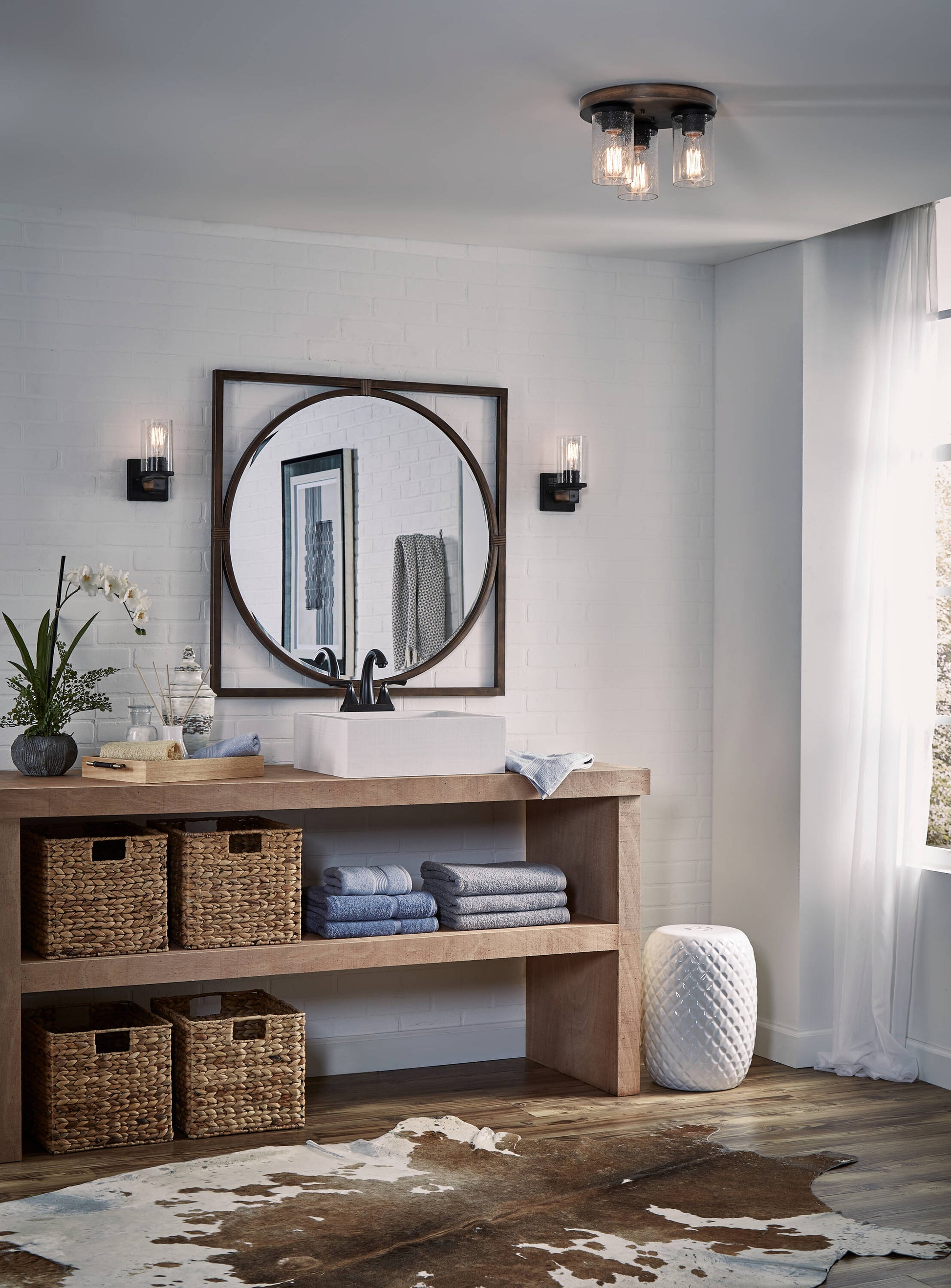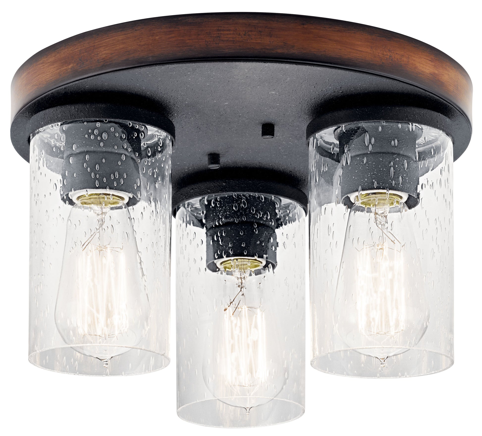 The Barrington collection offers a wide variety of lighting fixtures with an attractive wood tone finish and metal combination. Many are available in two color palettes: distressed black with wood tone and anvil iron with driftwood. All of the Barrington collection fixtures add form and function as well as beauty to your room. Distressed black and wood tone finish ceiling flush mount light from the Barrington collection offers an industrial look. Clear seeded glass shades offer an effervescent; old-fashioned style. Requires three 60-watt medium base bulbs (not included). Fixture dimensions: 11.5-in W x 11.5-in D x 7.38-in H. Great for a variety of decor styles. Includes mounting hardware and detailed instructions for easy installation. Coordinate with other fixtures from the Barrington collection to create the ultimate lighting statement. ETL listing demonstrates this product has met the minimum safety requirements of a widely recognized testing organization. Collection Name: Barrington Color Rendering Index (CRI): 0 Color Temperature (Kelvins): 0 Fixture Color Family: Black Fixture Finish: Distressed Manufacturer Color/Finish: Distressed Black and Wood Tone Shade Color/Finish Family: Clear Type: Flush mount light Height (Inches): 7.38 Size: Mini (less than 13 inches wide) Width (Inches): 11.5 Bulb Type: Incandescent Bulb(s) Included: No Depth (Inches): 11.5 Dimmable: Yes For Use in Bathrooms: No For Use in Bedrooms: Yes For Use in Dining Rooms: Yes For Use in Foyers: Yes For Use in Kitchens: Yes For Use in Living Rooms: Yes Grade: Commercial/Residential Light Bulb Base Type: Medium base (E-26) Lowe's Exclusive: Yes Lumens: 0 Material: Steel Maximum Bulb Wattage: 60 Maximum Fixture Wattage: 180 Motion Sensor: No Number of Bulbs Required: 3 Number of Lights: 3 Package Quantity: 1 Power Source: Hardwired Recommended Light Bulb Shape: A19 Shade Material: Glass Shade/Glass Type: Clear glass Shape: Round Style: Rustic Usage Rating: Dry Use Location: Indoor Wattage Equivalent: 180 Weather Resistant: No Slope Ceiling Compatibility: No CA Residents: Prop 65 Warning(s): Yes ENERGY STAR Certified: No Safety Listing: ETL safety listing UNSPSC: 39111500