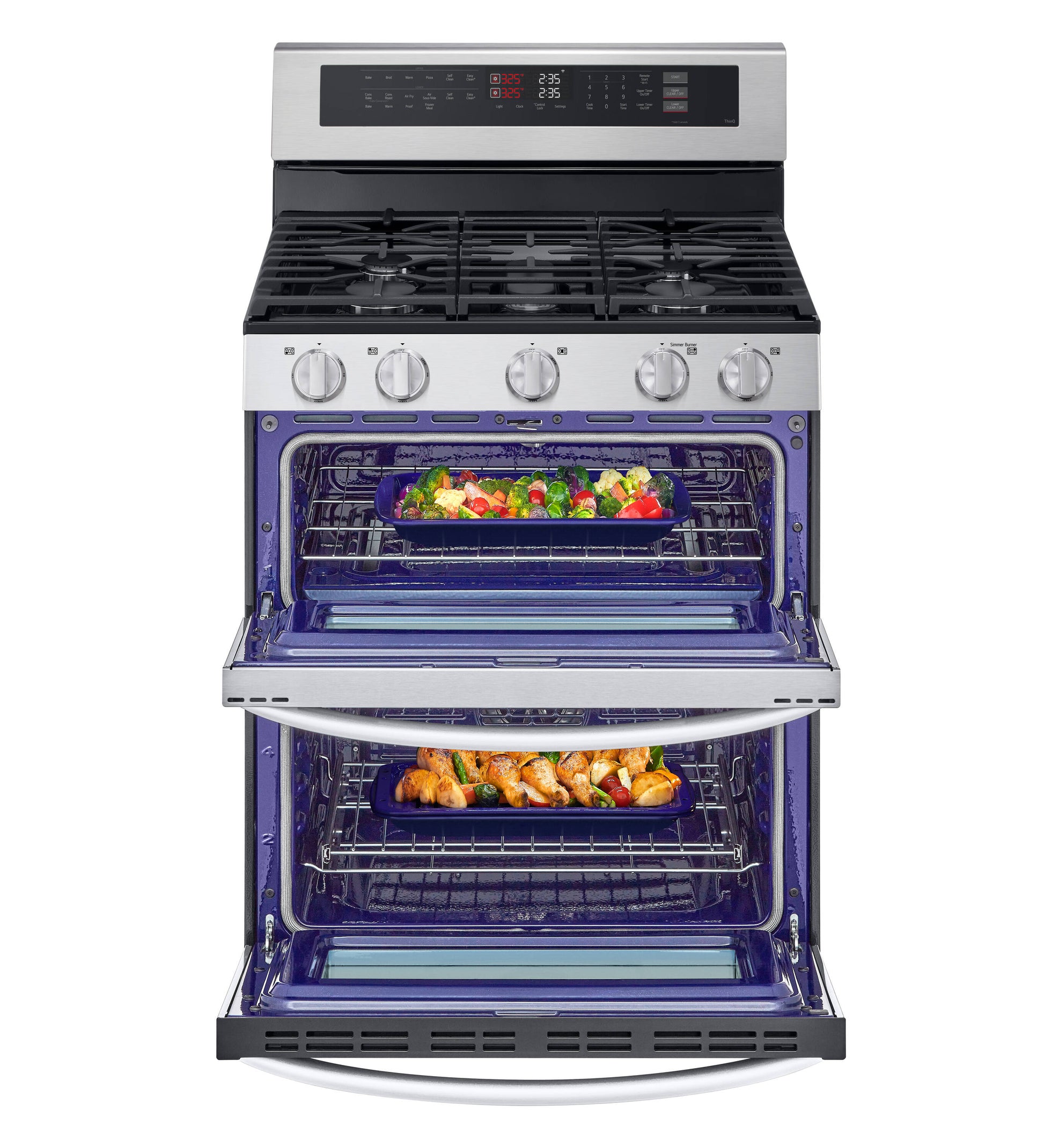 Expand your cooking game with a double oven freestanding range that delivers versatility and extra space with its 7.3 cu. ft. capacity. Enjoy ProBake Convection for quick and even cooking, air fry enough food to feed a crowd, and use air sous vide to cook meats, fish, and vegetables to perfection. Everything you need is built into one sleek design featuring. The ThinQ app offers control and convenience to help you simplify life and enjoy the comforts of home. Five cooktop burners of varying sizes and power levels provide all the power and precision you need. This 6.9 cu ft LG range has the largest capacity oven in its class. When ordinary burners can t keep pace with your on-demand dinner schedule, turn up the power with a 20K BTU burner that rapidly goes to high heat to quickly boil, or turns down to a true simmer. Not only do our heavy-duty, continuous cast-iron grates look great, but they also help provide even heating and a stable surface for your cookware. Quickly air fry enough crispy favorites to feed a crowd, while saving time and counter space. Using low oven temperatures and airflow around vacuum sealed ingredients, Air Sous Vide locks in moisture and aroma to deliver meats, fish and vegetables that are juicy, tender and consistently delicious. The intuitive SmoothTouch glass controls deliver sleek style and easy operation, with just a touch of your finger. Appliance Color/Finish: Stainless steel Handle Color: Stainless Steel Manufacturer Color/Finish: Stainless Steel Type: Freestanding Adjustable Height: No Capacity (Primary Oven) (Cu. Feet): 4.3 Capacity (Secondary Oven) (Cu. Feet): 2.6 Cutout Depth (Inches): 30 Cutout Height (Inches): 36 Cutout Width (Inches): 30 Depth (Inches): 29.25 Maximum Assembled Height (Inches): 46.4 Minimum Assembled Height (Inches): 46.4 Popular Widths: 30-in Range Size (Inches): 30 Usable Primary Interior (H x W x D): 19.9 x 24.8 x 14.25 Usable Secondary Interior (H x W x D): 19.9 x 24.8 x 10.8 Width (Inches): 29.88 ADA Compliant: No Adjustable Cleaning Levels: Yes Air Fry: Yes Air Sous Vide: Yes Appliance Type: Double oven gas range Auto Re-Ignition: Yes Automatic Convection Conversion: Yes Automatic Shut-Off: Yes Burner #1 Max BTU: 9100 Burner #2 Max BTU: 5000 Burner #3 Max BTU: 17000 Burner #4 Max BTU: 20000 Burner #5 Max BTU: 10000 Burner #6 Max BTU: 0 Burner #7 Max BTU: 0 Burner #8 Max BTU: 0 Burner Grate Material: Porcelain-coated cast iron Cleaning Method: Self-cleaning Continuous Grates: Yes Control Location: In front of elements Control Lockout: Yes Convection Element Type (Primary Oven): Single-fan Convection Element Type (Secondary Oven): Single-fan Convection Oven: Yes Cooking Surface Control Type: Knobs Cooking Surface Type: Standard Customizable: No Dehydrator Oven: No Delay Bake: Yes Digital Display: Yes Dishwasher-Safe Grates: No Door Lock: Yes Downdraft Exhaust: No Drip Pans: No Dual/Tri-Ring Burner(s): No Favorite Setting: Yes Fingerprint-Resistant: No Food Temperature Probe: No Fuel Type: Natural gas Glide/Rollout Racks: No Half/Split Rack: No Hot Surface Indicator Lights: Yes Hub Required: No Ignition Type: Electronic Installation Type: Freestanding Integrated Griddle: No Interior Light(s) Type: LED Keep Warm Setting: Yes Light(s) Control: Oven light switch Lowe's Exclusive: No LP Conversion Kit Included: Yes LP Convertible: Yes Modular Design: No Number of Cooking Zones: 5 burners Number of Oven Rack Positions: 6 Number of Racks: 3 Oval Burner: No Oven Control Type: Electronic Power Burner (15,000 BTU+): Yes Power Cord Included: Yes Power Source: Gas Professional: No Proofing: Yes Range Configuration: Upper/Lower Rapid Preheat: No Removable Washable Trays: No Sabbath Mode: Yes Sealed Burners: Yes Self-Cleaning Oven Racks: No Simmer Burner: Yes Single/Double Oven: Double Steam Cook: No Temperature-Sensor Baking: No Time Bake: Yes True Convection: Yes Voice Controlled: Yes Warming Drawer: No Wok Grate Included: No App Compatibility: Yes Bluetooth Compatibility: No Smart Compatible: Yes Wi-Fi Compatibility: Yes Works with Amazon Alexa: Yes Works with Android: Yes Works with Apple HomeKit: No Works with iOS: Yes Works with SmartThings: No Works with Sonos: No Works with the Google Assistant: Yes CA Residents: Prop 65 Warning(s): No ENERGY STAR Certified: No Safety Listing: CSA safety listing UNSPSC: 52141500