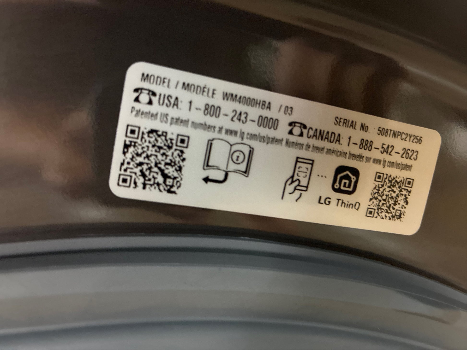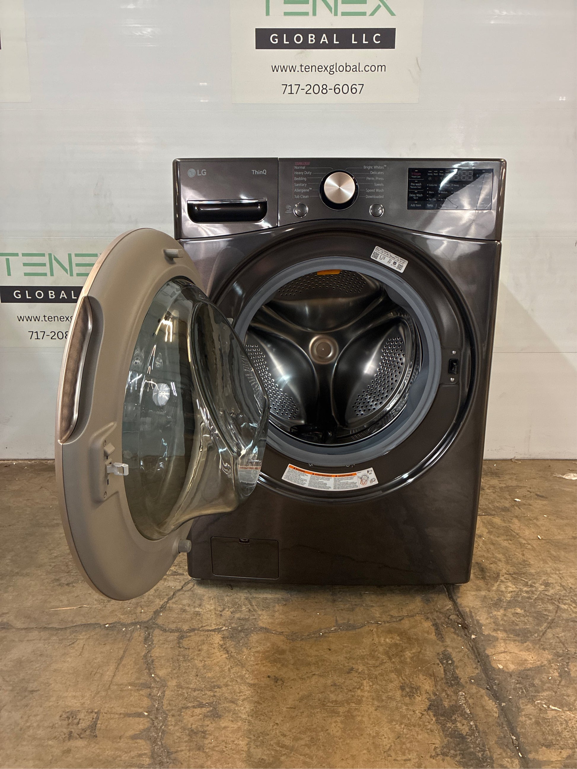 When sleek good looks meet powerful cleaning and intelligent performance, you'll experience laundry on a whole new level. TurboWash 360 cleans larger loads fast so you get more done while enjoying the same great washing performance. And forget about endless sorting-AI technology uses built-in sensors to detect fabric texture and load size and then automatically selects the right settings for advanced fabric care. Activate Smart Pairing in the ThinQ app, and the washer can even tell the dryer to select a compatible drying cycle, making it the ultimate laundry hack. The gentle power of steam reduces common household allergens in fabrics by more than 95%. Durable and stylish tempered glass door with rose gold accents adds the perfect finish. Based on certification by the Asthma and Allergy Foundation of America (AAFA). 4.5 cu. ft. pedestal compatible or stackable LG front load washer. LG washer & dryer- pair w/ elec. DLEX4000B or gas DLGX4001B dryer. With TurboWash 360 , you can clean larger loads under 30 minutes. Save time and wash fewer loads every week - bring on big loads of towels or jeans - this ultra large (4.5 cu. ft.) washer fits more in every load up to 20 lbs. 5 powerful jets with variable sprays surround clothes from multiple angles so detergent can penetrate deep into fabrics for a complete clean-even for big loads-in under 30 minutes. Built-in intelligence takes out the guesswork, AI technology selects optimal wash motions and settings - washer can auto-select a compatible drying cycle. AAFA certified LG washers with the Allergiene Cycle use the power of steam to remove over 95% of dust, pet dander and pollen. Real tempered glass door provides a sleek, stylish look that also resists shock and scratches. Speedwash Cycle gets small loads clean and refreshed in just 15 minutes. Cold wash without compromise - Coldwash technology penetrates deep into fabrics, for cold water savings with warm water performance. This LG high efficiency washer uses far less water and energy than a conventional washer for savings that add up with each load. Wash small loads that can't wait or 2 loads at once with the LG sidekick pedestal washer. More style, less space, LG closet-depth washers and dryers have a shallower depth to fit in more places and add sleek style to any room. The full stainless steel tub avoids the chips and nicks that can snag fabrics and ruin expensive clothing, durable surface actually gets smoother over time and keeps your washer looking like new, even after years of use. Tubclean cycle thoroughly cleans and dries the tub, door and gaskets with the press of a button. LG Truebalance anti-vibration system is designed to reduce washer noise and vibration for smooth, quiet performance. Amperage (A): 10 A. Appliance Category: Washer. Appliance Series: Not Applicable. Appliance Type: Front Load Washer. Color/Finish: Black Steel. Color/Finish Family: Black Stainless Steel. Control Type: Electronic. Door Material: Glass. Door Shape: Round Door. Door Style: Left Swing. Energy Consumption (kWh/year): 105. Energy Efficiency Tier Rating: Tier II. Hardware Color/Finish: None. Hardware Color/Finish Family: None. Included: Hardware. Maximum Spin Speed (RPM): 1300. Number of Rinse Cycles: 12. Number of Rinse Temperatures: 5. Number of Wash Cycles: 12. Number of Wash Speeds: 5. Number of Wash Temperatures: 5. Pedestal Model#: WDP6B. Power Options: Touch. Product Weight (lb.): 187.4 lb. Remote Access: Remote Access. Requires Hub?: No Hub Required. Smart Home: Smart Home Enabled. Smart Home Protocol: Wi-Fi. Stackable: Stackable. Stacking Kit Model#: KSTK4. Steam Function: Steam. Voice Control Hub Required: No Hub Required for Voice Control. Voltage (volts): 120. Wash Cycles: Allergen, Bedding, Cold, Delicates, Extra Rinse, Heavy Duty, Normal, Permanent Press, Prewash, Rinse & Spin, Sanitize, Speed Wash, Towels and Sheets, Tub Clean, Whites. Washer Dispensers: Bleach, Fabric Softener, Liquid Detergent, Prewash Detergent. Washer Features: Add Garment (pause), Control Lock, Delay Start, Wi-Fi Enabled. Washer Tub/Drum Material: Stainless Steel Drum. Works With: Alexa, Google, SmartThinQ. Certifications and Listings: Energy Star, UL Listed. Capacity - Washer (cu. ft.): 4.5. Depth With Door Open 90 Degrees (in.): 55 in. Door Opening Height (In.): 16.93. Door Opening Width (In.): 16.93. Product Depth (in.): 30.25 in. Product Height (in.): 39 in. Product Width (in.): 27 in.