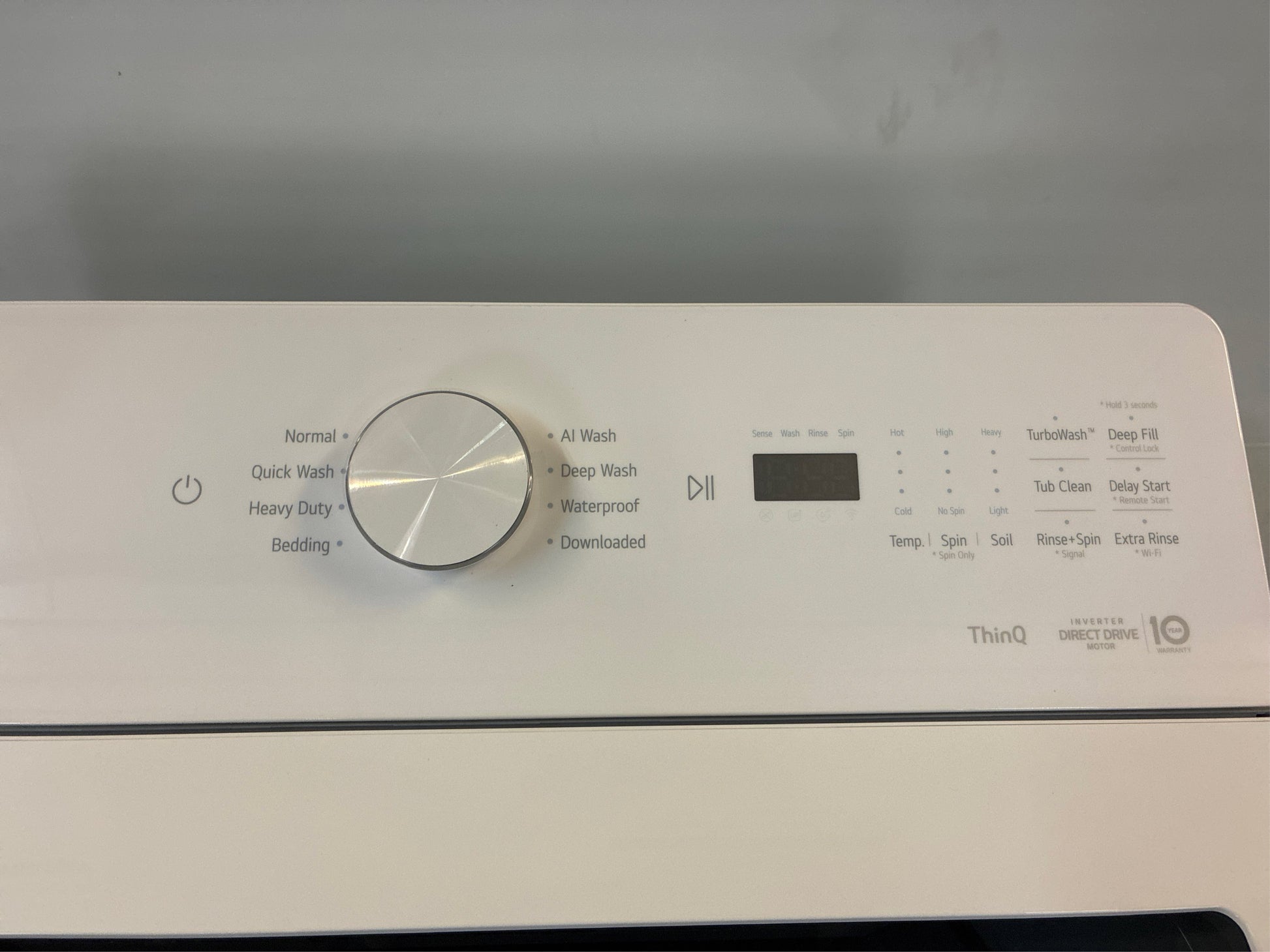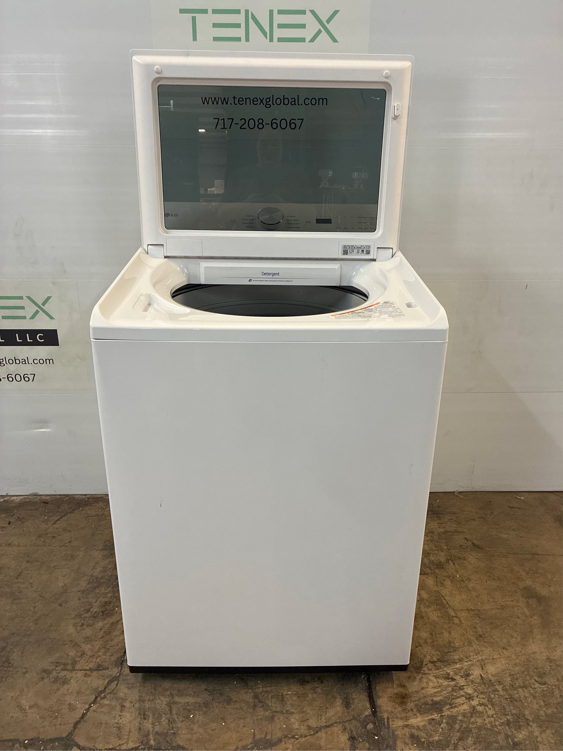 Outfitted with features you'd expect to find on higher-end models, this LG top load washer is an instant upgrade for any laundry space. Easily reach items at the bottom of the tub and leave no sock behind with LG's ergonomic EasyUnload angled front. Take control with the electronic dial and touch panel or select AI Wash and let built-in intelligence choose just the right settings for you. A choice of finishes and sleek, modern design make this washer an easy choice.. Agitator/Impeller Type: Impeller. Amperage (A): 5 A. Appliance Category: Washer. Appliance Series: Not Applicable. Appliance Type: Top Load Washer. Color/Finish: Alpine White. Color/Finish Family: White. Control Type: Electro-Mechanical. Door Material: Glass. Energy Consumption (kWh/year): 120. Energy Efficiency Tier Rating: Not CEE rated. Hardware Color/Finish: Alpine White. Hardware Color/Finish Family: White. Included: No Additional Items Included. Maximum Spin Speed (RPM): 800. Number of Rinse Cycles: 9. Number of Rinse Temperatures: 5. Number of Wash Cycles: 8. Number of Wash Speeds: 5. Number of Wash Temperatures: 5. Product Weight (lb.): 130 lb. Returnable: Non-Returnable. Stackable: Not Stackable. Steam Function: No Steam. Voltage (volts): 120. Wash Cycles: Bedding,Cold,Delicates,Extra Rinse,Heavy Duty,Rinse & Spin,Soak,Speed Wash,Tub Clean. Washer Dispensers: Bleach,Fabric Softener,Liquid Detergent,Powdered Detergent. Washer Features: Anti Vibration,Control Lock,Delay Start,Door Window,End-Of-Cycle Signal,Rear Control,Remote Diagnostics,Soft Close Lid,Spin Speed Option. Washer Tub/Drum Material: Stainless Steel Drum. Certifications and Listings: CSA Listed,Energy Star,NSF Certified. Capacity - Washer (cu. ft.): 5.0. Height With Lid Open 90 Degrees (In): 57.20. Product Depth (in.): 28.38 in. Product Height (in.): 43 in. Product Width (in.): 27 in. Capacity (cu. ft.): 5.0. Agitator/Impeller Type: Impeller. Features: Anti Vibration. Features: End-Of-Cycle Signal. Features: Spin Speed Option. Features: Soft Close Lid. Features: Door Window. Features: Delay Start