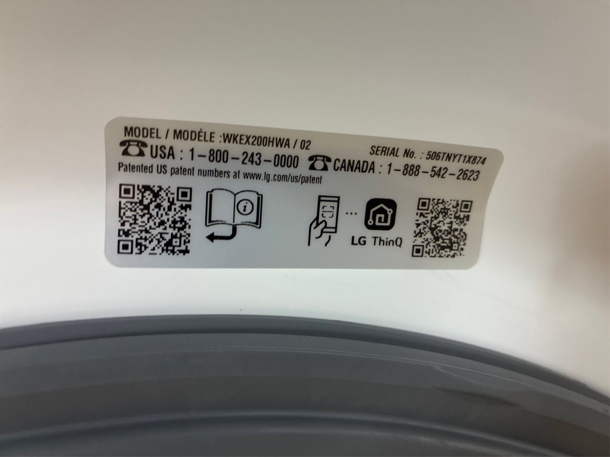 Full-size and fully featured, with the washer on the bottom and dryer on top, the sleek single unit LG WashTower takes up half the space, giving you room to add a sink, a folding table or whatever you like. But unlike conventional stacked pairs, LG's exclusive Center Control panel is perfectly positioned with both washer and dryer controls at just the right height. Built-in intelligence makes laundry less of a chore by taking out the guesswork, while top-of-the-line innovations put advanced cleaning power within reach.. Agitator/Impeller Type: Impeller. Amperage (A): 30 A. Appliance Series: Not Applicable. Appliance Type: Washer & Dryer Combo. Capacity - Dryer (cu. ft.): 7.4. Color/Finish: White. Color/Finish Family: White. Control Type: Electronic. Door Material: Glass. Dry Cycles: Bedding,Cotton,Delicates,Heavy Duty,Quick Dry,Wrinkle Free. Dryer Door Style: Left Swing. Dryer Drum Material: Stainless Steel Drum. Dryer Features: Adjustable End-of-Cycle Signal,Control Lock,Four-Way Venting,Interior Light,Wi-Fi Enabled. Dryer Fuel Type: Electric. Energy Consumption (kWh/year): 105. Energy Efficiency Tier Rating: Tier II. Exhaust Vent Location: Left Side,Rear,Right Side. Hardware Color/Finish: None. Hardware Color/Finish Family: None. Included: Hardware. Lint Filter Location: Front. Maximum Spin Speed (RPM): 1300. Number of Drying Cycles: 9. Number of Drying Temperatures: 5. Number of Rinse Cycles: 5. Number of Rinse Temperatures: 5. Number of Wash Cycles: 10. Number of Wash Speeds: 5. Number of Wash Temperatures: 5. Power Options: Plug-in. Product Weight (lb.): 326 lb. Remote Access: No Remote Access. Requires Hub?: No Hub Required. Returnable: Non-Returnable. Smart Home: Smart Home Enabled. Smart Home Protocol: Wi-Fi. Steam Function: Steam. Vent Type: Vented. Voice Control Hub Required: No Hub Required for Voice Control. Voltage (volts): 240. Wash Cycles: Bedding,Delicates,Extra Rinse,Extra Spin,Heavy Duty,Normal,Prewash,Sanitize,Speed Wash,Tub Clean. Washer Dispensers: Bleach,Fabric Softener,Liquid Detergent,Prewash Detergent. Washer Features: Control Lock,Door Window,End-Of-Cycle Signal,Interior Light,Wi-Fi Enabled. Washer Tub/Drum Material: Stainless Steel Drum. Works With: Alexa, Alexa, Google, Google Assistant. Certifications and Listings: Energy Star,UL Listed. Capacity - Washer (cu. ft.): 4.5. Depth With Door Open 90 Degrees (in.): 55 in. Door Opening Height (In.): 16.06. Door Opening Width (In.): 16.06. Dryer Door Opening Height (in.): 16.06. Dryer Door Opening Width (in.): 16.06. Product Depth (in.): 30.38 in. Product Height (in.): 74.38 in. Product Width (in.): 27 in. Capacity (cu. ft.): 4.5. Dryer Fuel Type: Electric. Vent Type: Vented. Width (in.): 27 in. Depth (in.): 30.38 in. Features: Door Window. Features: End-Of-Cycle Signal. Features: Wi-Fi Enabled