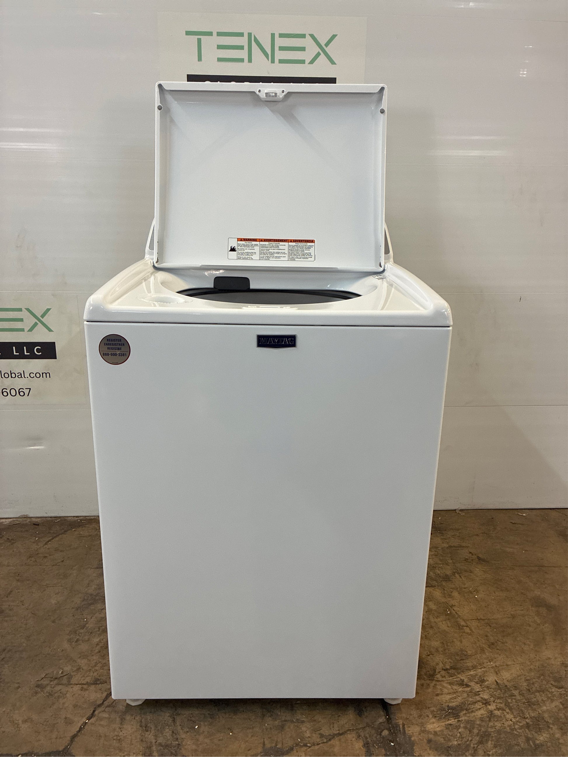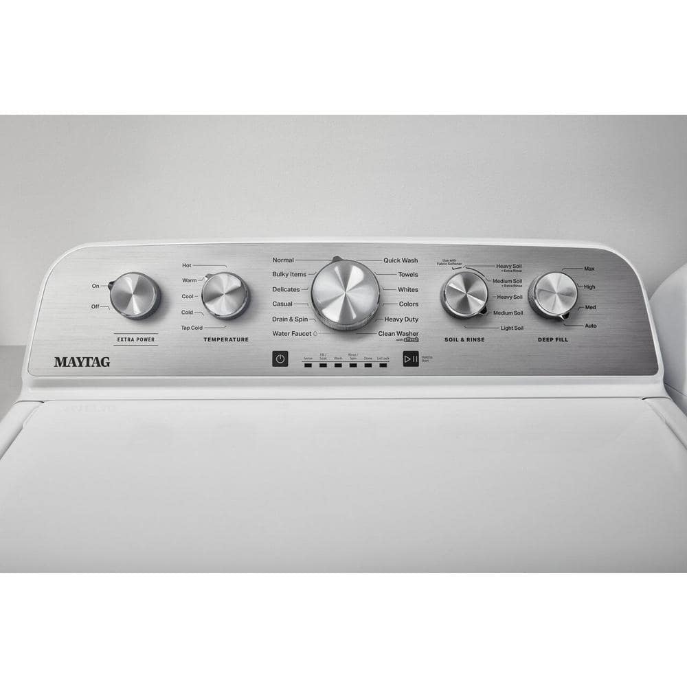 The Maytag 4.5 cu. ft. capacity washer with Extra Power delivers boosted stain fighting on any wash cycle while the Power agitator uses a 360-degree wash action to break up messes. This Deep Fill washer delivers more water when you want it while the built-in water faucet rinses, spot treats or soaks clothes right in this heavy duty washing machine. High Efficiency and money saving.. Agitator/Impeller Type: Agitator. Amperage (A): 20 A. Appliance Category: Washer. Appliance Series: Not Applicable. Appliance Type: Top Load Washer. Color/Finish: White. Color/Finish Family: White. Control Type: Electronic. Door Material: Metal. Energy Consumption (kWh/year): 281. Energy Efficiency Tier Rating: Not CEE rated. Hardware Color/Finish: White. Hardware Color/Finish Family: White. Included: Hoses,Power Cord. Maximum Spin Speed (RPM): 660. Number of Rinse Cycles: 2. Number of Rinse Temperatures: 1. Number of Wash Cycles: 11. Number of Wash Speeds: 2. Number of Wash Temperatures: 5. Product Weight (lb.): 152 lb. Returnable: Non-Returnable. Stackable: Not Stackable. Steam Function: No Steam. Voltage (volts): 120. Wash Cycles: Bulky Items,Cold,Deep Fill,Drain & Spin,Handwashable,Heavy Duty,Rinse & Spin,Soak,Specialty,Towels and Sheets,Whites. Washer Dispensers: Bleach,Fabric Softener. Washer Features: Automatic Temperature Control,Cycle Status Indicator,Rear Control. Washer Tub/Drum Material: Stainless Steel Drum. Certifications and Listings: UL Listed. Capacity - Washer (cu. ft.): 4.5. Height With Lid Open 90 Degrees (In): 51.25. Product Depth (in.): 28 in. Product Height (in.): 42.75 in. Product Width (in.): 27.25 in. Capacity (cu. ft.): 4.5. Agitator/Impeller Type: Agitator. Features: Cycle Status Indicator. Stackable: Not Stackable. Appliance Type: Top Load Washer. Features: Automatic Temperature Control. Width (in.): 27.25 in. Features: Rear Control