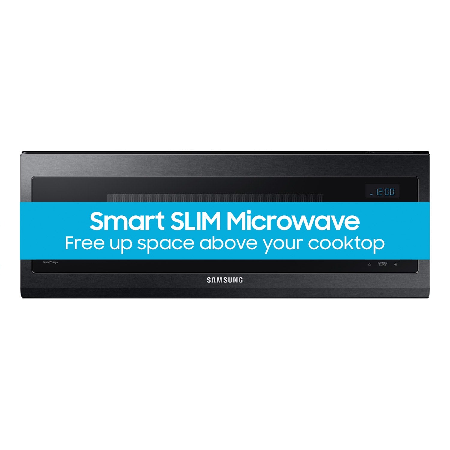 Free up space above your cooktop with the beautifully designed 1.1 cu ft Smart SLIM Microwave; This combination microwave with hood packs powerful 400 CFM Hood Ventilation performance into a slim, space-efficient size; Adjust settings with your voice or with your smartphone by using the SmartThings App(The ceramic enamel interior and fingerprint resisitant finish makes cleaning up effortless).