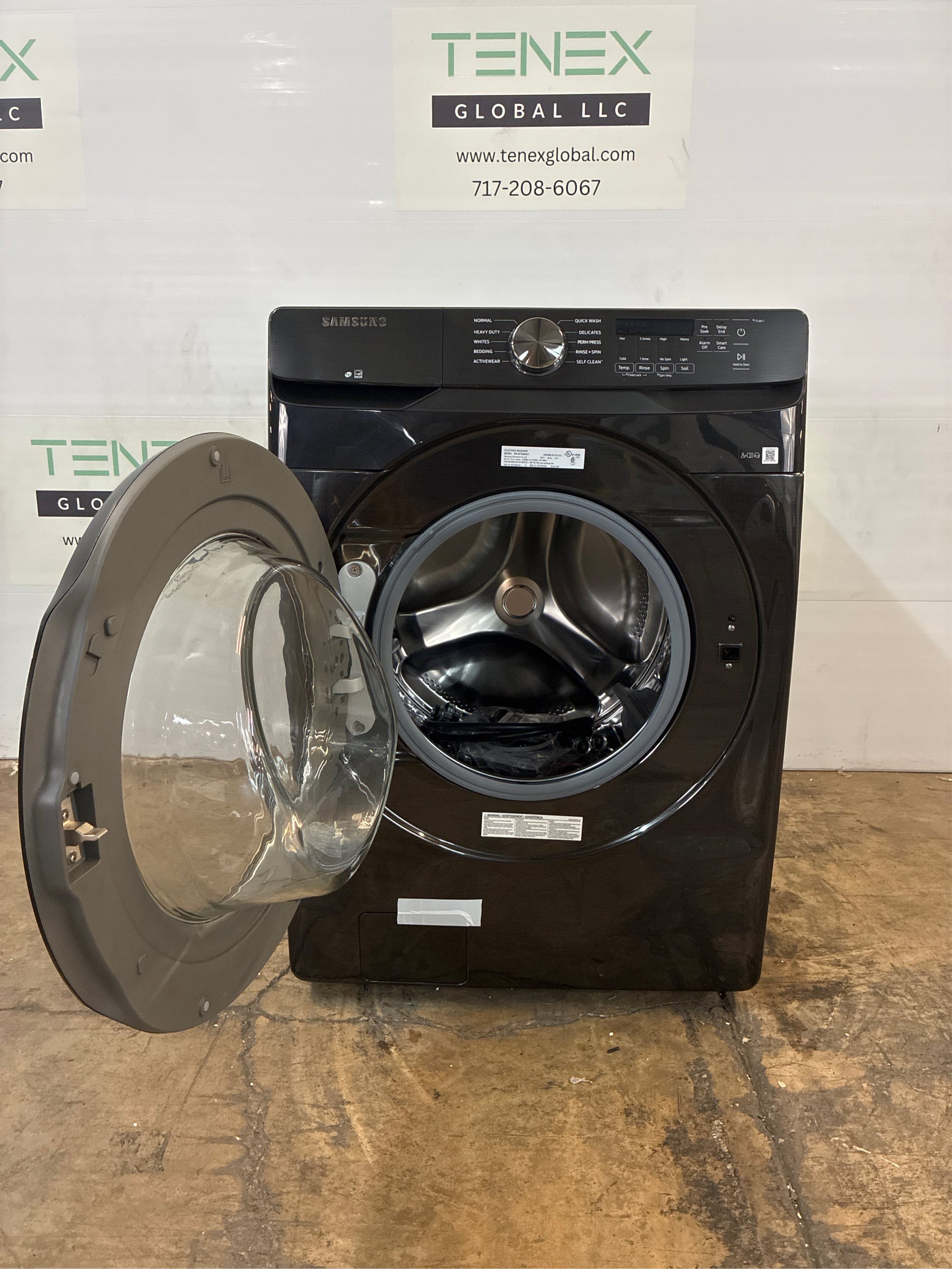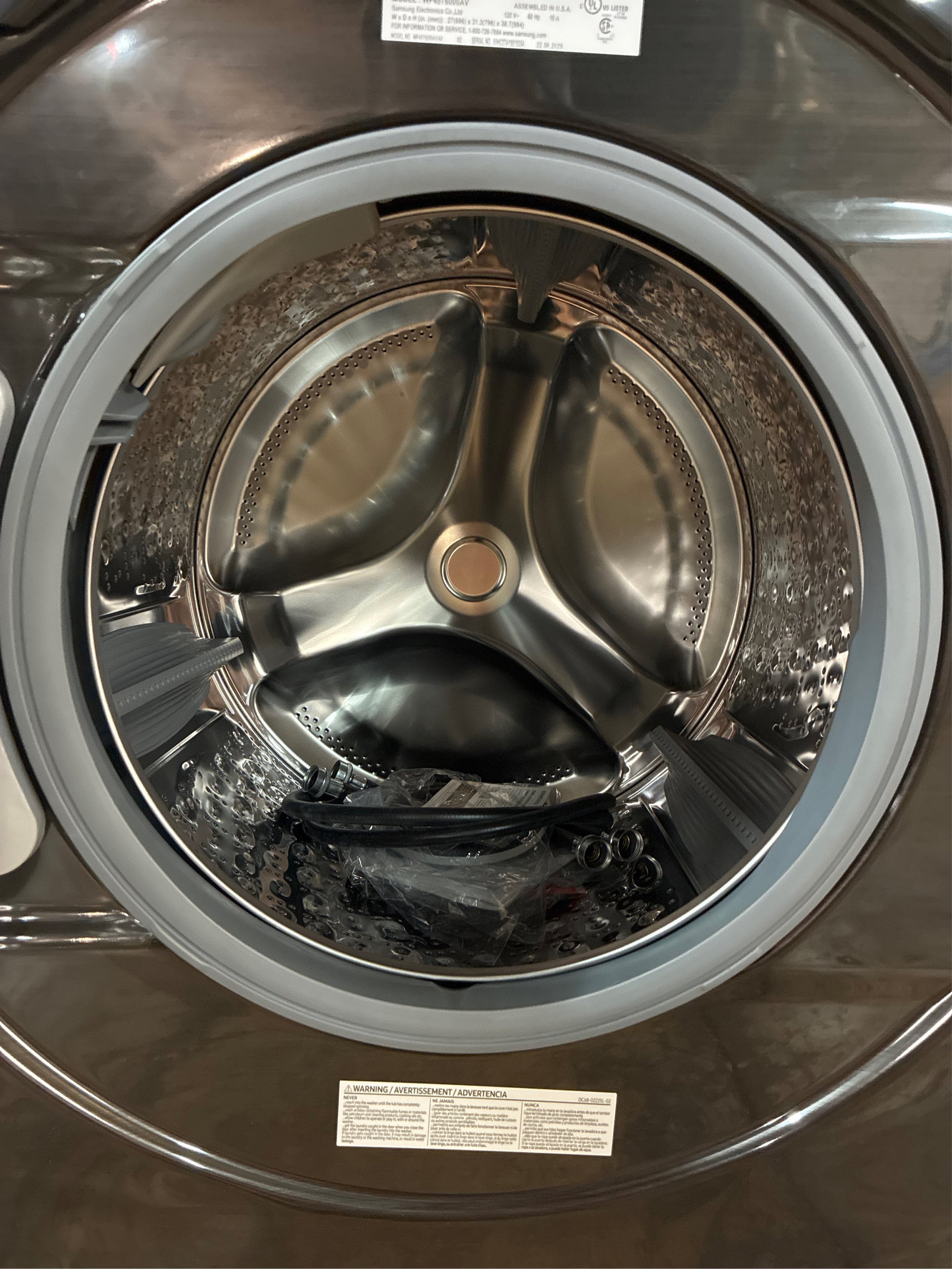 Samsung's ENERGY STAR Certified Front Load washer has 4.5 cu. ft. capacity to fit more in every load and cut down on laundry time. It is equipped with Vibration Reduction Technology+ to reduce noise for quiet washing and features Self Clean+ to eliminate 99% of bacteria that can form in the drum. Closet-Depth Fit gives your home a sleek, modern look with a seamless design.. Amperage (A): 15 A. Appliance Category: Washer. Appliance Series: Not Applicable. Appliance Type: Front Load Washer. Color/Finish: Brushed Black. Color/Finish Family: Black Stainless Steel. Control Type: Electro-Mechanical. Door Material: Glass. Door Shape: Round Door. Door Style: Left Swing. Energy Consumption (kWh/year): 90. Energy Efficiency Tier Rating: Tier I. Hardware Color/Finish: Black. Hardware Color/Finish Family: Black. Included: Power Cord. Maximum Spin Speed (RPM): 1200. Number of Rinse Cycles: 5. Number of Rinse Temperatures: 5. Number of Wash Cycles: 10. Number of Wash Speeds: 5. Number of Wash Temperatures: 6. Pedestal Model#: WE402NW. Product Weight (lb.): 200 lb. Returnable: Non-Returnable. Stackable: Stackable. Stacking Kit Model#: SKK-8K. Steam Function: No Steam. Voltage (volts): 120. Wash Cycles: Active Wear,Bedding,Delicates,Heavy Duty,Normal,Permanent Press,Rinse & Spin,Whites. Washer Dispensers: Bleach,Fabric Softener,Liquid Detergent,Powdered Detergent. Washer Features: Adjustable Legs,Anti Vibration,Control Lock,Door Window,End-Of-Cycle Signal,Front Control. Washer Tub/Drum Material: Stainless Steel Drum. Certifications and Listings: ADA Compliant,Energy Star. Capacity - Washer (cu. ft.): 4.5. Depth With Door Open 90 Degrees (in.): 52.68 in. Door Opening Height (In.): 23.46. Door Opening Width (In.): 23.48. Product Depth (in.): 31.34 in. Product Height (in.): 38.75 in. Product Width (in.): 27 in. Capacity (cu. ft.): 4.5. Stackable: Stackable. Features: Anti Vibration. Appliance Type: Front Load Washer. Features: Front Control. Voltage (volts): 120. Features: End-Of-Cycle Signal. Features: Door Window