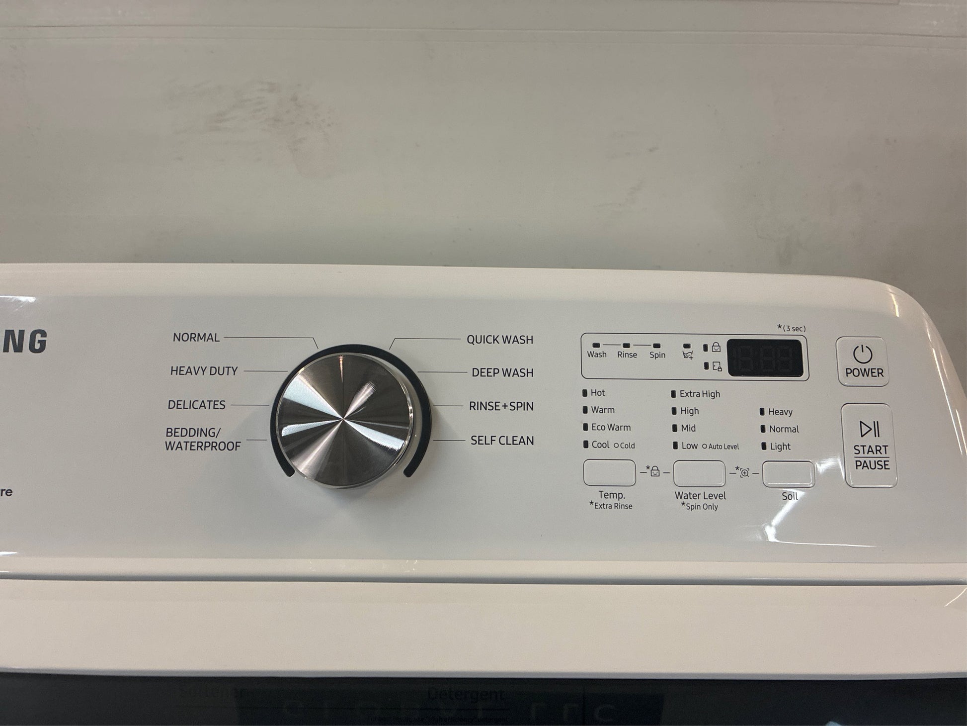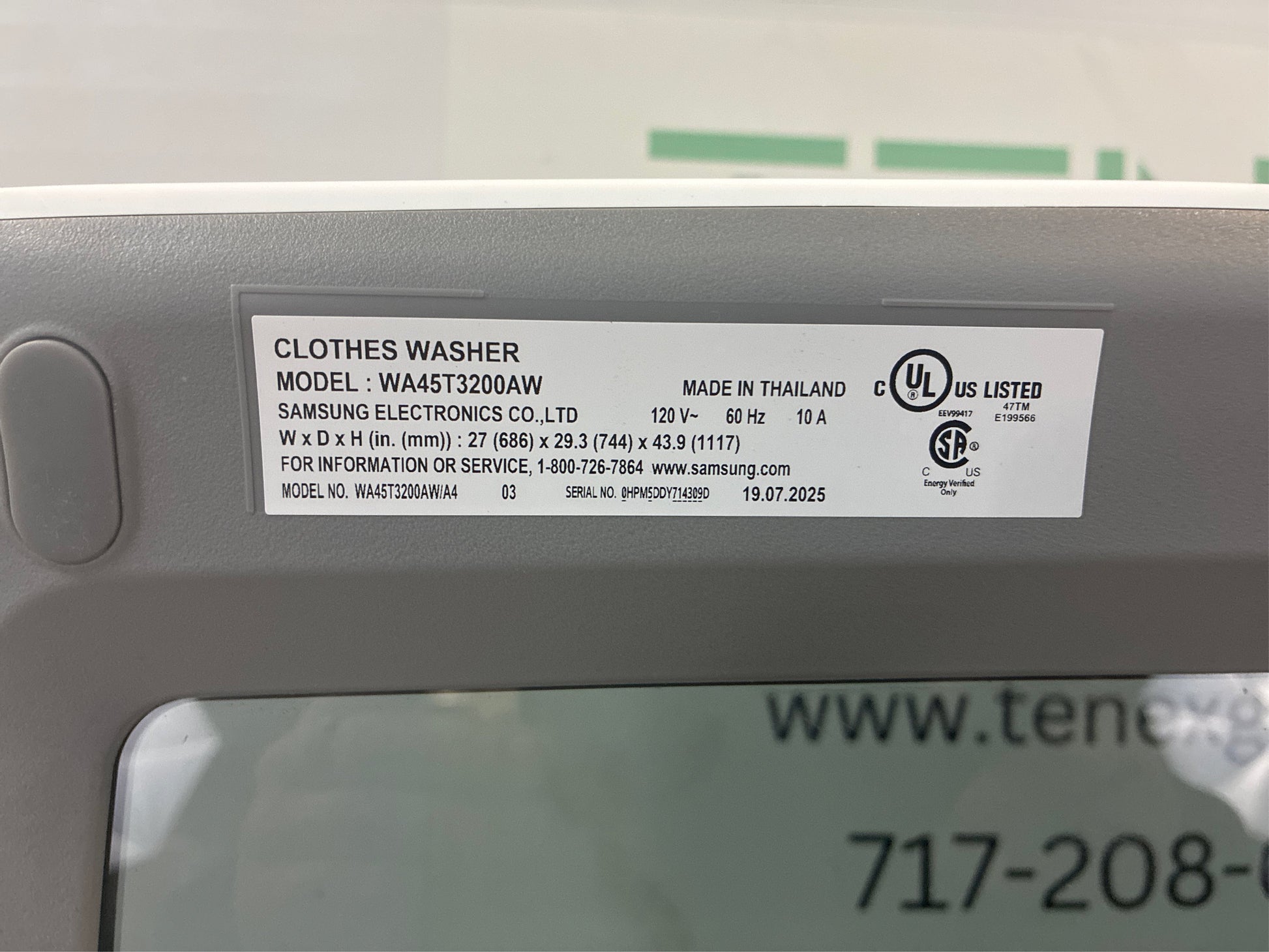 Samsung's Large 4.5 cu. ft. Capacity Top Load washer fits more in every load and cuts down on laundry time. It is equipped with Vibration Reduction Technology plus to reduce noise for quiet washing and features Self Clean to eliminate bacteria from the drum. Self Clean - Eliminates dirt and bacteria to keep your washer fresh and clean. 4.5 cu ft Capacity washes more at one time. Pairs best with Electric DVE45T3200W or Gas DVG45T3200W Dryer(s). VRT Technology reduces noise and vibration. Large 4.5 cu. ft. Capacity - Fewer loads, less time in the laundry room and more time doing the things you love. Vibration Reduction Technology+ reduces noise and vibration for quiet washing. Self Clean - Eliminates dirt and bacteria to keep your washer fresh and clean. Soft Close Lid - keeps you and your family protected by closing safely, gently and quietly. Extra High Water Level - Ensure that all of your items are thoroughly soaked by selecting Extra High Water Level before starting your laundry. Smart Care means easy troubleshooting from the convenience of your smartphone. Smart Care interacts with your washer and dryer to perform an immediate diagnosis and offer quick solutions. The diamond drum interior helps extend clothing life by treating fabrics gently. Small water holes help prevent fabrics from snagging and being damaged, allowing fabric care with deep-clean results. 5 Temperature Levels - Select the ideal temperature to wash your clothes gently and thoroughly. 700 RPM Maximum Spin Speed extracts more water to reduce drying time. Dispenser Trays: Main Wash,Softener, Bleach. LED Display: Red. Child lock - allows you to lock the buttons on your machine so the cycle you've chosen can't be changed mid-cycle. Matching Dryers - DVE45T3200W and DVG45T3200W. Click here to shop more Samsung appliances . Click here for more information on Electronic Recycling Programs . Agitator/Impeller Type: Impeller. Amperage (A): 15 A. Appliance Category: Washer. Appliance Series: Not Applicable. Appliance Type: Top Load Washer. Color/Finish: White. Color/Finish Family: White. Control Type: Electro-Mechanical. Door Material: Glass. Energy Consumption (kWh/year): 240. Energy Efficiency Tier Rating: Not CEE rated. Hardware Color/Finish: White. Hardware Color/Finish Family: White. Included: Power Cord. Maximum Spin Speed (RPM): 700. Number of Rinse Cycles: 4. Number of Rinse Temperatures: 5. Number of Wash Cycles: 8. Number of Wash Speeds: 4. Number of Wash Temperatures: 5. Product Weight (lb.): 134.5 lb. Stackable: Not Stackable. Steam Function: No Steam. Voltage (volts): 120. Wash Cycles: Bedding,Deep Fill,Delicates,Heavy Duty,Normal,Rinse & Spin. Washer Dispensers: Bleach,Fabric Softener,Liquid Detergent. Washer Features: Adjustable Legs,Anti Vibration,Control Lock,Control Sounds On/Off,Cycle Status Indicator,Door Window,End-Of-Cycle Signal,Rear Control,Soft Close Lid,Spin Speed Option. Washer Tub/Drum Material: Stainless Steel Drum. Certifications and Listings: UL Listed. Capacity - Washer (cu. ft.): 4.5. Height With Lid Open 90 Degrees (In): 59.25. Product Depth (in.): 29.3 in. Product Height (in.): 44 in. Product Width (in.): 27 in