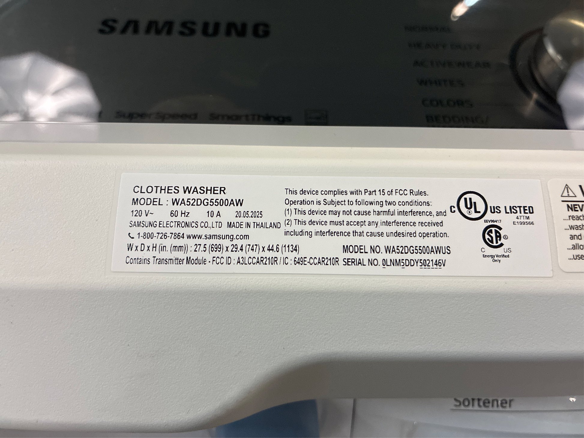 The Samsung 5.2 cu. ft. Large Capacity Top Load Washing Machine is equipped with Super Speed Wash, which powerfully cleans a full load of laundry in just 28 minutes without sacrificing cleaning performance.*This Wi-Fi connected machine lets you start, stop, or delay your smart washer from our simple-to-use SmartThings app.** Based on using Super Speed on a Normal Cycle with an 8lb load.**Available on Android and iOS devices. A Wi-Fi connection and a Samsung account are required.** Large 5.2 cu. ft. capacity top load Samsung washer. Pairs with electric DVE52A5500V or gas DVG52A5500V dryers. Super speed can thoroughly wash a full load in just 28-minutes. Large 5.2 cu. ft. Capacity means fewer loads, less time in the laundry room. Super Speed Wash for powerful cleaning in just 28 minutes.**Based on using Super Speed on a Normal Cycle with an 8lb load. Wi-Fi Connectivity With SmartThings allows the SmartThings App to send you end of cycle notifications and lets you remotely start, stop, or delay your washer from your phone.* *Available on Android and iOS devices. A Wi-Fi connection and a Samsung account are required. Active WaterJet is a built-in water faucet that lets you easily pretreat heavily soiled and stained clothes. EZ Access Tub lets you easily reach the bottom of the washer tub. Select the Deep Fill option to maximize the water level during the washing cycle.**Not available for use in the Bedding/Waterproof and Self Clean cycles. Vibration Reduction Technology+ reduces noise and vibration for quiet washing. Swirl+ Tub Interior is an Improved tub pattern that draws out water more quickly and helps prevent snags. Self Clean keeps your washer tub fresh and clean. Soft-Close Lid closes safely, gently and quietly. ENERGY STAR Certified* means eco-friendly and energy-efficient washers.*Visit www.energystar.gov for more information on ENERGY STAR guidelines. Smart Care for easy troubleshooting of your smart Top Load Washer from the convenience of your smartphone.**Requires Samsung Smart Washer/Dryer App. The Samsung Smart Washer/Dryer App supports Android OS 2.3.6 or later and iOS 3 or later for iPhone models. Samsung Smart Washer/Dryer App available in App Store and Play Store. Agitator/Impeller Type: Impeller. Amperage (A): 15 A. Appliance Category: Washer. Appliance Series: Not Applicable. Appliance Type: Top Load Washer. Color/Finish: White. Color/Finish Family: White. Control Type: Electro-Mechanical. Door Material: Glass. Energy Consumption (kWh/year): 120. Energy Efficiency Tier Rating: Not CEE rated. Hardware Color/Finish: White. Hardware Color/Finish Family: White. Included: Hoses, Power Cord. Maximum Spin Speed (RPM): 750. Number of Rinse Cycles: 2. Number of Rinse Temperatures: 5. Number of Wash Cycles: 12. Number of Wash Speeds: 5. Number of Wash Temperatures: 5. Power Options: Plug-in. Product Weight (lb.): 134.5 lb. Remote Access: Remote Access. Requires Hub?: No Hub Required. Smart Home: Smart Home Enabled. Smart Home Protocol: Wi-Fi. Stackable: Not Stackable. Steam Function: No Steam. Voice Control Hub Required: Voice Control via Proprietary App. Voltage (volts): 120. Wash Cycles: Active Wear, Bedding, Colors, Delicates, Heavy Duty, Normal, Rinse & Spin, Whites. Washer Dispensers: Bleach. Washer Features: Adjustable Legs, Anti Vibration, Control Lock, Control Sounds On/Off, Cycle Status Indicator, Delay Start, Door Window, End-Of-Cycle Signal, High-Efficiency Detergent Required, Rear Control, Remote Diagnostics, Soft Close Lid, Spin Speed Option, Wi-Fi Enabled. Washer Tub/Drum Material: Stainless Steel Drum. Works With: Alexa, Google Assistant, Homey, Samsung SmartThings. Certifications and Listings: Energy Star. Capacity - Washer (cu. ft.): 5.2. Height With Lid Open 90 Degrees (In): 58.3. Product Depth (in.): 29.43 in. Product Height (in.): 44.68 in. Product Width (in.): 27.56 in.