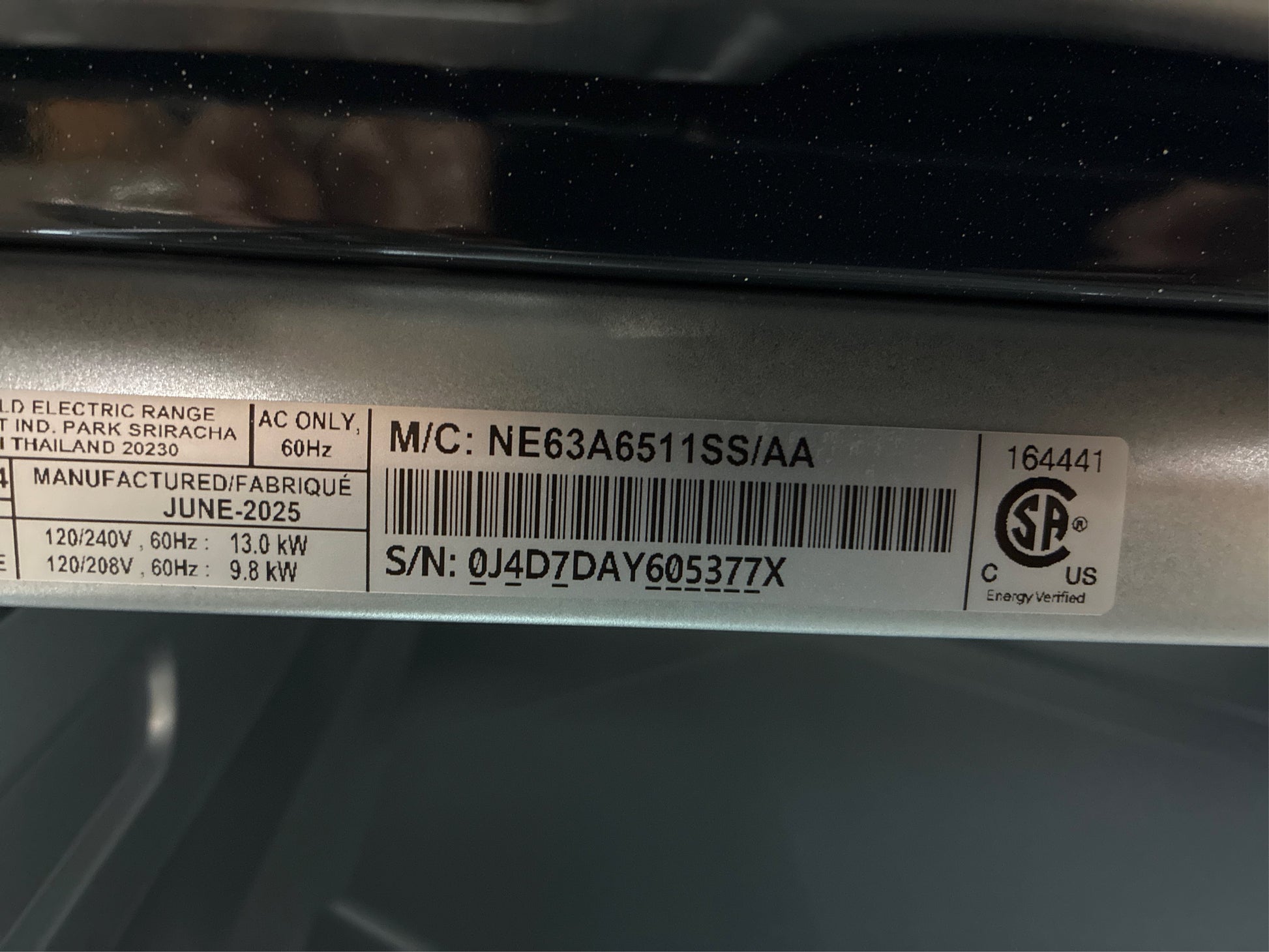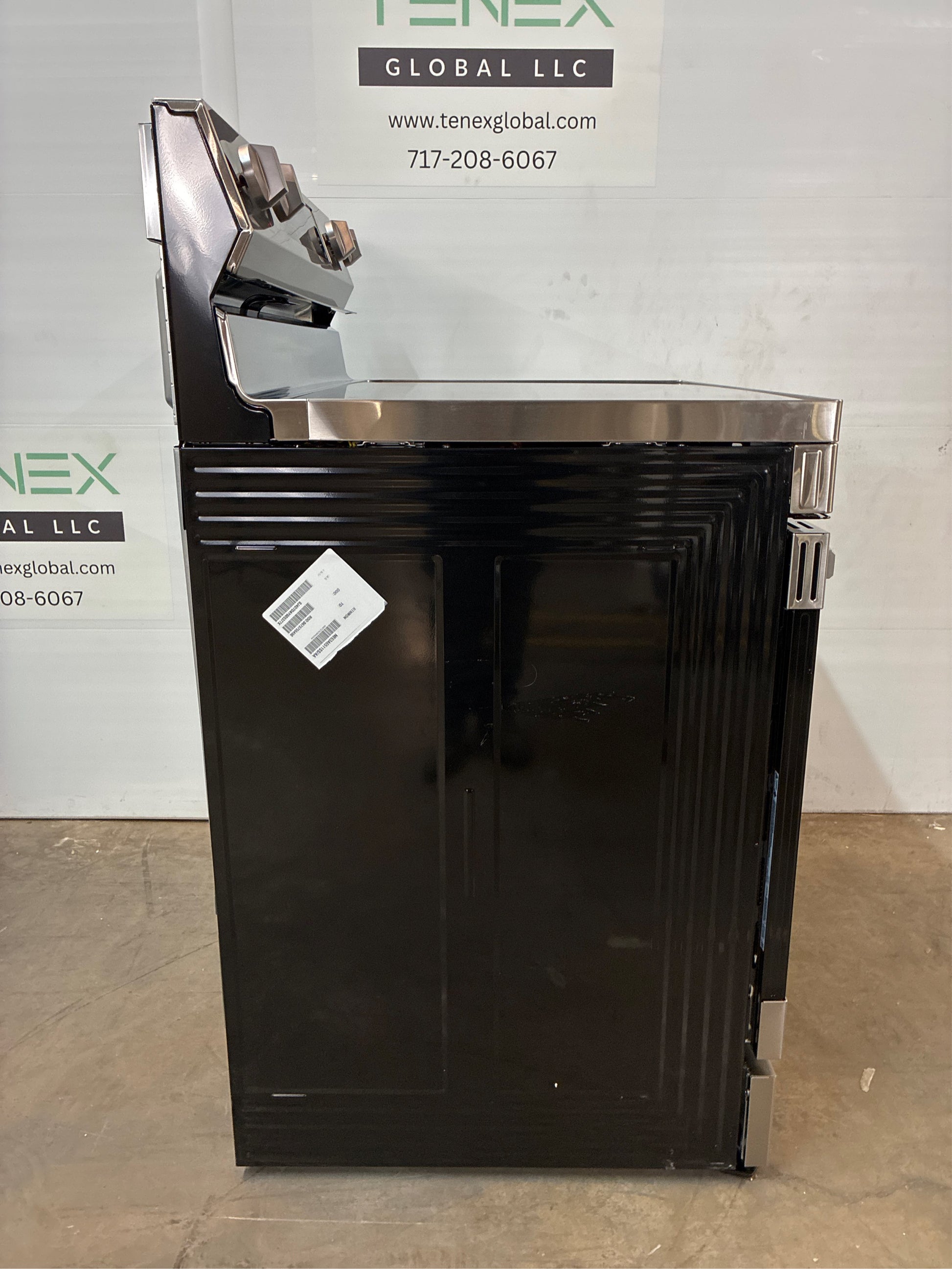 Elevate the look of your kitchen with Samsung's new Smart Freestanding Electric Range. Our Stainless Steel design elegantly wraps around cooktop sides and up through the slim control panel. Upgraded technology makes cooking simple and fun.. Elevated design. No Preheat Air Fry: Healthier cooking with a crunch. Makes cooking simple with smart technology. Our Stainless Steel design elegantly wraps around cooktop sides and up through slim control panel, elevating look of any kitchen. No preheat Air Fry is a healthier way to prepare your favorite fried foods right in your oven with little to no oil, Air Fry tray not included, As compared to deep frying. Wi-Fi and Voice Enabled allows you to preheat, monitor and adjust time and temperature of your oven from wherever you are using your smartphone. Powerful Convection+ saves you time by cooking food fast and more evenly. Large 6.3 cu. ft. oven can fit multiple dishes at one time, and can easily accommodate big casserole dishes and large roasting pans. Boil water fast with the 3300-Watt Rapid Boil burner. Fingerprint resistant for an everyday beautiful finish. 5-burner cooktop includes adjustable medium and large dual ring burners. Prepare foods with the aid of easy preset buttons, 4-preset buttons include: Bread Proof, Dehydrate, Keep Warm and Favorite Cook. Samsung's SmartThings Cooking service makes meal planning a seamless process, Search, plan, purchase and prep weekly meals via the SmartThings app on your Family Hub or smartphone, Available on Android or IOS devices, A Wi-Fi connections and a Samsung account are required. Keep your oven spotless with the Self and Steam Clean. Also available in black stainless, white, and black finishes. Click here to shop more Samsung appliances . Click here for more information on Electronic Recycling Programs . Amperage (A): 40 A. Appliance Category: Range. Appliance Series: Not Applicable. Appliance Type: Electric Range. Capacity of Oven (cu. ft.): 6.3 cu ft. Capacity of Oven (cu. ft.): 6.3 cu ft.. Cleaning Type: Self Cleaning. Color of Cooktop: Black. Color/Finish: Stainless Steel. Color/Finish Family: Stainless Steel. Commercial/Residential: Residential. Control Type: Manual. Controls Location: Back Control. Cooktop Features: Standard Features Only. Cooktop Surface Type: Glass Top. Drawer Type: Lower Storage Drawer. Element No.1 Type: Radiant. Element No.1 Wattage: 3300. Element No.2 Type: Radiant. Element No.2 Wattage: 1200. Element No.3 Type: Radiant. Element No.3 Wattage: 3300. Element No.4 Type: Radiant. Element No.4 Wattage: 1200. Element No.5 Type: Radiant. Element No.5 Wattage: 100. Fuel Type: Electric. Hardware Color/Finish: Stainless Steel. Hardware Color/Finish Family: Stainless Steel. Included: No Additional Items Included. Number of Elements: 5 element. Number of Oven Racks: 2. Number of Rack Positions: 8. Oven Cleaning Options: Self-Cleaning,Steam Clean. Oven Cooking Process: Air Fry,Convection,Dehydrator Oven. Oven Features: Standard Features Only. Product Weight (lb.): 158 lb. Range Installation Type: Freestanding. Voltage (V): 240 V. Certifications and Listings: CSA Certified. Depth With Door(s) Open 90 Degrees (in.): 48 in. Element No.1 Size (in.): 12 in. Element No.2 Size (in.): 9 in. Element No.3 Size (in.): 9 in. Element No.4 Size (in.): 6 in. Element No.5 Size (in.): 7 in. Oven Interior Depth (in): 19.75. Oven Interior Height (in): 22.4. Oven Interior Width (in): 24.8. Product Depth (in.): 28.6 in. Product Height (in.): 46.6 in. Product Width (in.): 29.9 in. Range Size (Width): 30 in.