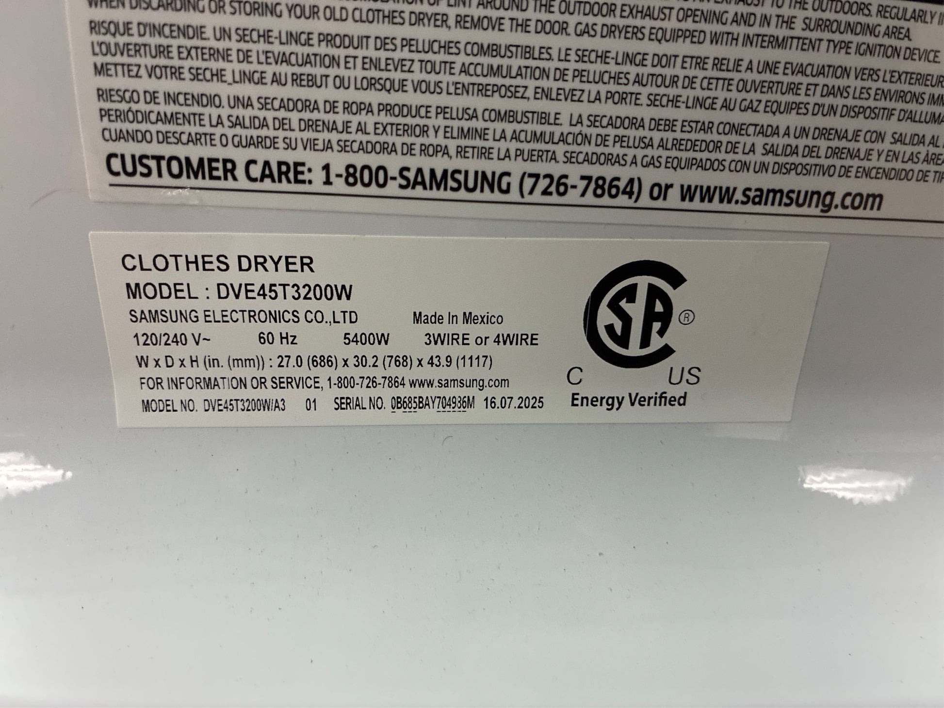 Samsung's new dryers have advanced features like Sensor Dry, which optimizes cycle time and temperature to thoroughly dry without damaging your clothes. Also, with 7.2 cu. ft. capacity and 8 Preset Drying Cycles, you can do fewer loads in less time and fulfill almost every drying need. With a reversible dryer door, you can choose the direction your dryer door opens to better suit your laundry room layout. Sensor Dry - Automatically optimizes the time and temperature of your drying cycle to protect your clothes from heat damage, while avoiding excess energy use. 8 Preset Drying Cycles - More cycles to cover almost every drying need for your active family. Reversible Dryer Door - Choose the direction your dryer door opens to better suit your laundry room layout. Smart Care - Easy troubleshooting from the convenience of your smartphone. Smart Care interacts with your washer and dryer to perform an immediate diagnosis and offer quick solutions. Lint Filter Indicator - The Filter Check Indicator light lets you know when it is time to clean the filter. 3 Additional Drying Options - In addition to the 8 preset drying cycles, you can select dryness, temperature and time options to provide optimal care for all fabric types. 4 Temperature Levels - Choose from High, Medium, Low and Extra Low temperature levels to dry your clothes gently and thoroughly. Large 7.2 cu. ft. Capacity - Fewer loads, less time in the laundry room and more time doing the things you love. Child Lock Allows you to lock the buttons on your machine so the cycle you've chosen can't be changed mid-cycle. Side-By-Side Installation Sits perfectly next to your matching washer, or in a closet or alcove. Gas Option Available Search for product DVG45T3200W. Matching Washer Available Search for product WA45T3200AW. Matching Washer Type: Top Load Matching. Stackable: Not Stackable. Vent Type: Vented. Voltage (volts): 240. Depth (in.): 30.2 in. Height (in.): 44 in. Capacity (cu. ft.): 7.2