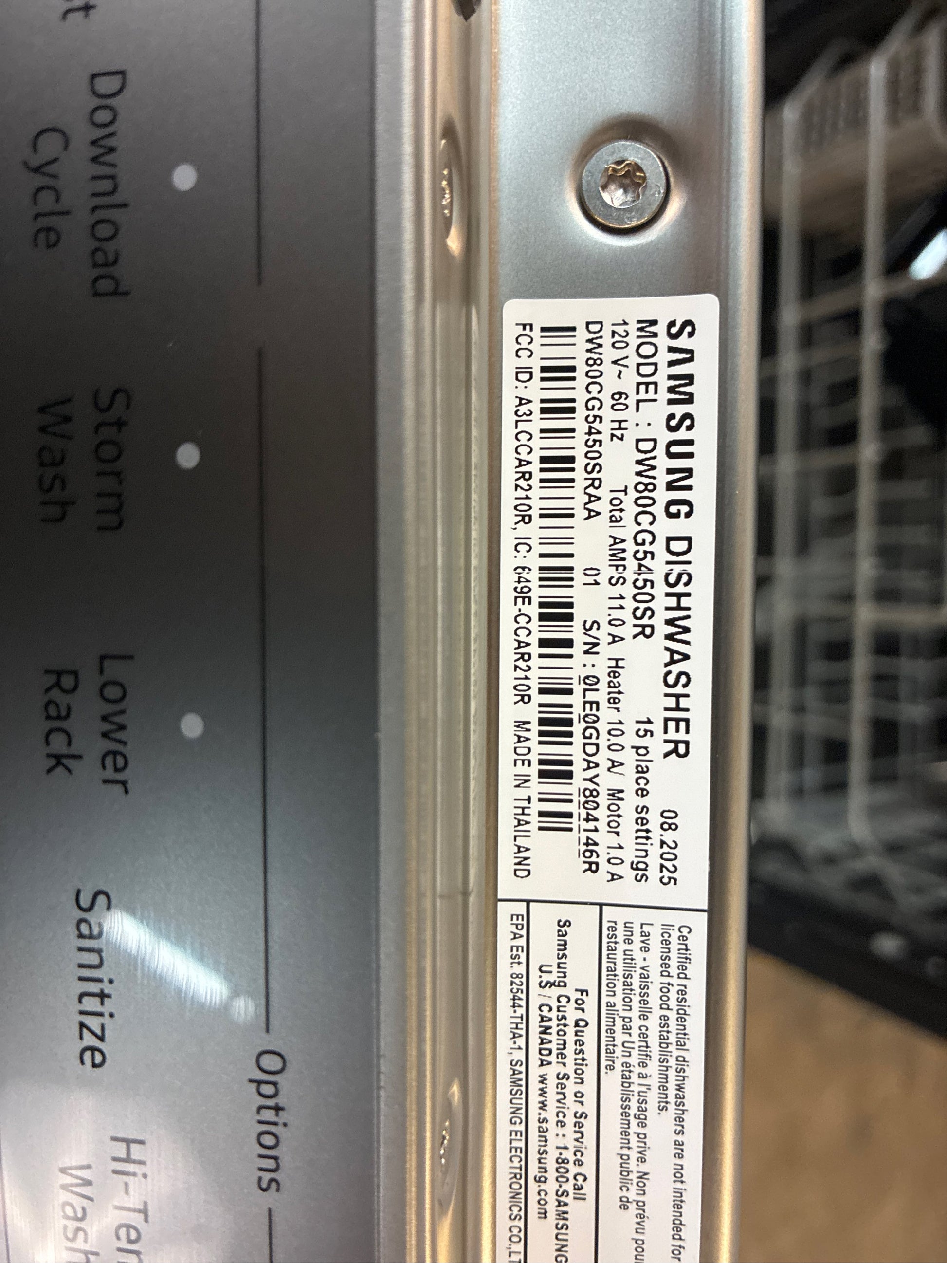 Powerful StormWash rotating jets let you skip the pre-rinse, delivering heavy duty cleaning from every angle. The AutoRelease Door delivers improved drying performance. Bespoke is Samsung s premium line of home appliances, leading the way in design, technology and connectivity. Bespoke Design: Create a kitchen that expresses your personal style StormWash System: Powerful rotating jets clean from every angle, even tough-to-reach spots AutoRelease Door: At end-of-cycle, the door automatically opens to circulate air and improve drying performance 3rd Rack: A 3rd rack provides up to 30% more space for other items, enabling you to load everything more efficiently SmartThings: SmartThings lets you remotely start, stop, or delay dishwashing cycles right from your phone Whisper Quiet Operation: With whisper quiet 46 dBA operation, you won't even know it's on ENERGY STAR Most Efficient: With an ENERGY STAR Most Efficient rating, you won't sacrifice performance or energy Fingerprint Resistant Finish: Fingerprint resistant, beautiful finish Downloadable Cycles: Download 4 additional cycles with your smartphone on the SmartThings App - Plastic, Pots & Pans, Baby Care, and Night cycles Appliance Color/Finish: Stainless steel Control Panel Color: Stainless Manufacturer Color/Finish: Fingerprint Resistant Stainless Steel Series Name: AutoRelease Actual Depth Excluding Handle (Inches): 27.313 Actual Depth Including Handle (Inches): 27.313 Actual Depth with Door Open (Inches): 57.563 Actual Width (Inches): 23.875 Adjustable Height: No Common Dishwasher Size: 24 inch Maximum Assembled Height (Inches): 33.875 Minimum Assembled Height (Inches): 33.875 Tub Height: Standard Weight (lbs.): 84 1/2-Rack Wash Option: Yes ADA Compliant: No Adjustable Upper Rack: Yes Advanced Sensor Wash Cycle: Yes Air Dry: Yes Appliance Type: Built-in dishwasher Automatic Temperature Control: Yes Bottle Wash Feature: No Child Safety Locks: Yes Condensation Dry: No Control Panel Style: Hidden (Top) Control Type: Electronic Custom Door Panel Included: No Customizable: No Cycle Status Lights: Yes Delay Wash: Yes Delay Wash Time (Hours): 24 Direct Feed: Yes Dishwasher Sound Level: Very quiet (43-50 dB) Drain Hose Included: Yes Fan Assisted Dry: No Fill Hose Included: No Fingerprint-Resistant: Yes Fold-Down Tines: Lower rack only Gentle Wash Cycle: Yes Handle Type: Pocket/recessed handle Hard Food Disposer: No Hard Food Filtration: Yes Heated/Hi-Temp Dry: Yes Heavy/Pots and Pans Cycle: Yes Hi-Temp Wash Option: Yes Hub Required: No Junction Box Included: No Lowe's Exclusive: No Mineral Assisted Dry: No Normal Cycle: Yes Number of Cycles: 7 Number of Place Settings: 15 Number of Wash Levels: 7 Pet Bowl Safe: Yes Power Cord Included: Optional - sold separately Pre-Soak Cycle: Yes Quick Rinse Cycle: Yes Quick Wash Cycle: Yes Rack Material: Nylon Rack Options: Culinary and utility racks Removable Silverware Basket: Yes Removable Top Rack: Yes Rinse Aid Dispenser Indicator: Yes Rinse and Hold Cycle: Yes Self-Cleaning Filter: Yes Sensor Wash Cycle: Yes Silverware Basket Covers: Yes Sound Rating (Decibels): 46 Steam Option: No Stemware Holder: Yes Targeted Scouring Module: Yes Targeted Silverware Wash Module: Yes Third Rack: Yes Tub Material: Stainless steel Unique/Exclusive Cycle(s): StormWash Voice Controlled: No Wash System: StormWash Wash System Type: Direct feed Water Filtration: Yes App Compatibility: Yes Bluetooth Compatibility: No Smart Compatible: Yes Wi-Fi Compatibility: Yes Works with Amazon Alexa: Yes Works with Android: Yes Works with Apple HomeKit: No Works with iOS: Yes Works with SmartThings: Yes Works with Sonos: No Works with the Google Assistant: Yes CA Residents: Prop 65 Warning(s): Yes ENERGY STAR Certified: Yes NSF Certified Sanitization Option: Yes Safety Listing: UL safety listing UNSPSC: 52141500