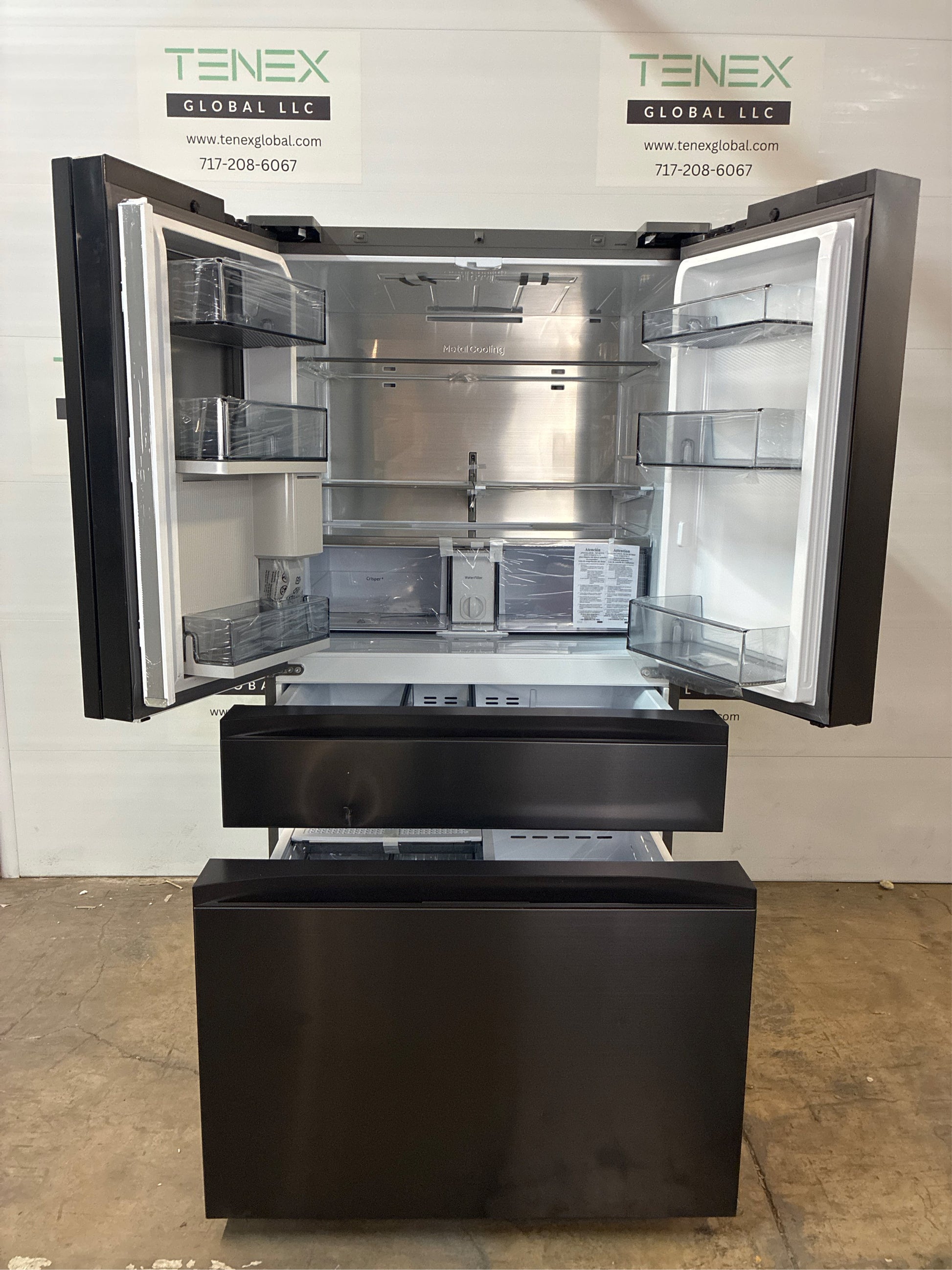 Samsung's bespoke 29 cu. ft. 4-door French door refrigerator features ai family hub with the industry's largest screen and changeable door panels. Ai vision inside automatically recognizes what's in your fridge, so you always know what's inside. Beverage center provides quick and easy access to refreshingly cold water, two ways. Ai vision inside accessible through the ai family hub utilizes ai-based algorithm. refrigerator Smart video screen changeable door panels are sold separately. As of April 2025, ai vision inside can recognize 37 food items like fresh fruits and veggies. Unrecognizable items may be listed as blank. Ai vision inside cannot identify or list food items in the fridge door bins or freezer. It recognizes food items based on deep learning models, which may be updated periodically to improve accuracy.. Appliance Category: Refrigerator. Appliance Series: Samsung Family Hub. Appliance Type: French Door Refrigerator. Built-In and Standard Type: French Door. Color - Appliance Cabinet: Black. Color - Door Handle(s): Matte Black Steel. Color/Finish: Matte Black Steel. Color/Finish Family: Matte Black. Defrost Type: Auto / Cycle. Dispenser Location: No Dispenser. Door Finish: Smooth. Energy Consumption (kWh/year): 663. Energy Efficiency Tier Rating: Tier III. Freezer Capacity (cu. ft.): 9 cu ft. Freezer Door Type: Pull Out Drawer. Freezer Features: LED Light Type. Freezer Type: Bottom Door Freezer. General Features: Door Alarm,LED Light Type. Handle Type: Recessed Handle. Hardware Color/Finish: Matte Black Steel. Hardware Color/Finish Family: Matte Black. Ice Maker Features: Ice Maker. Ice/Water Dispenser: Beverage Center. Indoor/Outdoor: Indoor. Installation Depth: Standard Depth. Installation Type: Free Standing. Number of Doors: 4 Door. Number of Drawers: Double Drawer. Number of Freezer Baskets/Bins: 3 Baskets/Bins. Number of Freezer Shelves: No Shelves. Number of Refrigerator Shelves: 3 Shelves. Operational Features: LED Controls. Overall Product Height (in.): 70 in. Product Weight (lb.): 355 lb. Refrigeration Dispenser Features: Dual Ice Maker. Refrigerator Capacity (cu. ft.): 16.5 cu ft. Returnable: Non-Returnable. Shelf Material - Freezer: No Shelf. Shelf Material - Refrigerator: Glass. Storage Features: Crisper Drawer,Gallon Door Storage. Temperature Control Type: Internal Digital. Total Capacity (cu. ft.): 28.6 cu ft. Water Filter Replacement Model#: HAF-QIN. Certifications and Listings: Energy Star. Depth (Excluding Handles) (in.): 34.25 in. Depth (Including Handles) (in.): 34.25 in. Depth (Less Door) (in.): 29.37 in. Depth With Door Open 90 Degrees (in.): 53.25 in. Height to Top of Door Hinge (in.): 70.25 in. Height to Top of Refrigerator Case (in.): 68.87 in. Height to Top of Refrigerator Door (in.): 68.87 in. Product Depth (in.): 34.25 in. Product Height (in.): 70.25 in. Product Width (in.): 35.75 in. Refrigerator Width (in.): 35.75 in. Depth (Excluding Handles) (in.): 34.25 in. Total Capacity (cu. ft.): 28.6 cu ft. Overall Product Height (in.): 70 in. Installation Depth: Standard Depth. No of Doors: 4 Door. Ice Maker Features: Ice Maker. Height to Top of Refrigerator Case (in.): 68.87 in. Dispenser Features: Dual Ice Maker