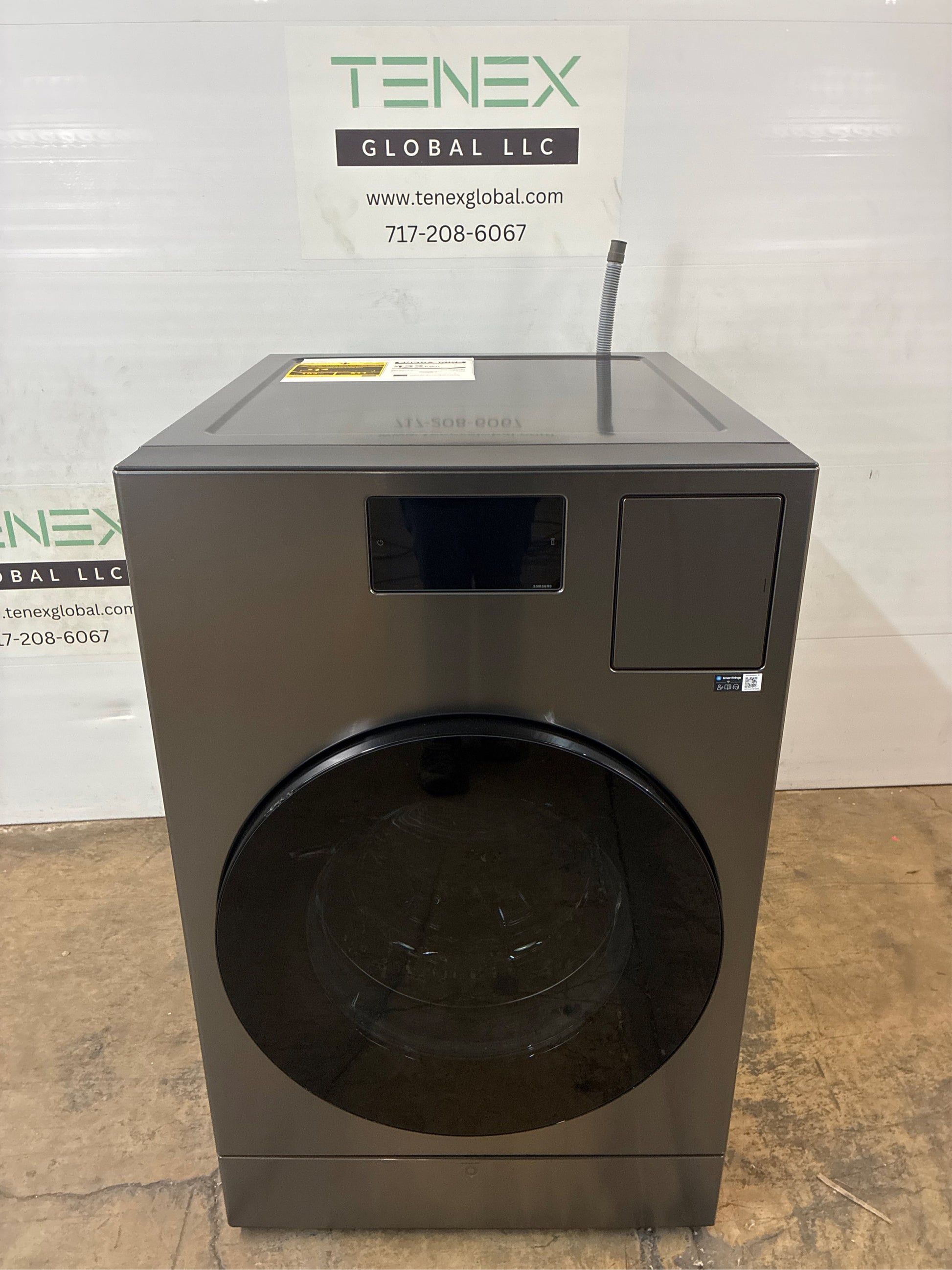 The Bespoke AI Laundry Combo machine is the industry's fastest and largest All-in-One Combo washer & dryer.* It washes and dries clothes in one machine in 98 minutes with the Super Speed cycle.** *Among W/D Combo with heat pump dryers, based on a 10 LB. DOE load.**Based on using a Super Speed cycle with an 10lb DOE load (cotton 50% + polyester 50%). Dryer only: with a Residual Moisture Content of 48% after a wash cycle.. Amperage (A): 15 A. Appliance Series: Samsung BESPOKE. Appliance Type: Washer & Dryer Combo. Capacity - Dryer (cu. ft.): 5.3. Color/Finish: Dark Steel. Color/Finish Family: Stainless Look. Control Type: Digital. Door Material: Glass. Door Style: Left Swing. Dry Cycles: Active Wear,Air Fluff,Auto Dry,Bedding,Delicates,Heavy Duty,Permanent Press,Sanitize,Timed Dry,Towels and Sheets,Wool. Dryer Door Style: Left Swing. Dryer Features: Adjustable End-of-Cycle Signal,Adjustable Legs,Anti Vibration,Automatic Temperature Control,Condenser,Control Sounds On/Off,Delay Start,Digital Cycle Countdown,Door Window,Energy Saver,Front Control,Heat Pump,Interior Light,Lint Filter,Moisture Sensor,Remote Diagnostics,Sensor Dry,Small Load,Spin Speed Option,Timed Dry,Wi-Fi Enabled. Dryer Fuel Type: Electric. Energy Consumption (kWh/year): 103. Energy Efficiency Tier Rating: Tier III. Exhaust Vent Location: No Exhaust Vent. Fuel Type: Electric. Hardware Color/Finish: Dark Steel. Hardware Color/Finish Family: Stainless Look. Included: Power Cord. Lint Filter Location: Front. Maximum Spin Speed (RPM): 1200. Number of Drying Cycles: 4. Number of Drying Temperatures: 4. Number of Rinse Cycles: 23. Number of Rinse Temperatures: 5. Number of Wash Cycles: 23. Number of Wash Speeds: 5. Number of Wash Temperatures: 5. Power Options: Plug-in. Product Weight (lb.): 317.5 lb. Remote Access: Remote Access. Requires Hub?: No Hub Required. Returnable: Non-Returnable. Smart Home: Smart Home Enabled. Smart Home Protocol: Wi-Fi. Steam Function: Steam. Tub/Drum Material: Stainless Steel Drum. Vent Type: Ventless. Voice Control Hub Required: Voice Control via Proprietary App. Voltage (volts): 120. Wash Cycles: Active Wear,Bedding,Cold,Colors,Delicates,Heavy Duty,Normal,Permanent Press,Rinse & Spin,Sanitize,Small Load,Speed Wash,Steam,Towels and Sheets,Whites. Washer Dispensers: Bleach,Fabric Softener,Liquid Detergent. Washer Features: Adaptive Fill,Anti Vibration,Automatic Detergent Dispenser,Automatic Temperature Control,Control Lock,Control Sounds On/Off,Cycle Status Indicator,Delay Start,Door Window,End-Of-Cycle Signal,Front Control,High-Efficiency Detergent Required,Interior Light,Remote Diagnostics,Water Heater,Wi-Fi Enabled. Works With: Alexa, Google Assistant, Homey, Samsung SmartThings. Certifications and Listings: Energy Star. Capacity - Washer (cu. ft.): 5.3. Depth With Door Open 90 Degrees (in.): 56.3 in. Door Opening Height (In.): 23.46. Door Opening Width (In.): 23.48. Product Depth (in.): 34.5 in. Product Height (in.): 43.75 in. Product Width (in.): 27 in. Capacity (cu. ft.): 5.3. Voltage (volts): 120. Features: Lint Filter. Features: Sensor Dry. Vent Type: Ventless. Features: Energy Saver. Features: Interior Light. Features: Timed Dry