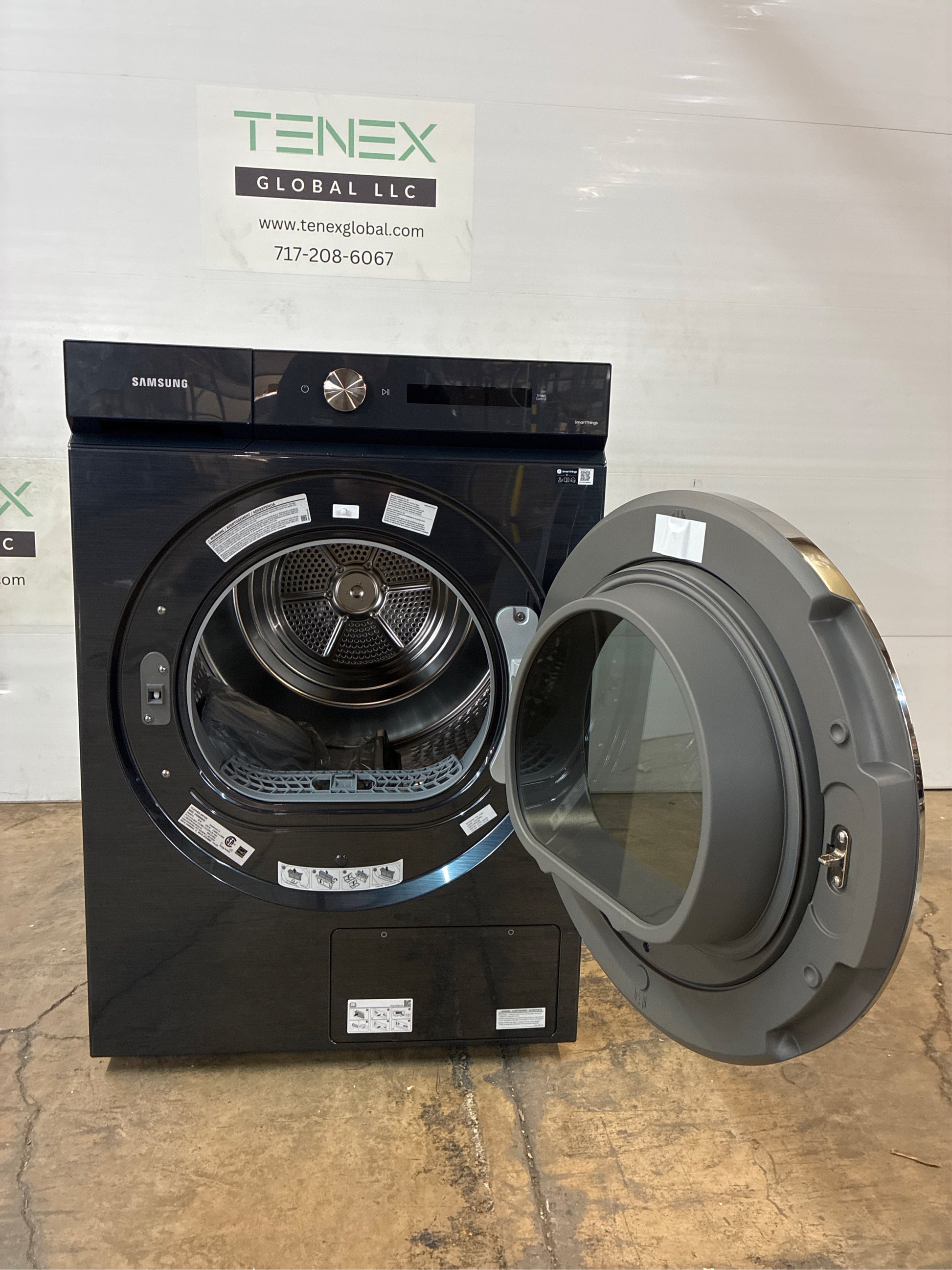 Samsung's Bespoke Ultra Capacity Ventless Hybrid Heat Pump Dryer uses up to 50% less energy. It offering a more efficient, cost-effective, and gentle way to dry your clothes. It has a sleek, flat-panel design, and is equipped with AI Optimal Dry, which uses 9 sensors to automatically sense temperature and humidity inside the drum.. Amperage (A): 14 A. Appliance Category: Dryer. Appliance Series: Samsung BESPOKE. Appliance Type: Heatpump Dryer. Capacity - Dryer (cu. ft.): 7.8. Color/Finish: Brushed Navy. Color/Finish Family: Blue. Control Type: Electro-Mechanical. Door Material: Tempered Glass. Door Shape: Round Door. Door Style: Reversible. Dry Cycles: Active Wear,Air Fluff,Bedding,Delicates,Heavy Duty,Permanent Press,Rack Dry,Sanitize,Timed Dry,Towels and Sheets,Wool,Wrinkle Free. Dryer Drum Material: Stainless Steel Drum. Dryer Features: Four-Way Venting,Interior Light,Lint Filter,Rack,Sensor Dry,Wi-Fi Enabled. Dryer Fuel Type: Gas. Hardware Color/Finish: Brushed Navy. Hardware Color/Finish Family: Navy. Included: No Additional Items Included. Lint Filter Location: Front. Matching Washer Type: Front Load Matching. Number of Drying Cycles: 21. Number of Drying Temperatures: 4. Pedestal Model#: WE502ND. Power Options: Plug-in. Product Weight (lb.): 172 lb. Remote Access: Remote Access. Requires Hub?: No Hub Required. Returnable: Non-Returnable. Smart Home: Smart Home Enabled. Smart Home Protocol: Wi-Fi. Stackable: Stackable. Stacking Kit Model#: SKK-9MCD. Steam Function: Steam. Vent Type: Ventless. Voice Control Hub Required: Alexa via Samsung SmartThings Hub. Voltage (volts): 240. Works With: Alexa, Alexa, Google, Homey, Samsung SmartThings. Certifications and Listings: Energy Star. Depth With Door Open 90 Degrees (in.): 53.1 in. Door Opening Height (In.): 23.46. Door Opening Width (In.): 23.48. Product Depth (in.): 31.44 in. Product Height (in.): 38.75 in. Product Width (in.): 27 in. Capacity (cu. ft.): 7.8. Voltage (volts): 240. Features: Lint Filter. Features: Sensor Dry. Vent Type: Ventless. Appliance Type: Heatpump Dryer. Features: Interior Light. Width (in.): 27 in