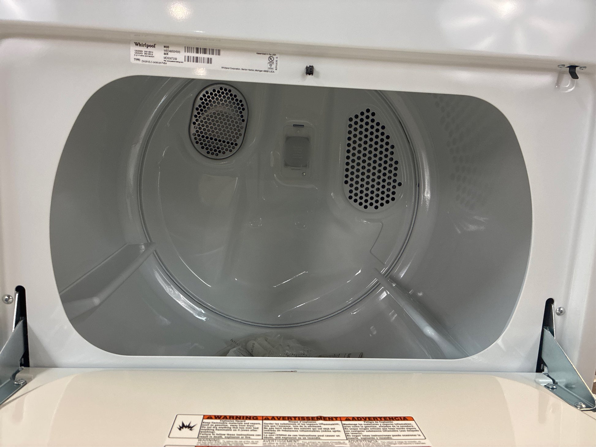 Care for the whole family's fabrics with this large capacity top load dryer. Choose between the AUTODRY system, which helps prevent overdrying, or Timed Dry, which lets you manually control your drying schedule. Help keep wrinkles from setting in with the WRINKLE SHIELD option and easily transfer loads from the washer to this automatic dryer with a wide-opening hamper door.. Help prevent overdrying with the AUTODRY drying system. Pairs best with Washer WTW4955HW. Help keep wrinkles from setting with the WRINKLE SHIELD option. Help prevent overdrying with the AUTODRY drying system that senses when clothes have reached the right moisture content and stops the cycle. Help keep wrinkles from setting into your clean clothes with intermittent tumbling after the dryer cycle ends with the WRINKLE SHIELD option. Easily transfer loads from the washer to the dryer and from the dryer to the laundry basket without worrying about clean clothes falling on the floor with this wide-opening door. Take control of your time. For those occasional times that damp load needs a little extra dry time or when using a drying rack, set the control and you can get your fabrics dried on your schedule. Choose between three drying temperatures for fabric care that fits your family's needs. With a 7.0 cu. ft. capacity dryer drum, there's plenty of room to easily handle large loads and bulky items. Designed, Engineered and Assembled in the United States. 3 Temperature Settings: High, Low, Medium. 1/3 HP Motor Horsepower. 14 Dryer Cycles. Automatic Dry Control. End of Cycle Signal. Hamper Door Style. Click here to shop for more Whirlpool Appliances . Amperage (A): 30 A. Appliance Category: Dryer. Appliance Series: Not Applicable. Appliance Type: Electric Dryer. Capacity - Dryer (cu. ft.): 7. Color/Finish: White. Color/Finish Family: White. Control Type: Electro-Mechanical. Door Material: Metal. Door Shape: Square Door. Door Style: Hamper. Dry Cycles: Air Fluff,Auto Dry,Cool Down,Damp Dry,Delicates,Sensor Dry,Timed Dry,Wrinkle Free. Dryer Drum Material: Powder-Coated Steel Drum. Dryer Features: Adjustable End-of-Cycle Signal,Automatic Temperature Control,Interior Light,Lint Filter,Moisture Sensor,Timed Dry. Dryer Fuel Type: Electric. Exhaust Vent Location: Rear. Hardware Color/Finish: Black. Hardware Color/Finish Family: White. Included: No Additional Items Included. Lint Filter Location: Top. Matching Washer Type: Top Load Matching. Number of Drying Cycles: 14. Number of Drying Temperatures: 3. Pedestal Model#: None. Product Weight (lb.): 109 lb. Stackable: Not Stackable. Stacking Kit Model#: None. Steam Function: No Steam. Vent Type: Vented. Voltage (volts): 240. Certifications and Listings: No Certifications or Listings. Depth With Door Open 90 Degrees (in.): 42 in. Door Opening Height (In.): 13.75. Door Opening Width (In.): 25. Product Depth (in.): 28.25 in. Product Height (in.): 43 in. Product Width (in.): 29 in